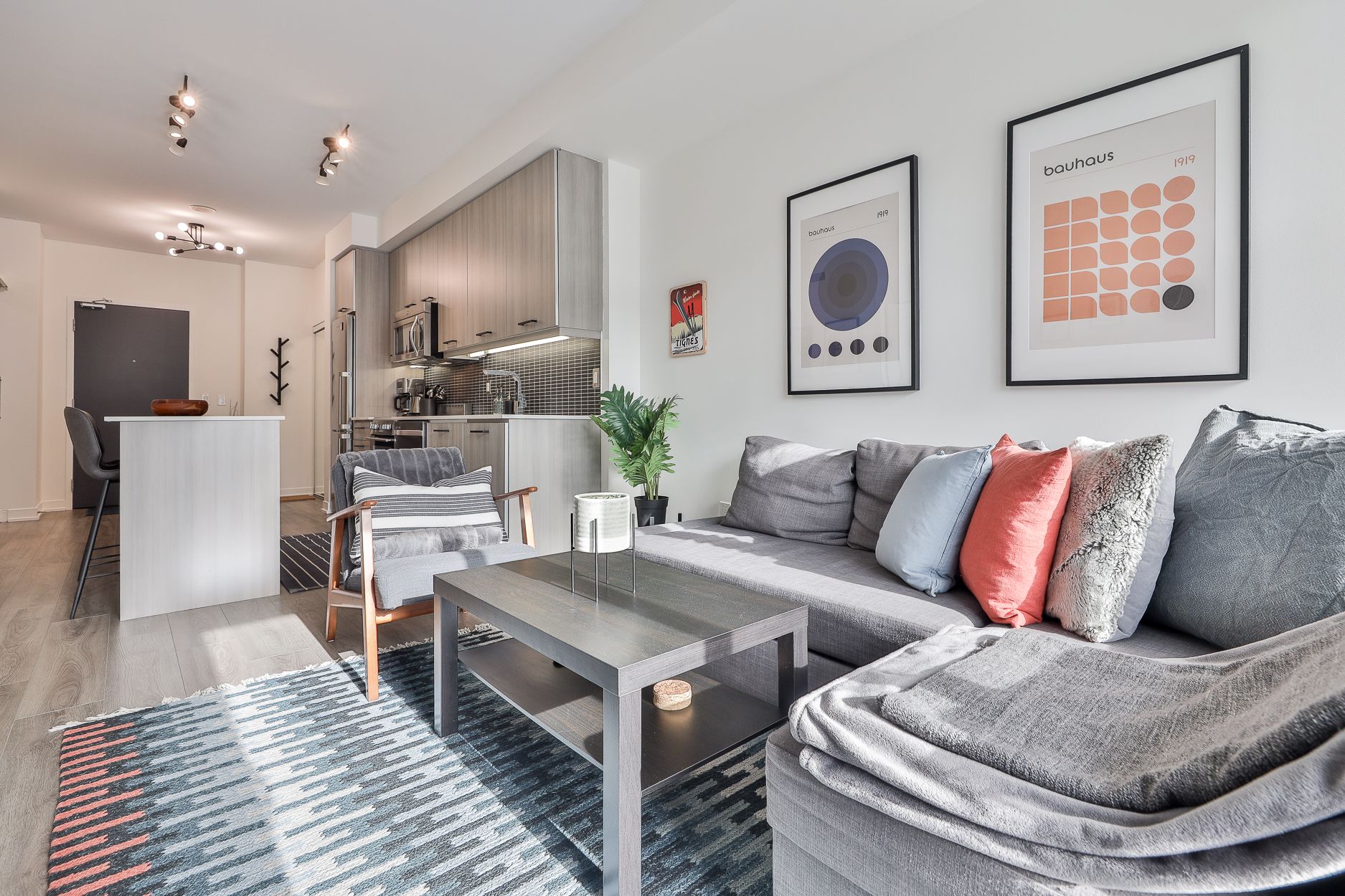 • Bright living area with high ceilings and room for real furniture.