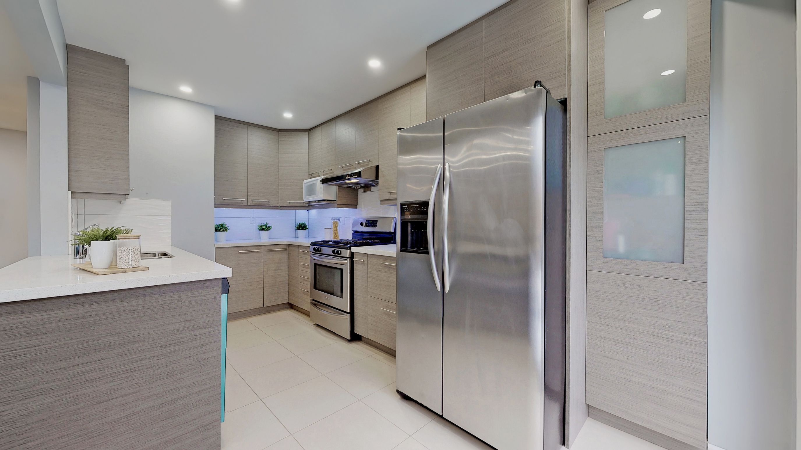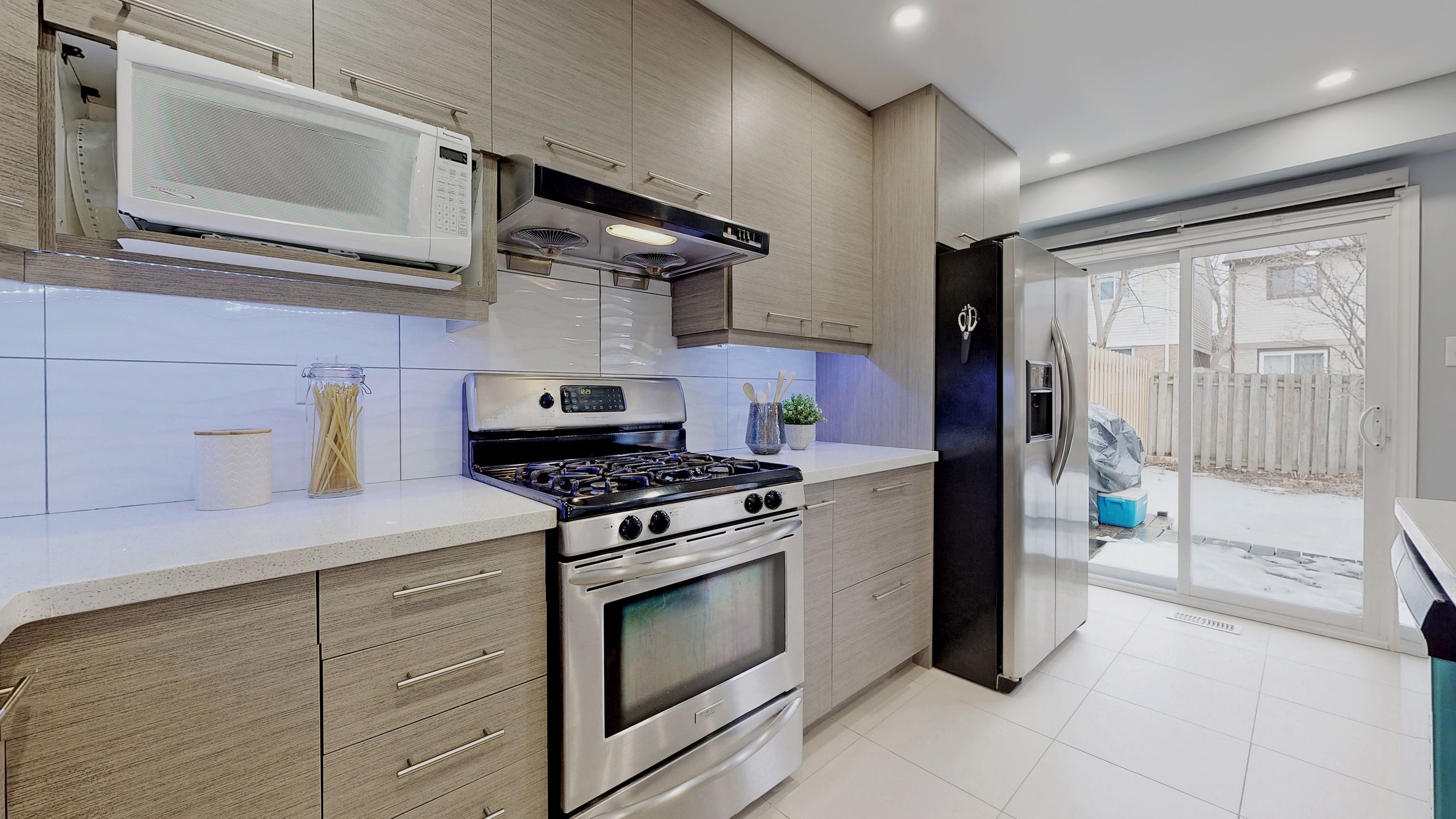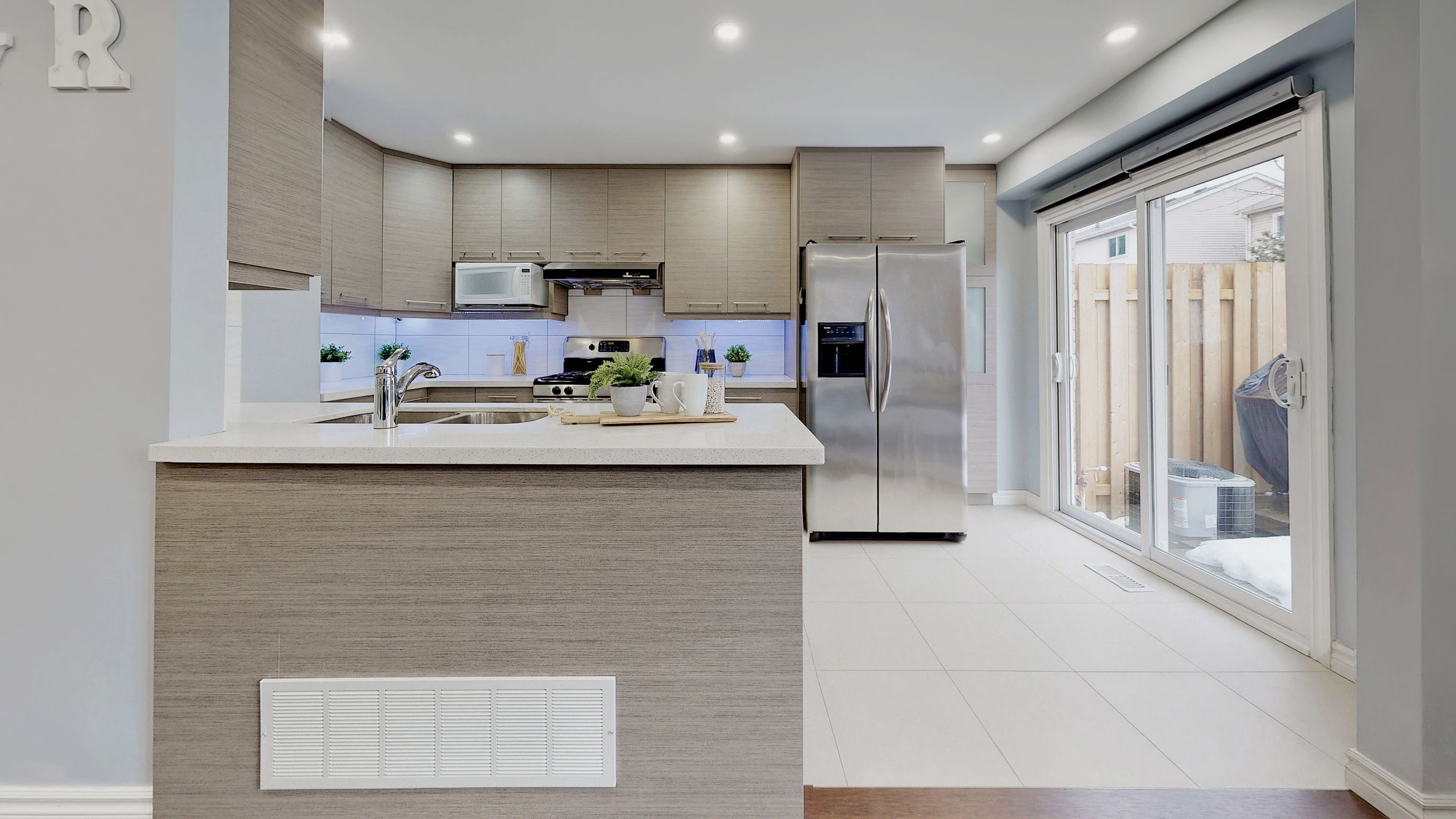 • Open concept kitchen with upgraded quartz counters and stainless steel appliances.
