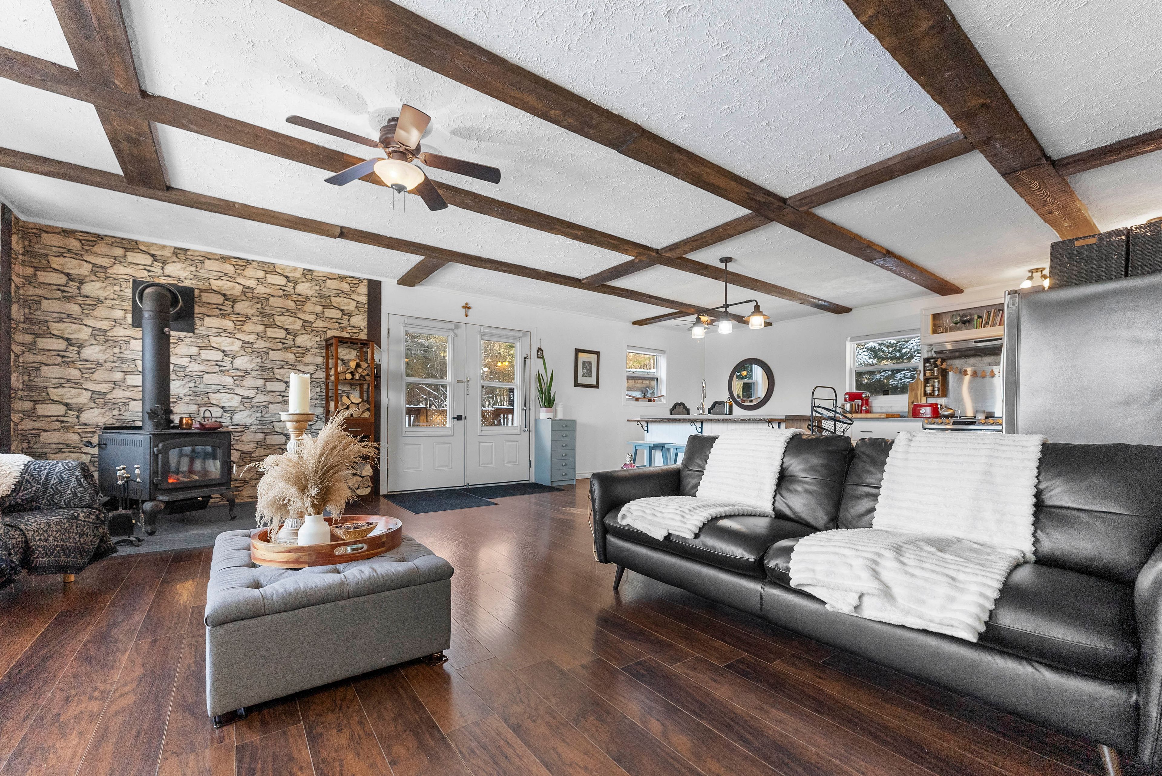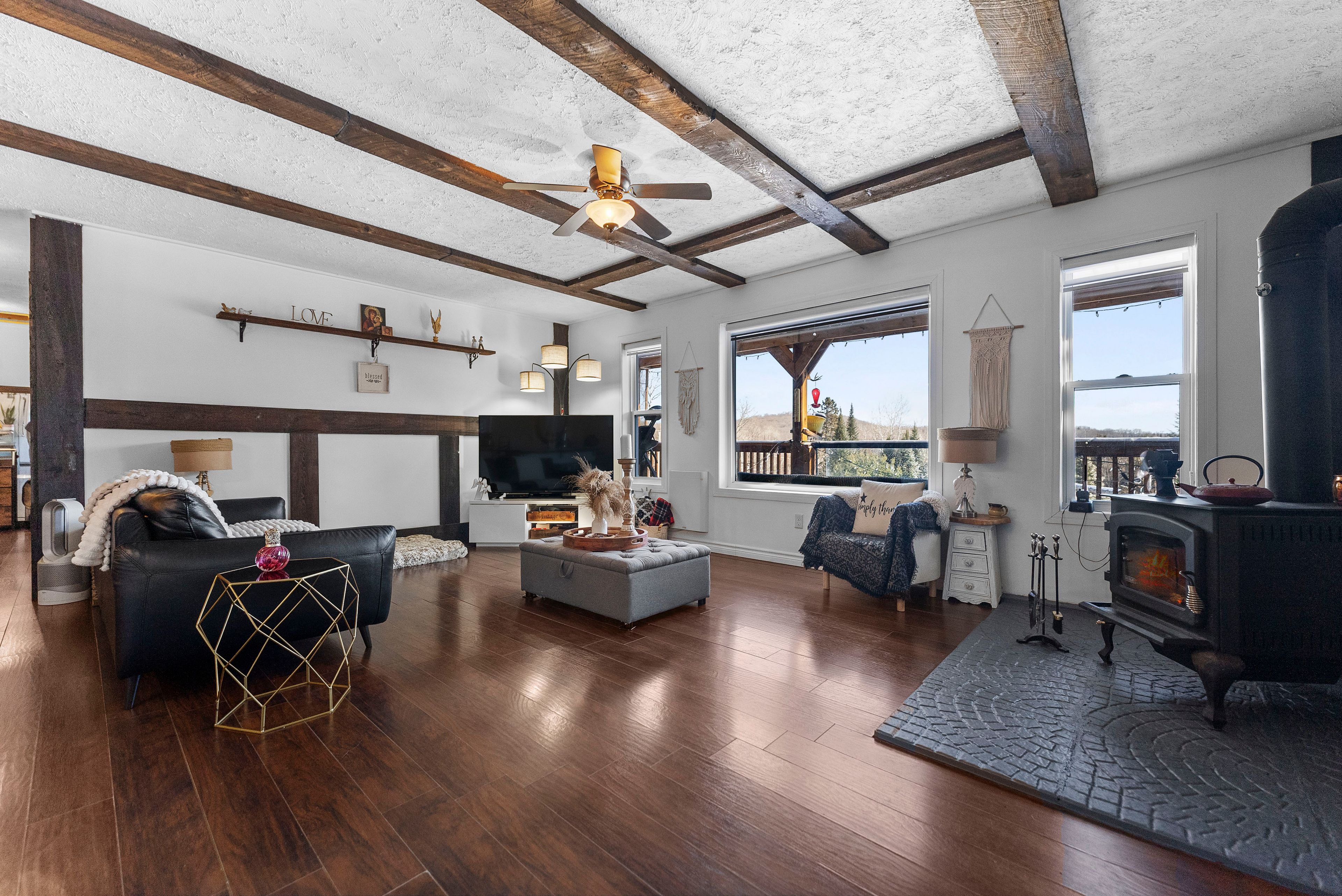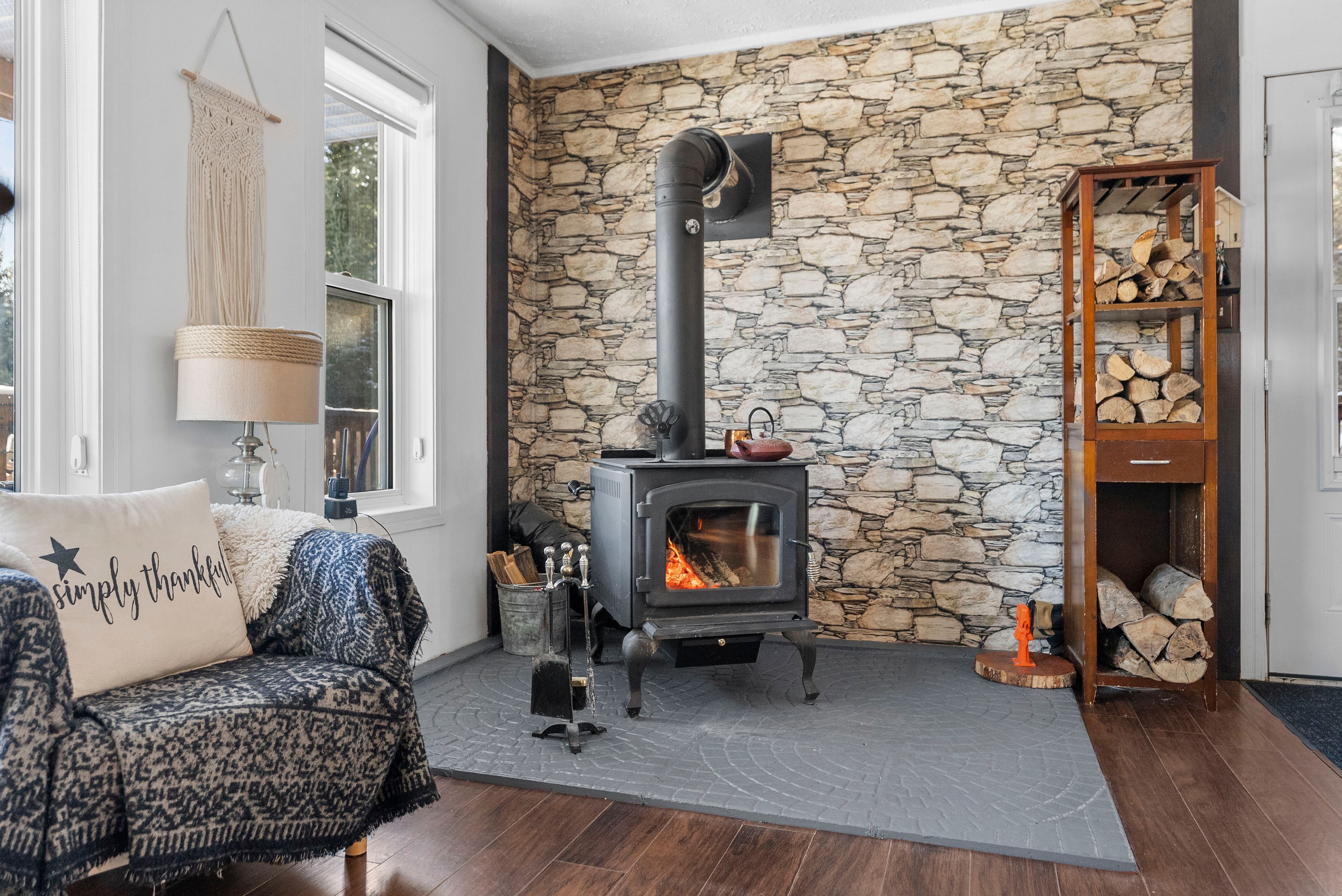 • Cozy living room featuring a wood-burning airtight stove.