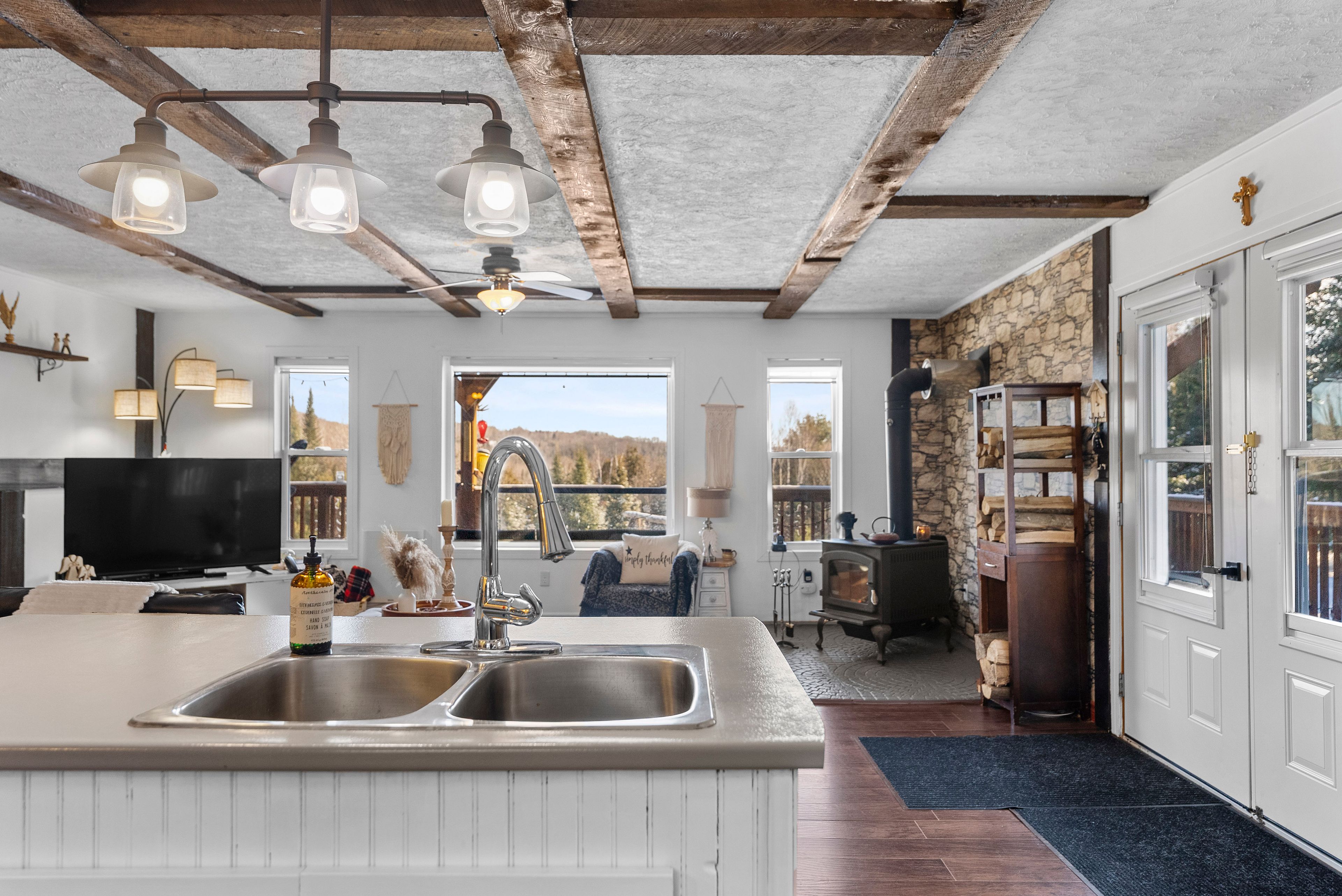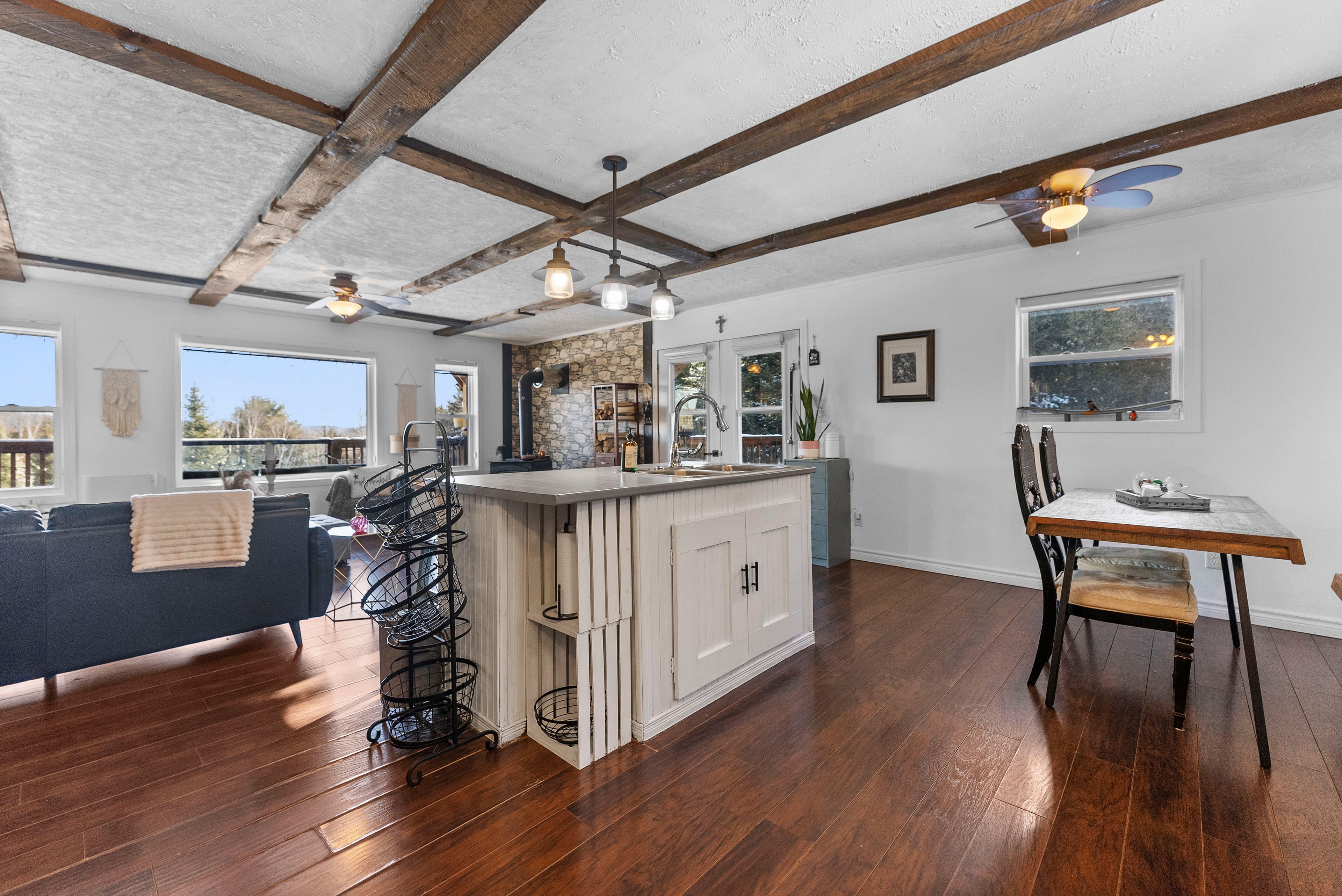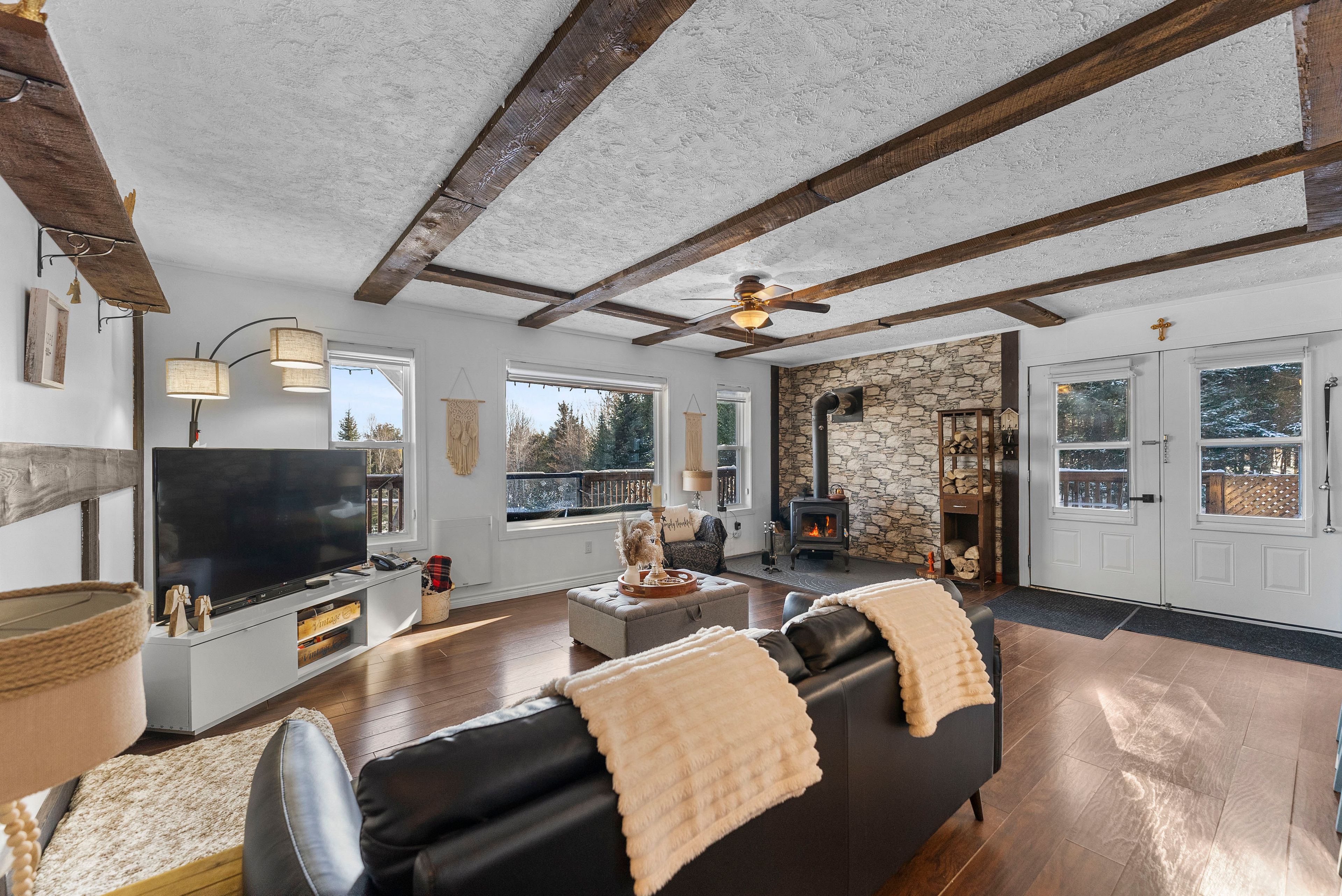 • Cozy living room featuring a wood-burning airtight stove.