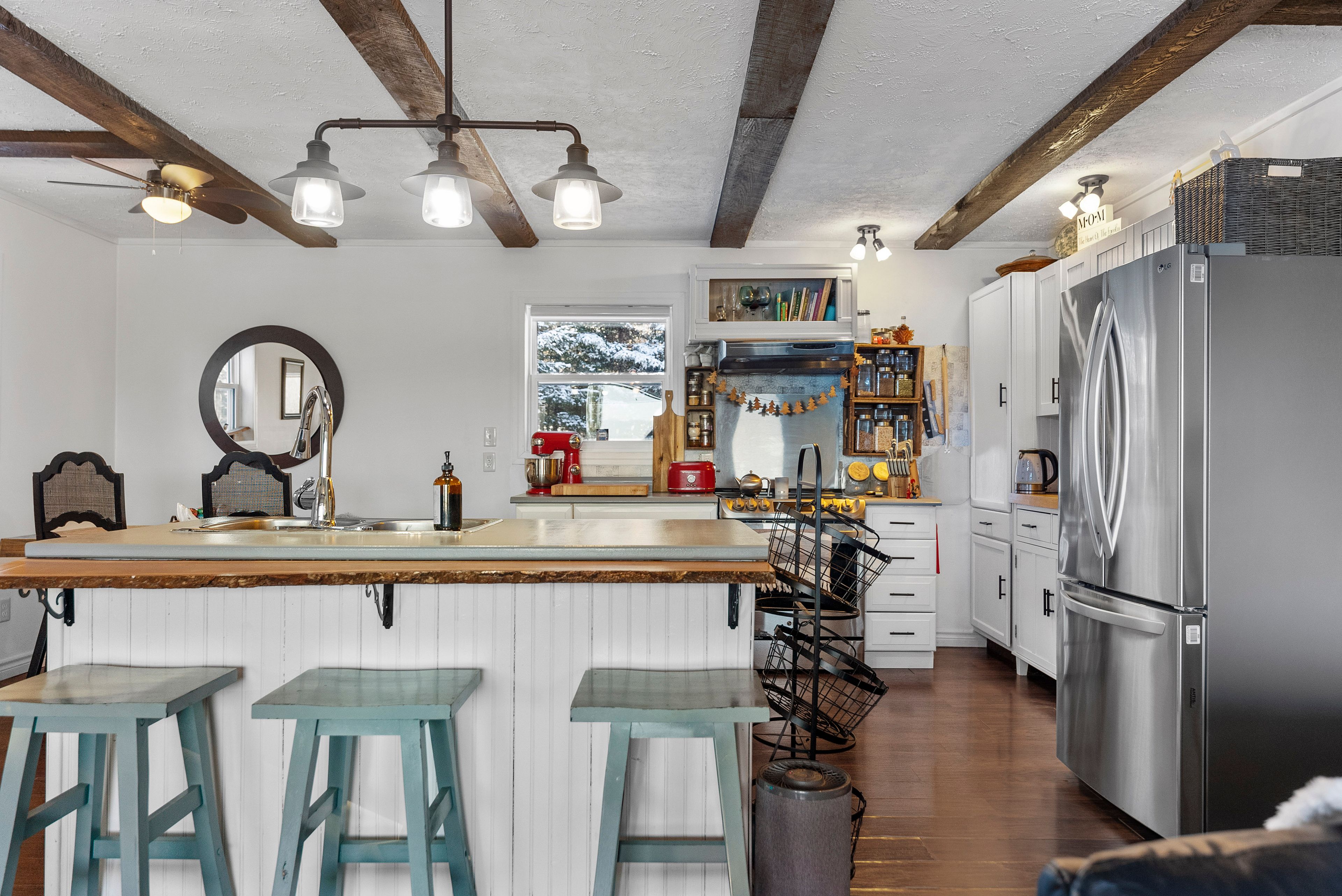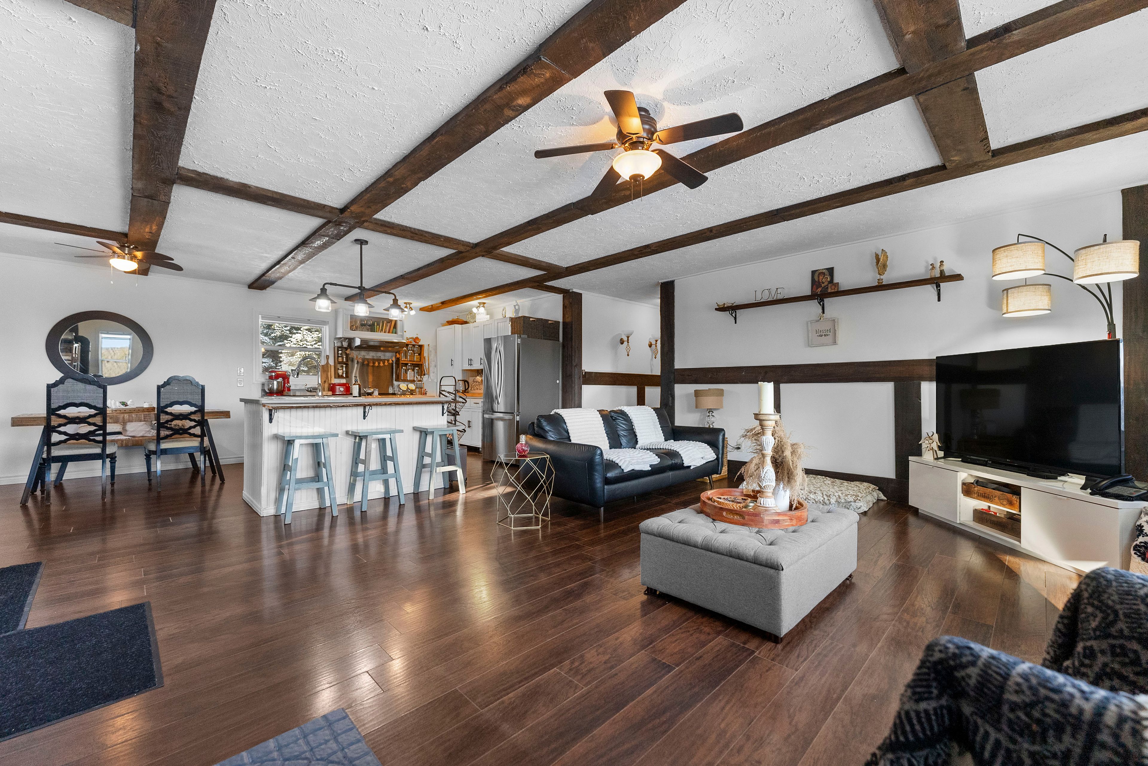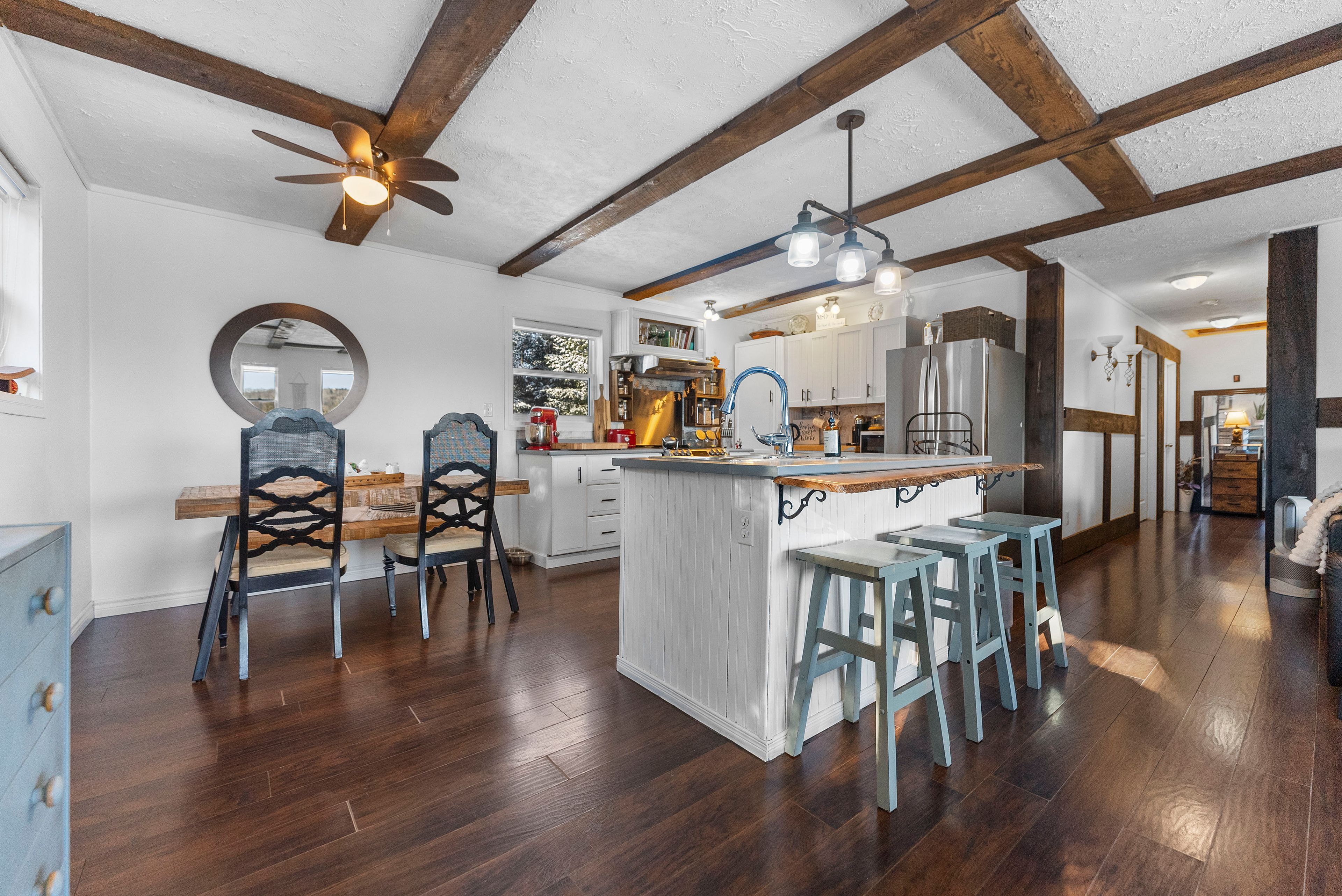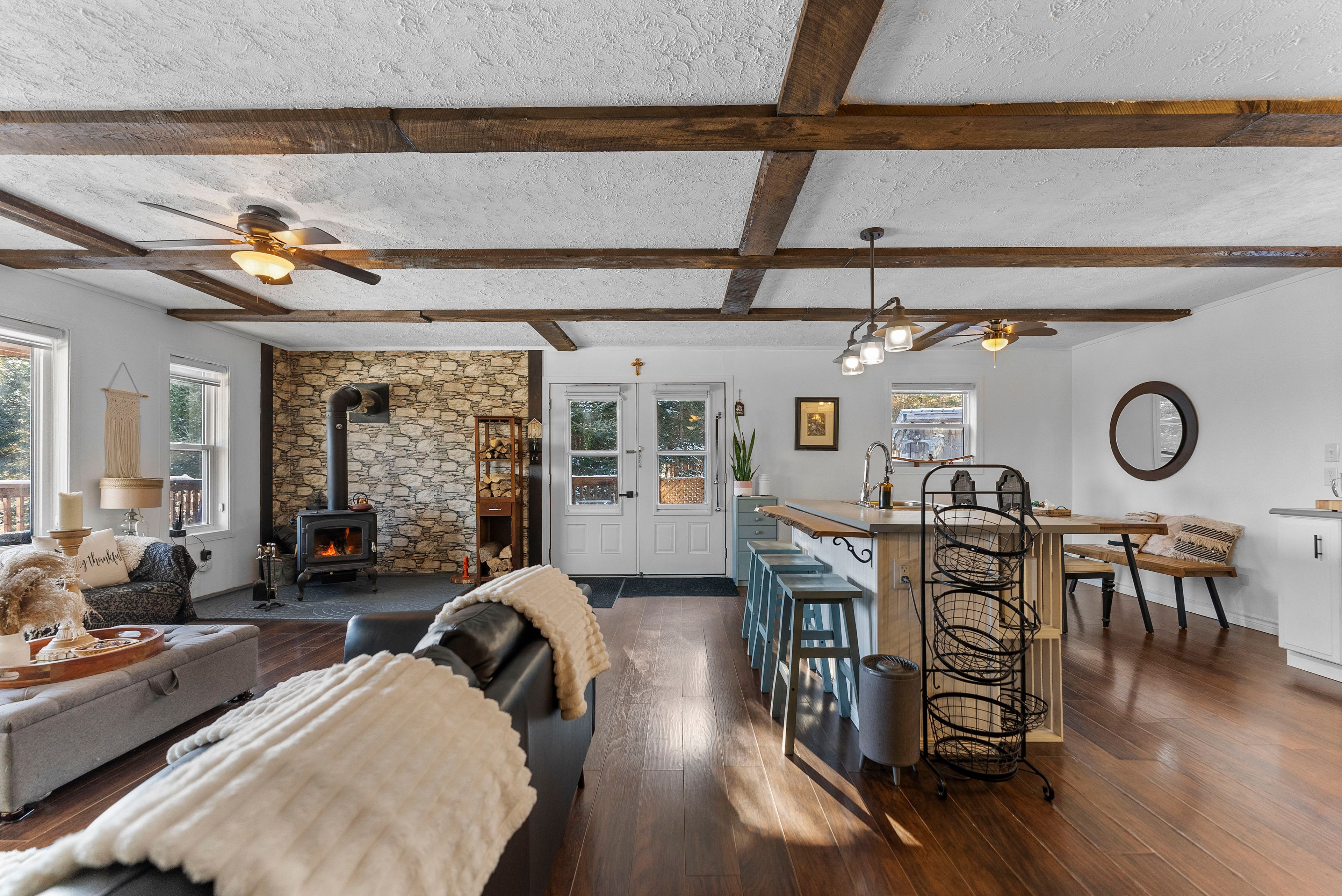 Affordable mountain retreat with 2 private acres, pond & bunkie! Escape to your own slice of paradise with this 2015-built 2-bedroom bungalow set on an ultra-private, landscaped 2-acre lot surrounded by rolling hills and breathtaking mountain views. Perfect as a full-time country home, vacation getaway, or rural retirement retreat, this property offers unbeatable value and timeless charm. From the moment you arrive, you'll be enchanted by the spring-fed pond, hand-assembled historic stone fences, and meticulously landscaped grounds a setting that feels like a page from a storybook. The natural board-and-batten siding adds rustic beauty that blends perfectly with the surrounding nature. Step inside to discover a bright, open-concept layout where the chefs dream kitchen boasts an oversized island, ideal for cooking, entertaining, or gathering with loved ones. The living room features a wood-burning airtight stove, creating a warm and romantic ambiance on cool evenings. Unwind in the clawfoot soaker tub before retreating to the spacious primary bedroom. Designed with efficiency in mind, the home is heated by wood plus supplemental electric wall units. A heated detached office or bunkie with power offers the perfect setup for remote work or extra guest space. Cell service is reliable and boosted for signal strength, and starlink or xplornet internet options are available. Located just minutes from local amenities, with school bus pickup nearby, this property combines peaceful seclusion with practical convenience. Whether you dream of affordable country living, a private cottage escape, or a hobby-friendly retreat, this stunning property offers endless possibilities and will capture your heart the moment you see it.
