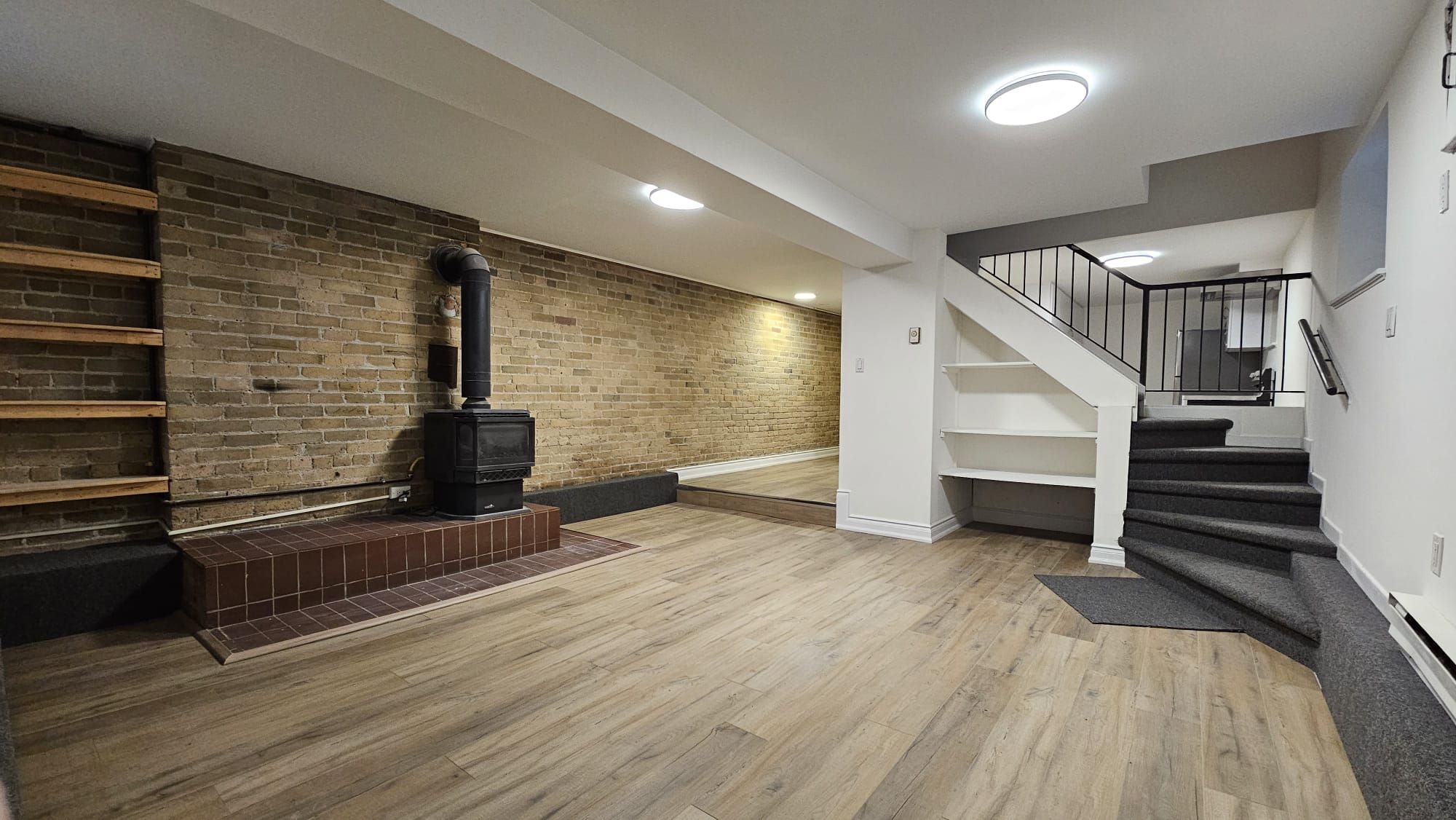 • Large living area features exposed brick and decorative fireplace.