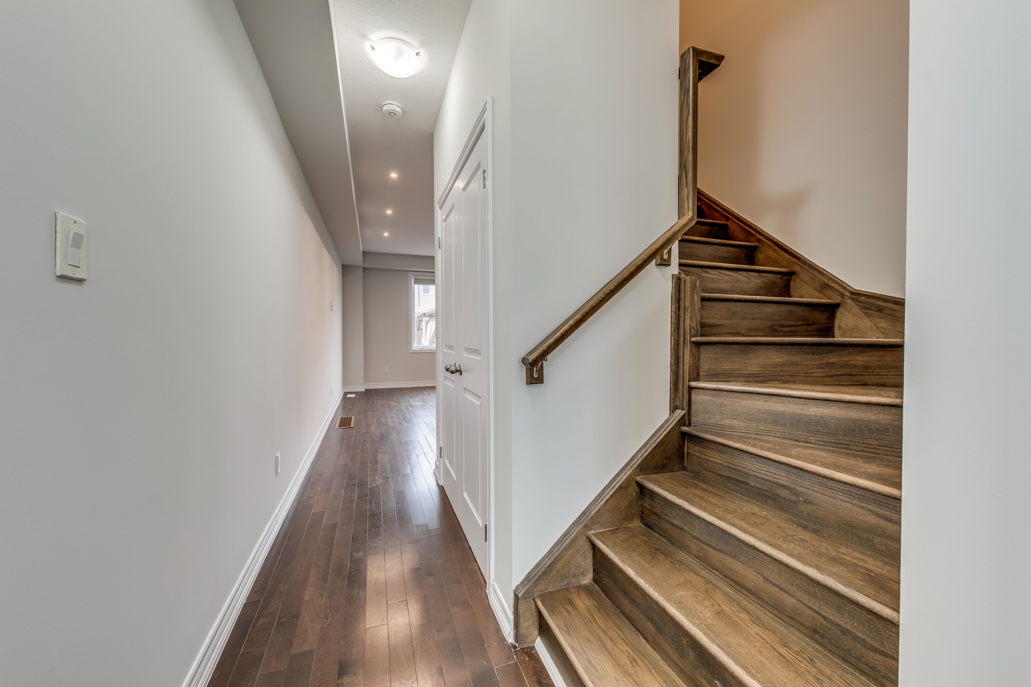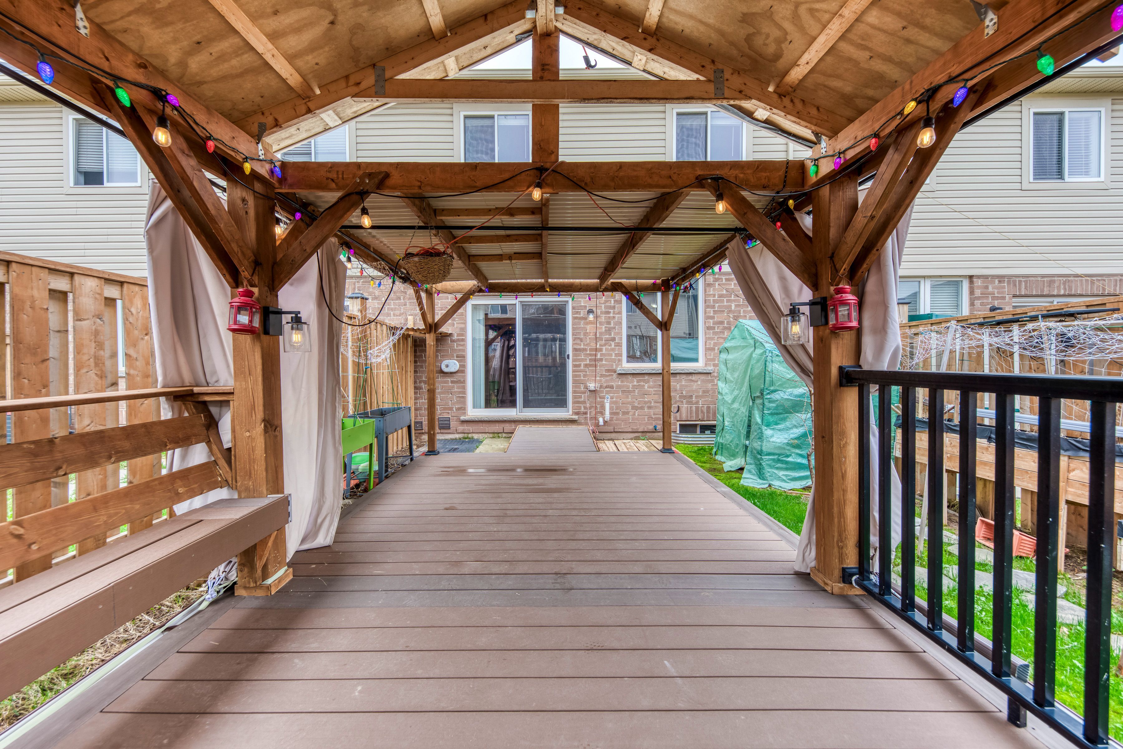 Beautifully upgraded 3-bedroom, 2. 5-bath carpet-free freehold townhouse featuring a bright, spacious open-concept layout with high ceilings, hardwood floors on the main and second levels, pot lights in the kitchen and living area, and freshly professionally finished natural décor paint throughout. Modern kitchen with island, quartz countertops, backsplash, upgraded cabinetry, stainless steel appliances, gas line-ready stove, and water line for ice-making fridge. The spacious primary bedroom offers an upgraded 5-piece ensuite with double sinks, a separate soaker tub, and a stand-up shower. The standout "muskoka in the city" backyard features a large custom-built solid deck with composite grooved boards and a beautifully designed gazebo with privacy curtains and extensive party lighting, perfect for entertaining rain or shine. Fully fenced yard with vegetable garden and a unique apple tree producing four varieties on one tree, two growing peach-producing trees purchased directly from the farm, plus a backyard solar panel system. Convenient side-door access to oversized 1. 5 car garage with total parking for 3 vehicles. Prime location just 5 minutes to lake ontario with easy access to costco, winona park, winona crossing shopping centre, fifty point conservation area, schools, go transit, hwy qew & 403, public transit, and all amenities. Pictures are virtually staged. A great place to call home.