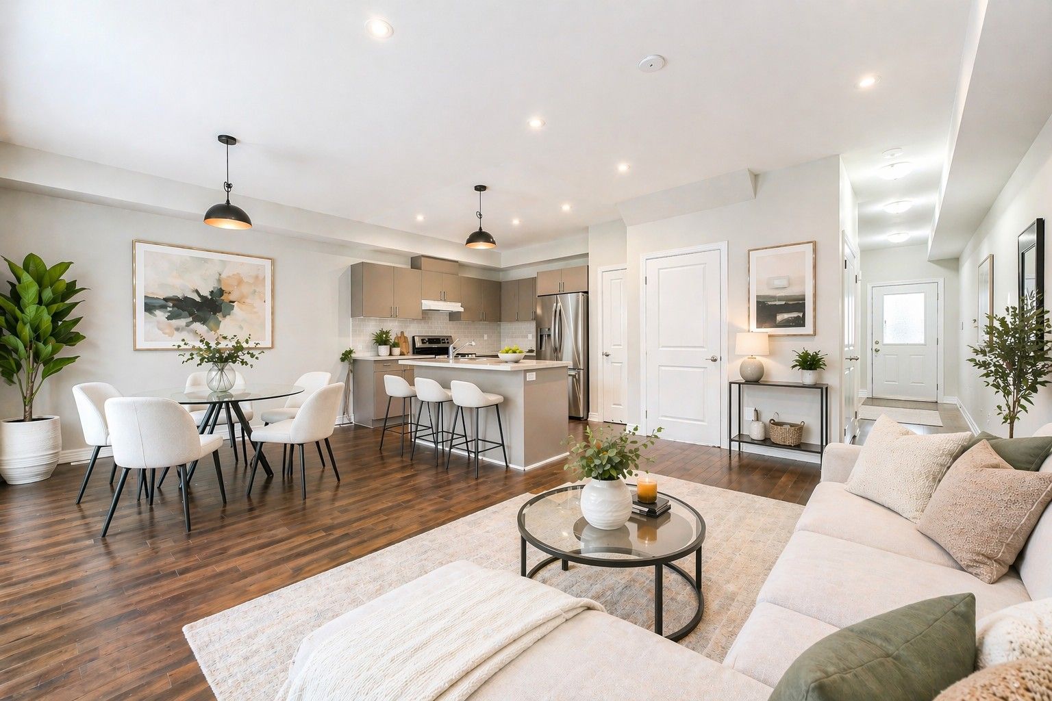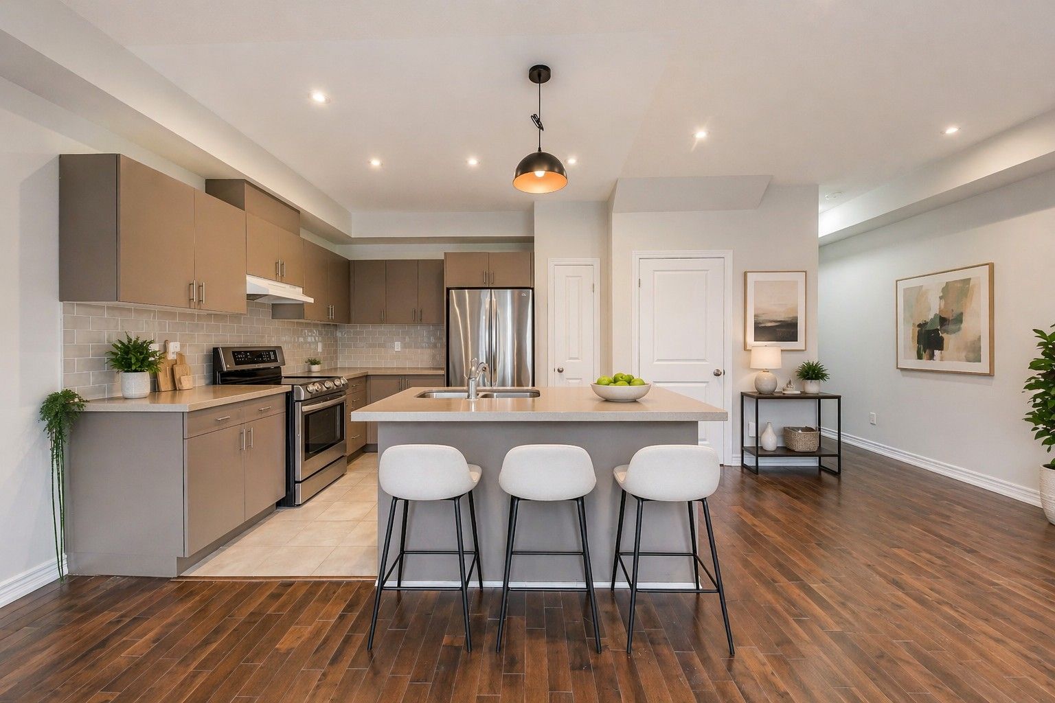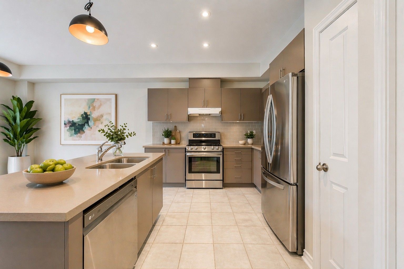• Modern kitchen equipped with quartz countertops and stainless steel appliances.