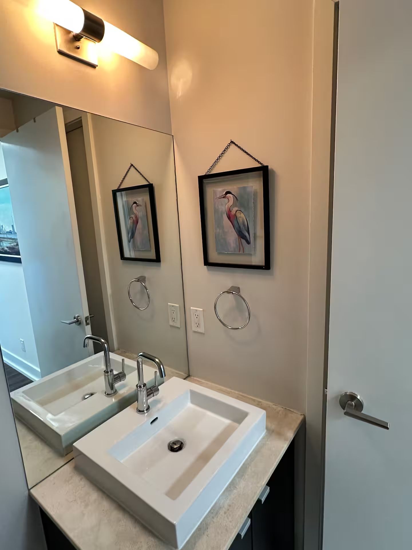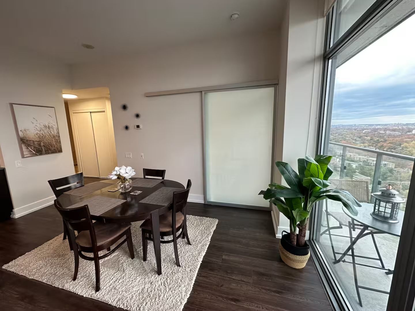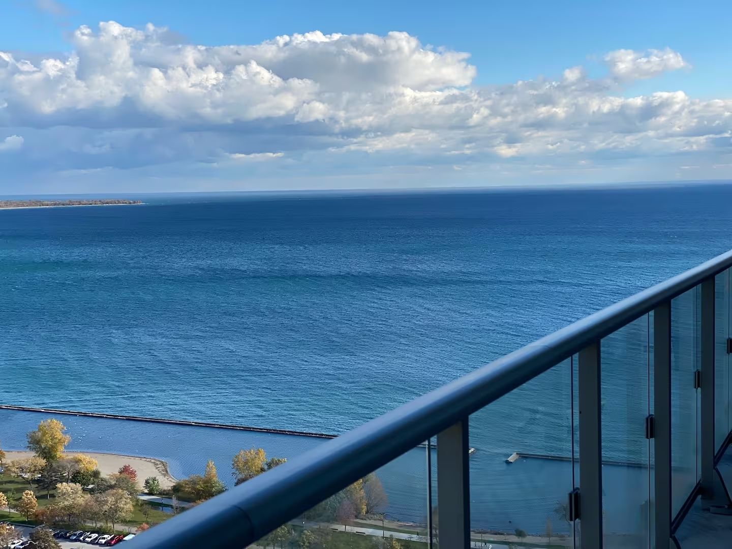 • Floor-to-ceiling windows provide panoramic views of the city and lake.