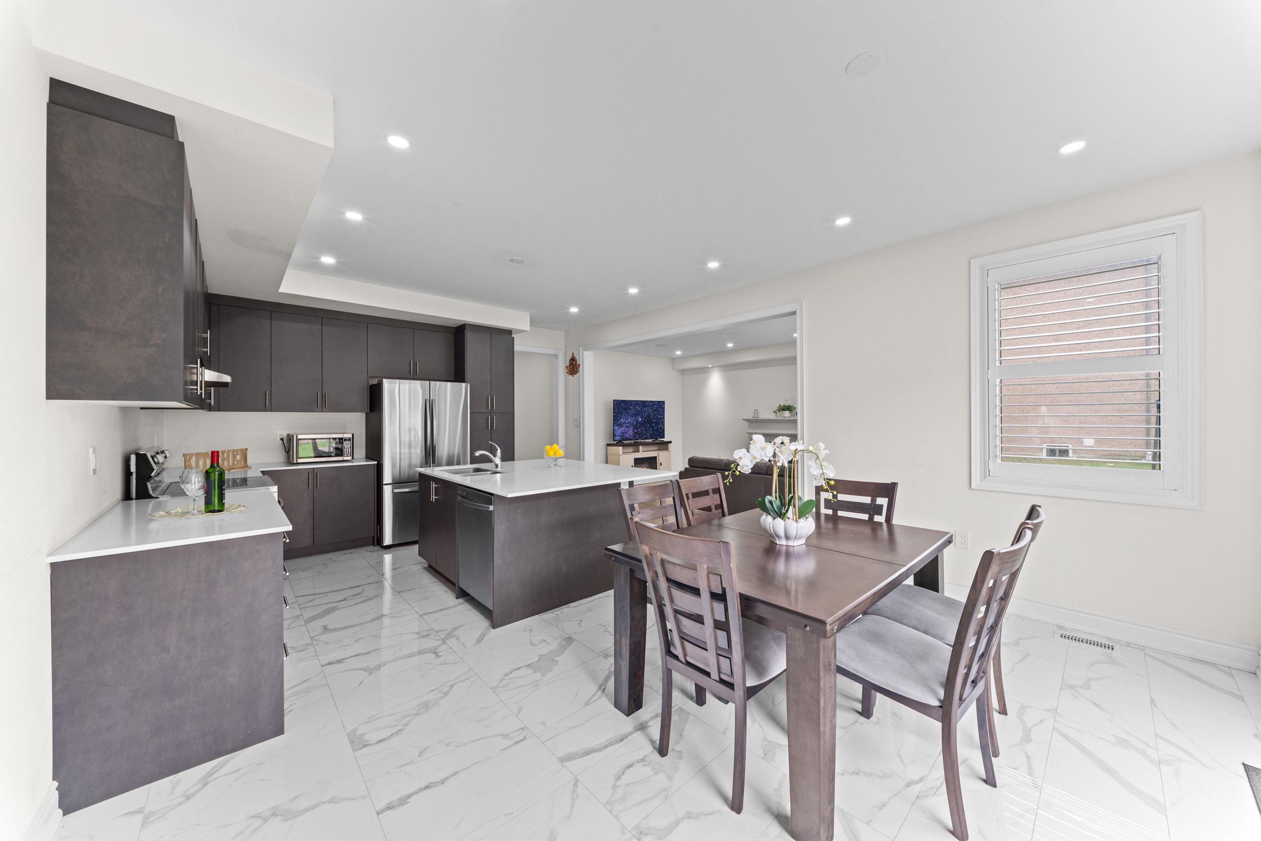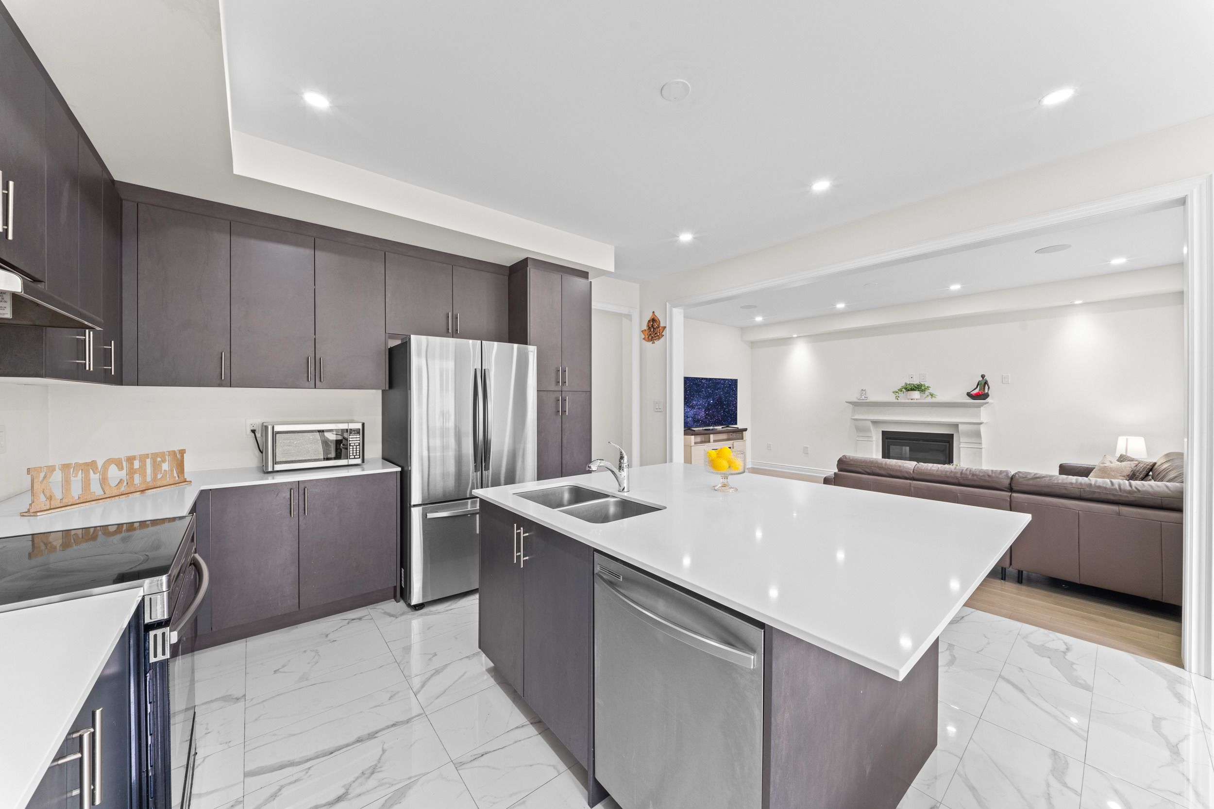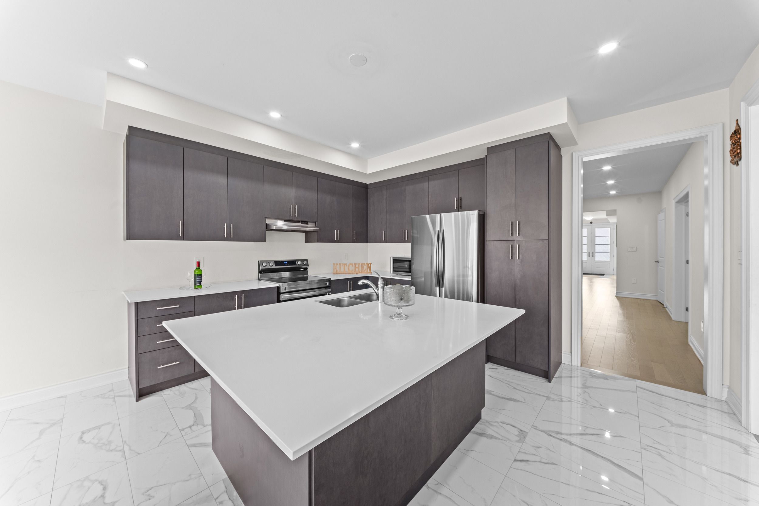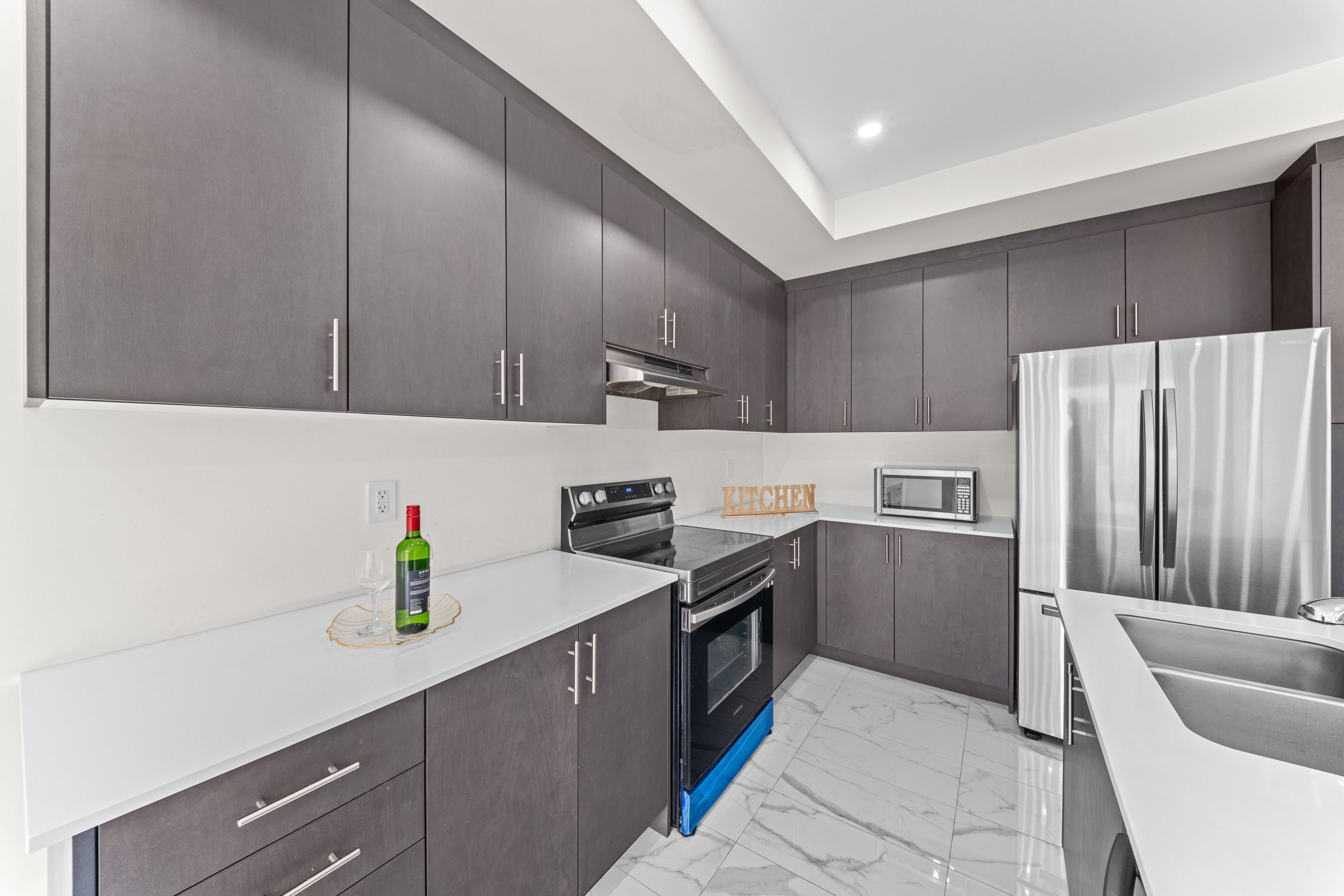 • Gourmet kitchen equipped with quartz countertops and stainless steel appliances.