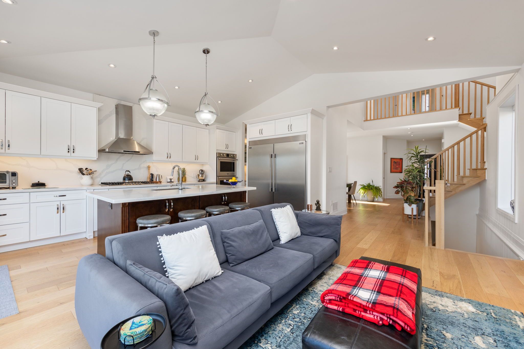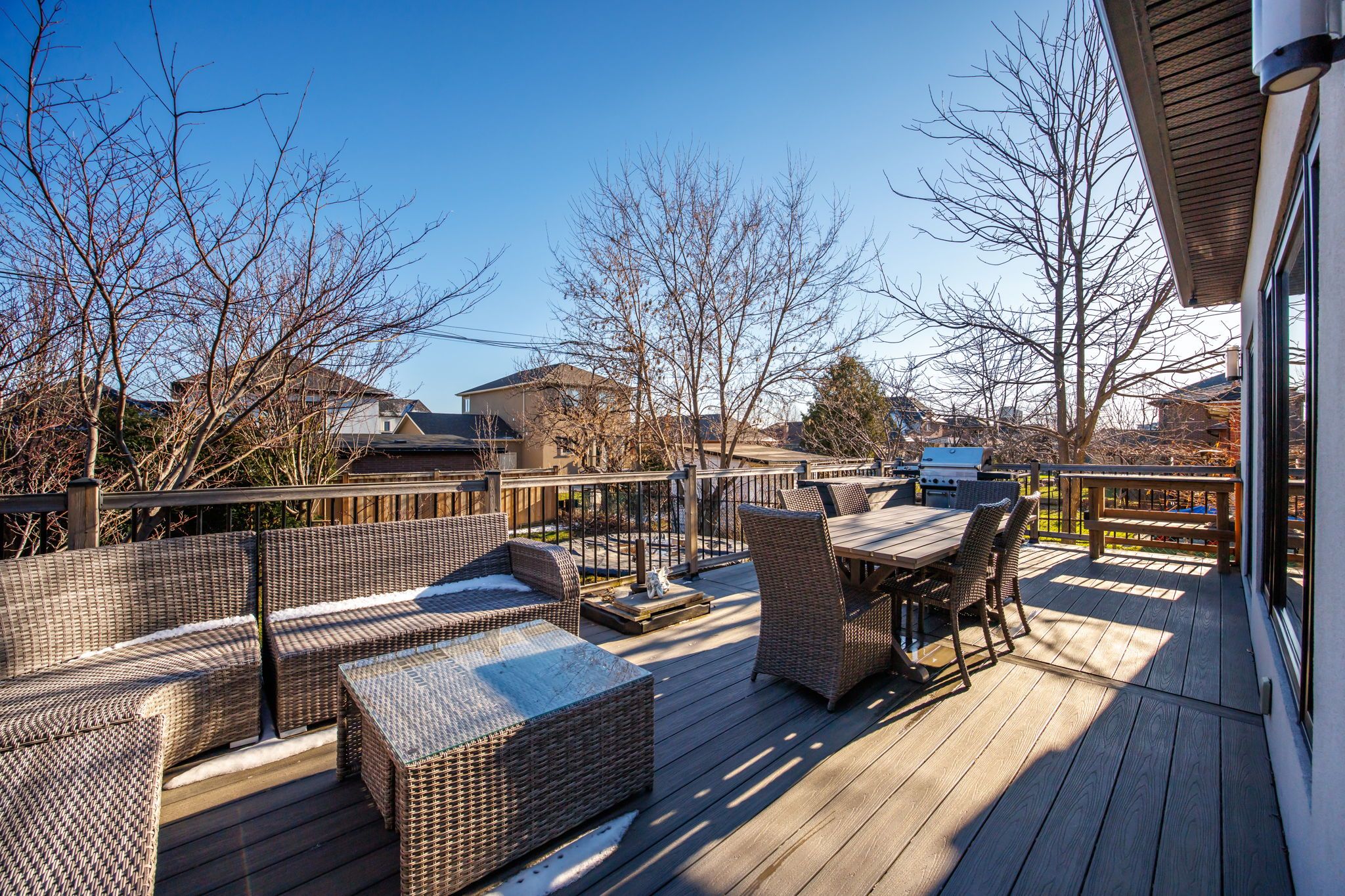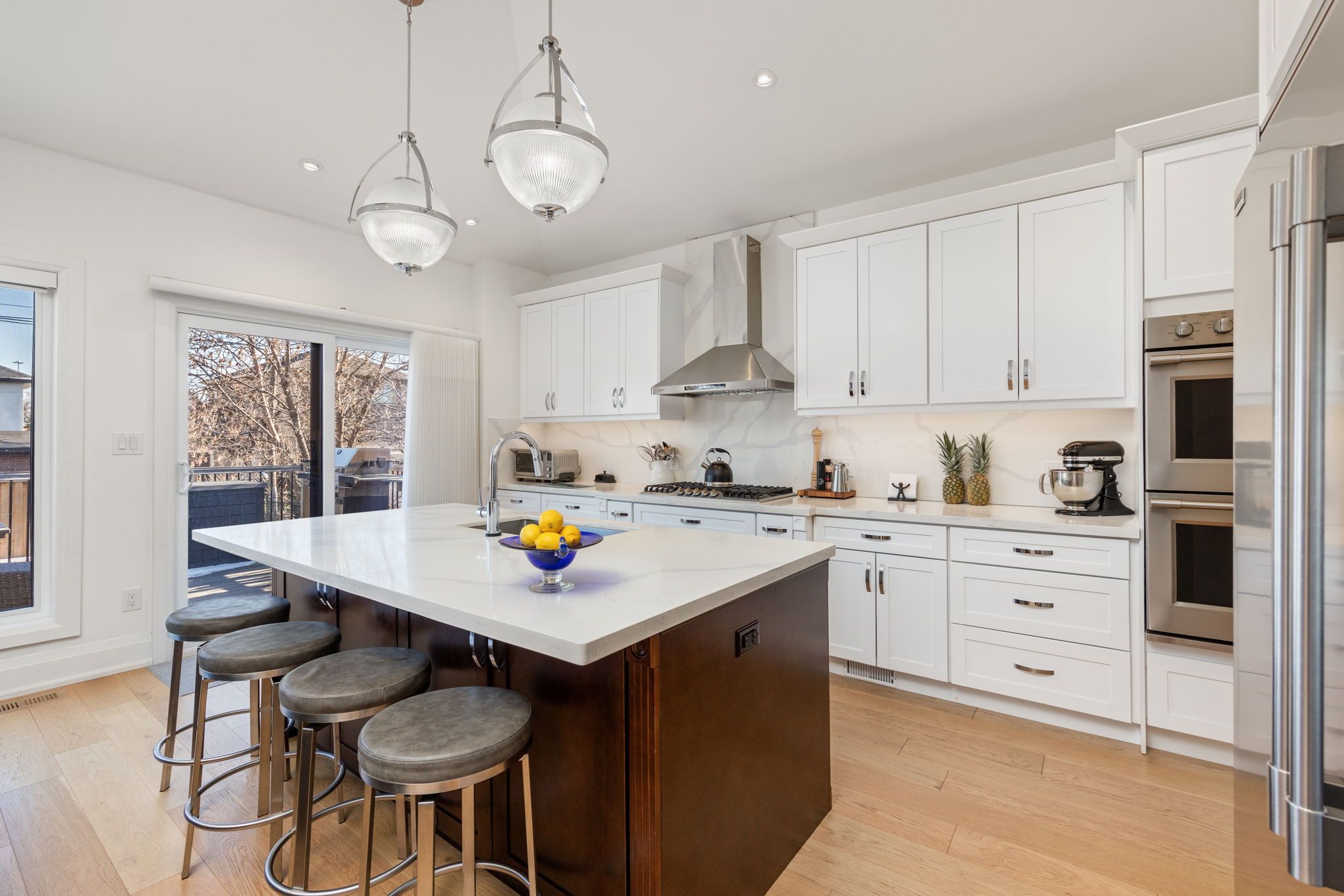 • Stylish kitchen with walk-out deck, gas line for BBQ, and pantry.