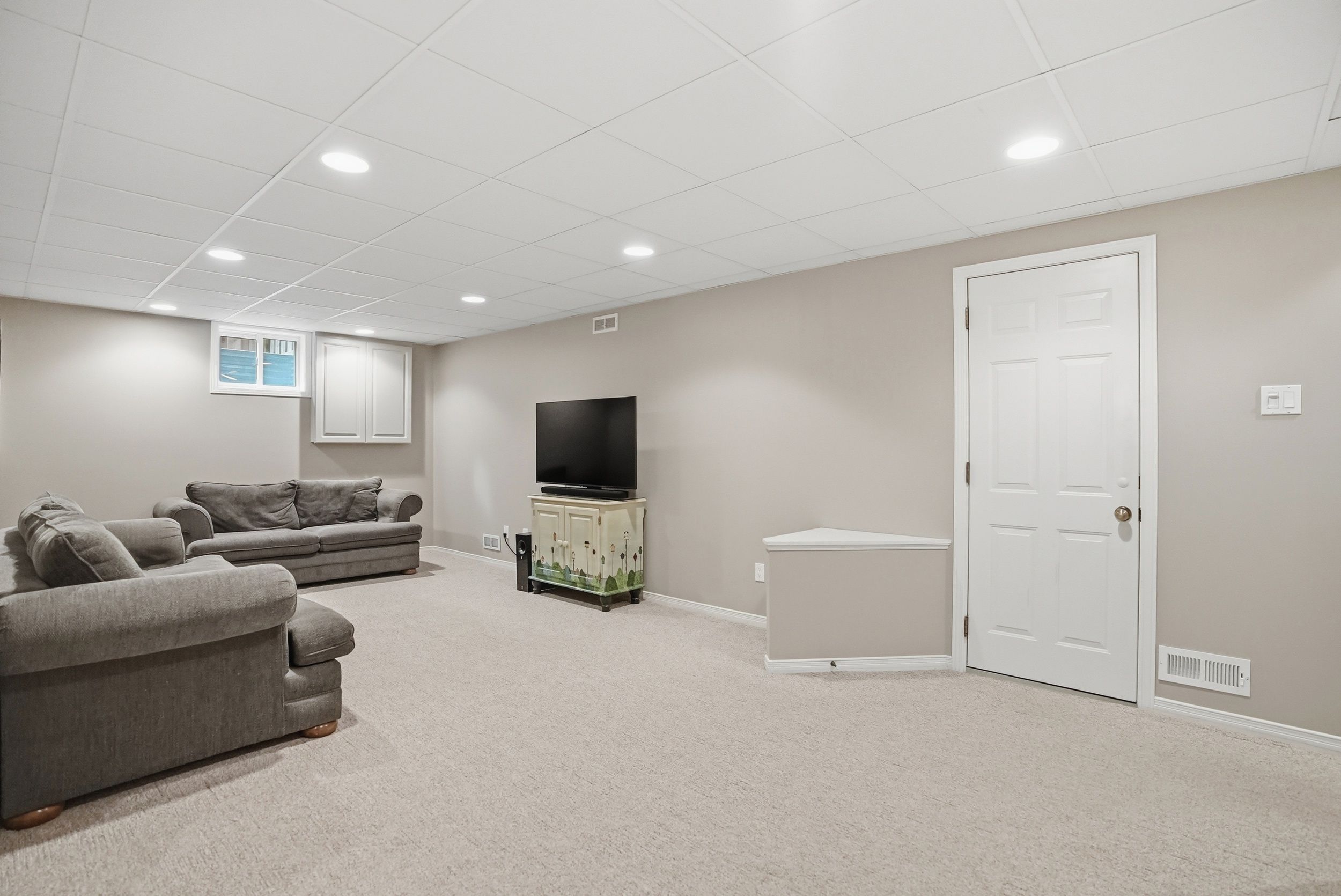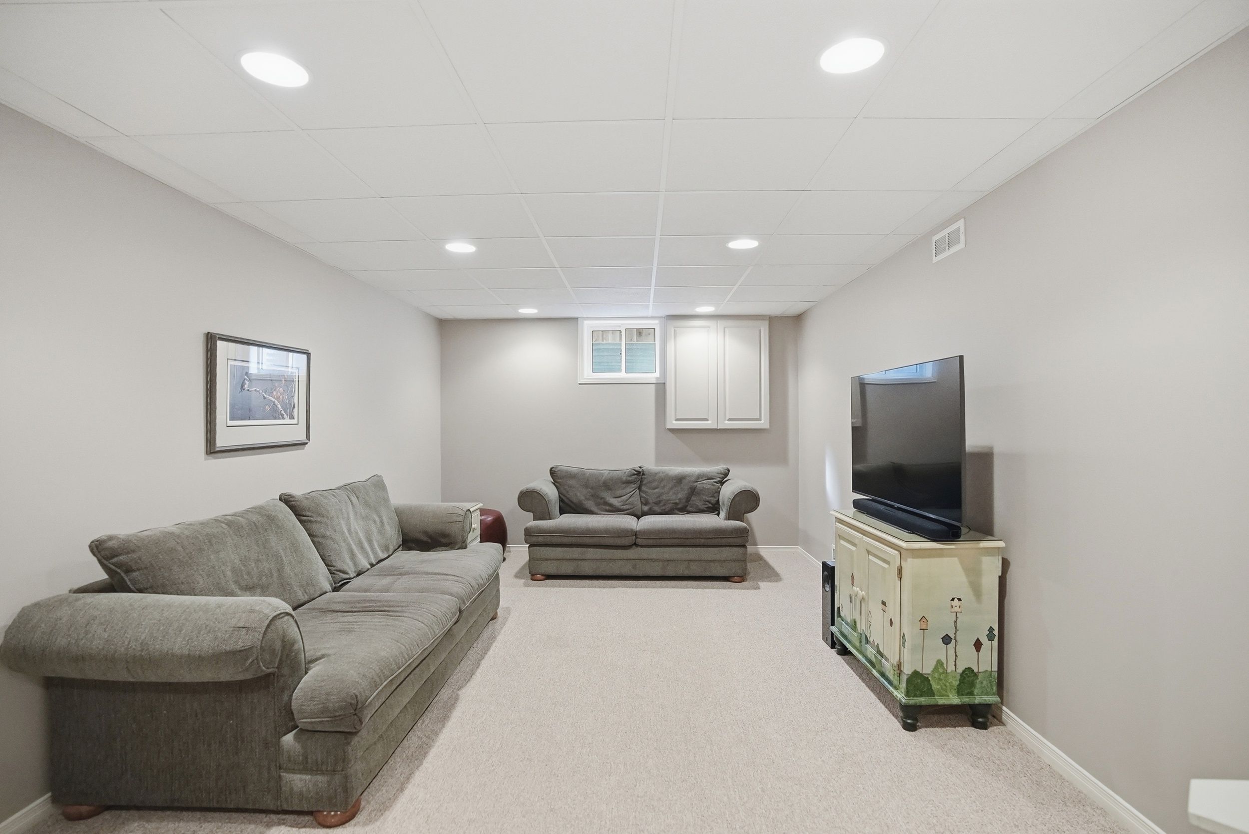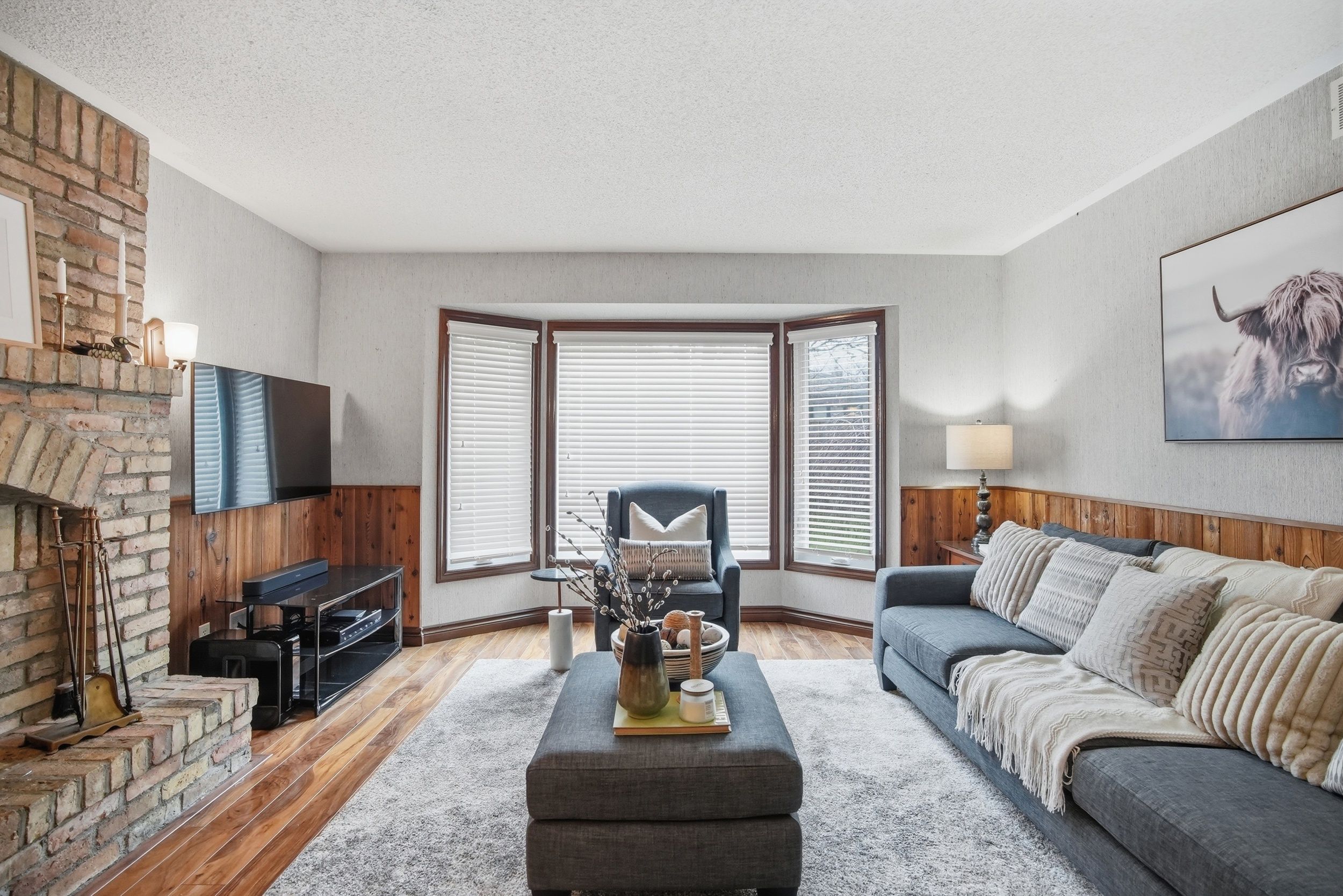 • Oversized family room featuring a wood burning fireplace and natural light.