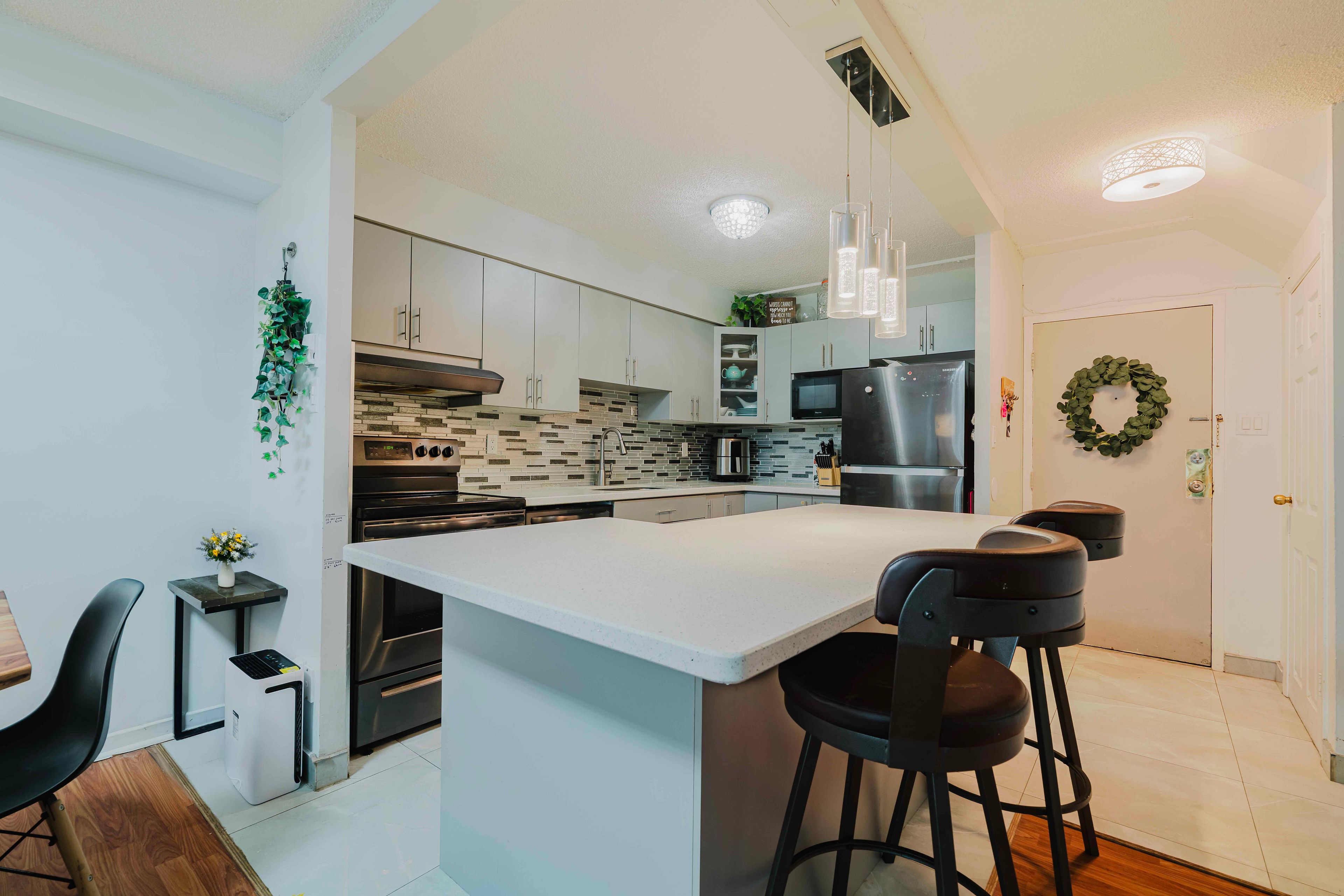 Located in one of mississauga's most desirable and convenient neighbourhoods, this beautifully renovated two-storey open-concept condo features 3 spacious bedrooms and 1. 5 bathrooms. The modern kitchen and both bathrooms were fully renovated in 2020, offering a fresh and contemporary feel throughout. Enjoy the convenience of ensuite laundry and a bright, functional layout perfect for comfortable living. Gas bbq is permitted on the balcony, ideal for outdoor enjoyment.