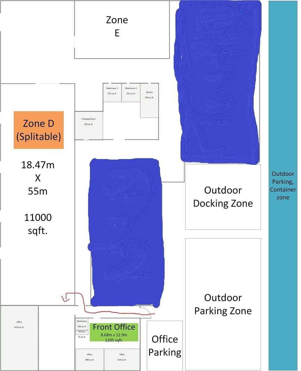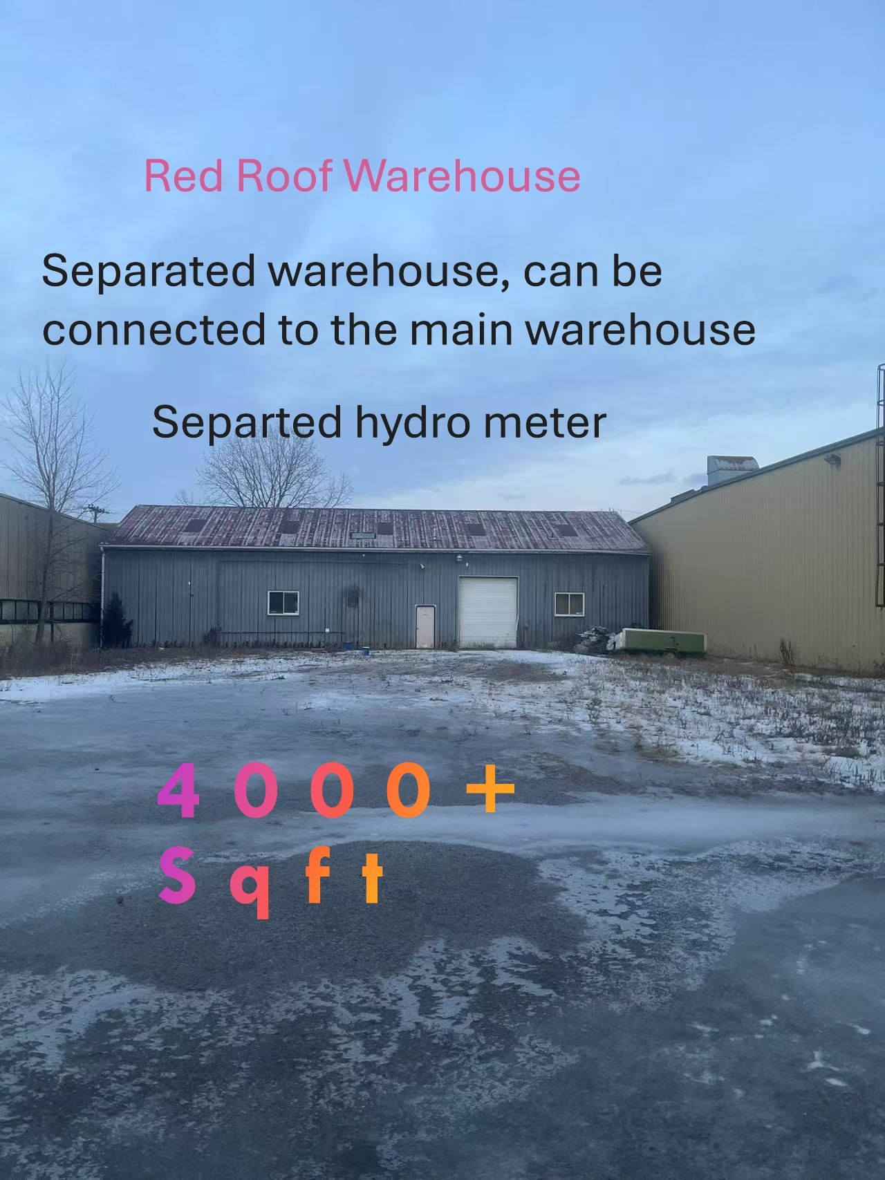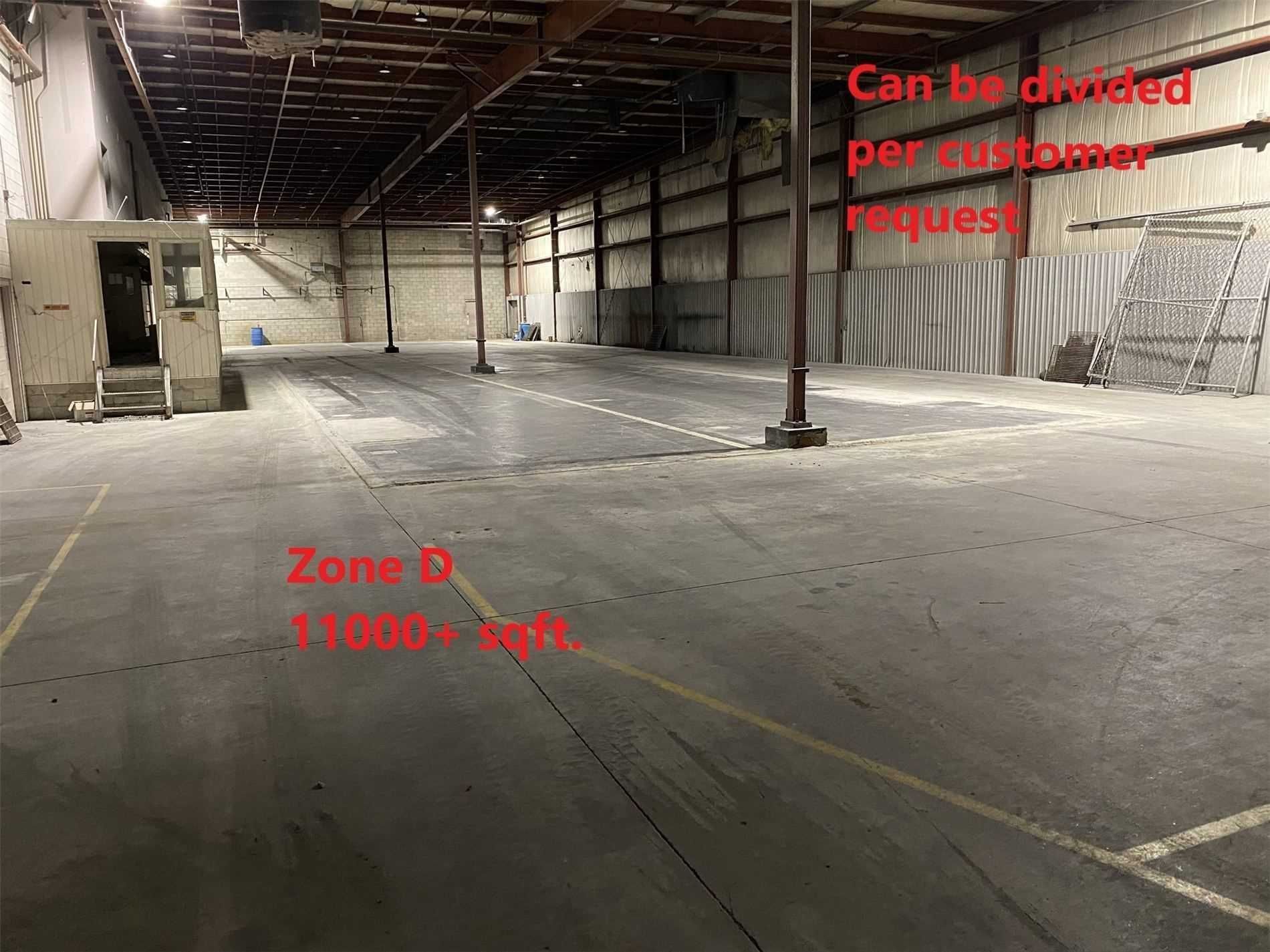 Various sizes and configurations available, from 1000+ to 24450+ sf. Red roof warehouse 4000 sf.+, side unit 2000 sf. Owner is open to customer requests/designs. (rent may vary). Totally 47k+ sf standalone industrial warehouse with only portion occupied. Partial occupied, see floor plan zone d,e and front office for lease. Location near us 100km away, easy access to 401. M1,steel frame construction. 20 feet ceiling, total site 4. 4 ace, industrial power 3 phase,3000a, 600v, 12600v transformer on-site
