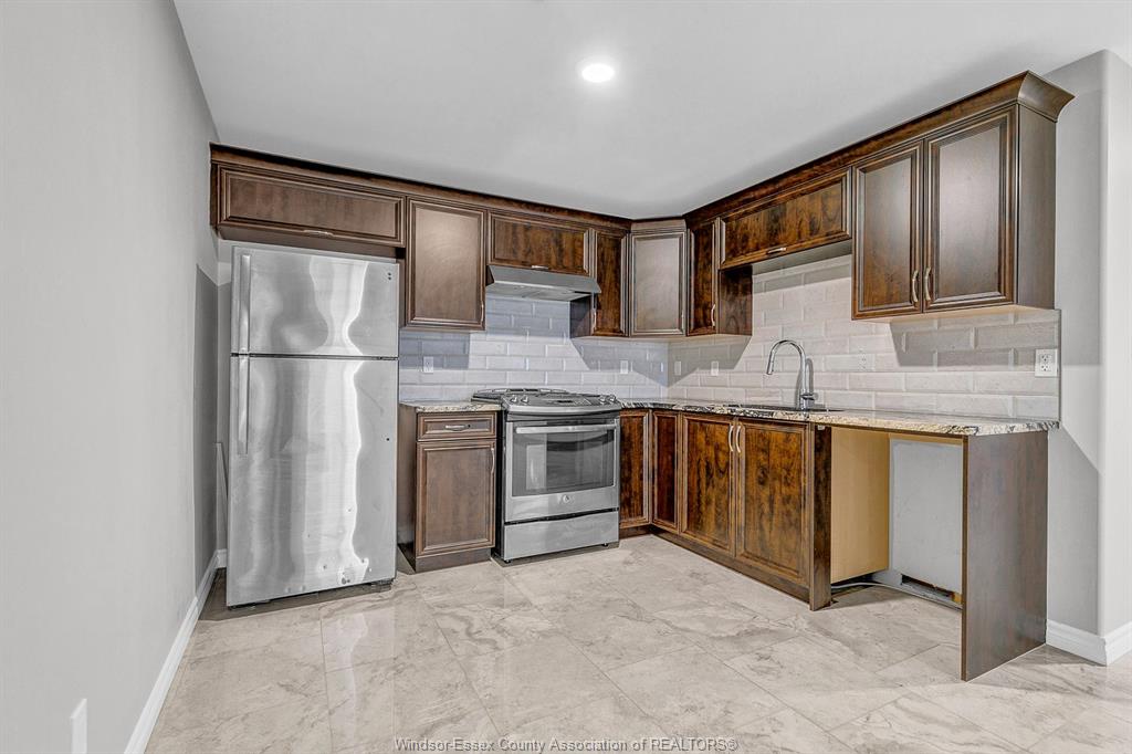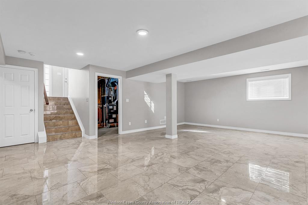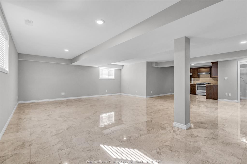 • Lower level with family room, extra kitchen, bedroom, and storage space.