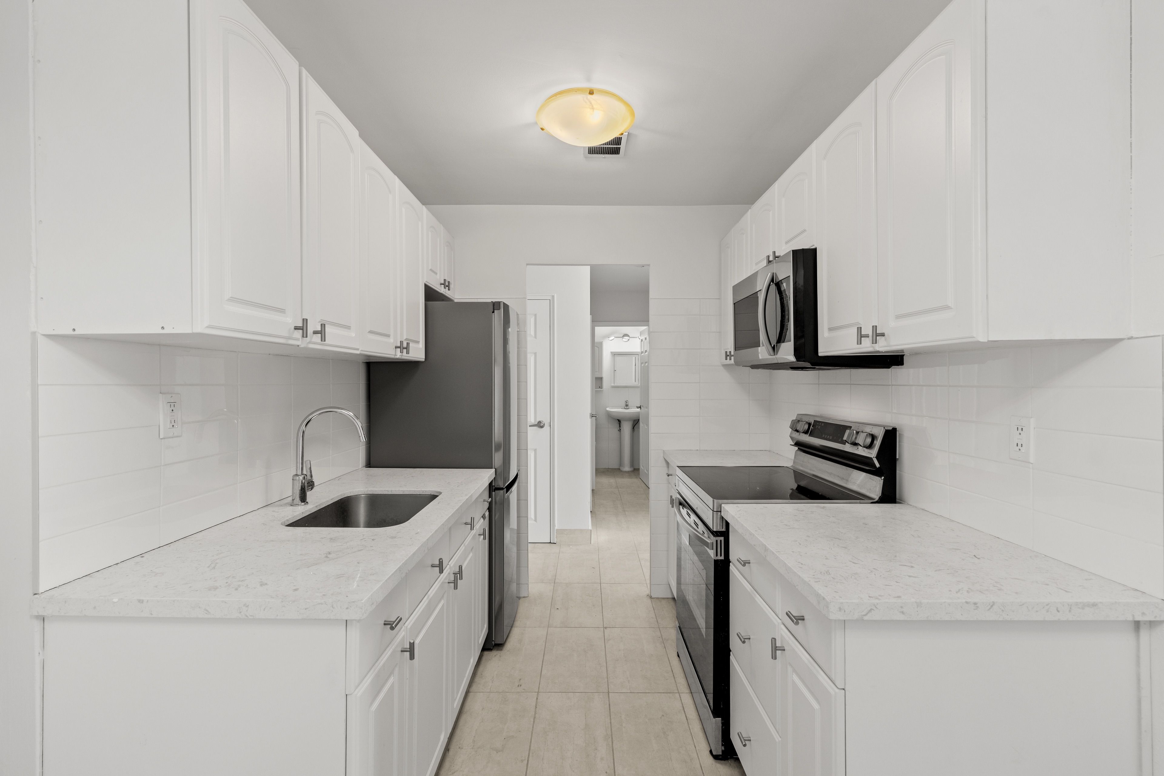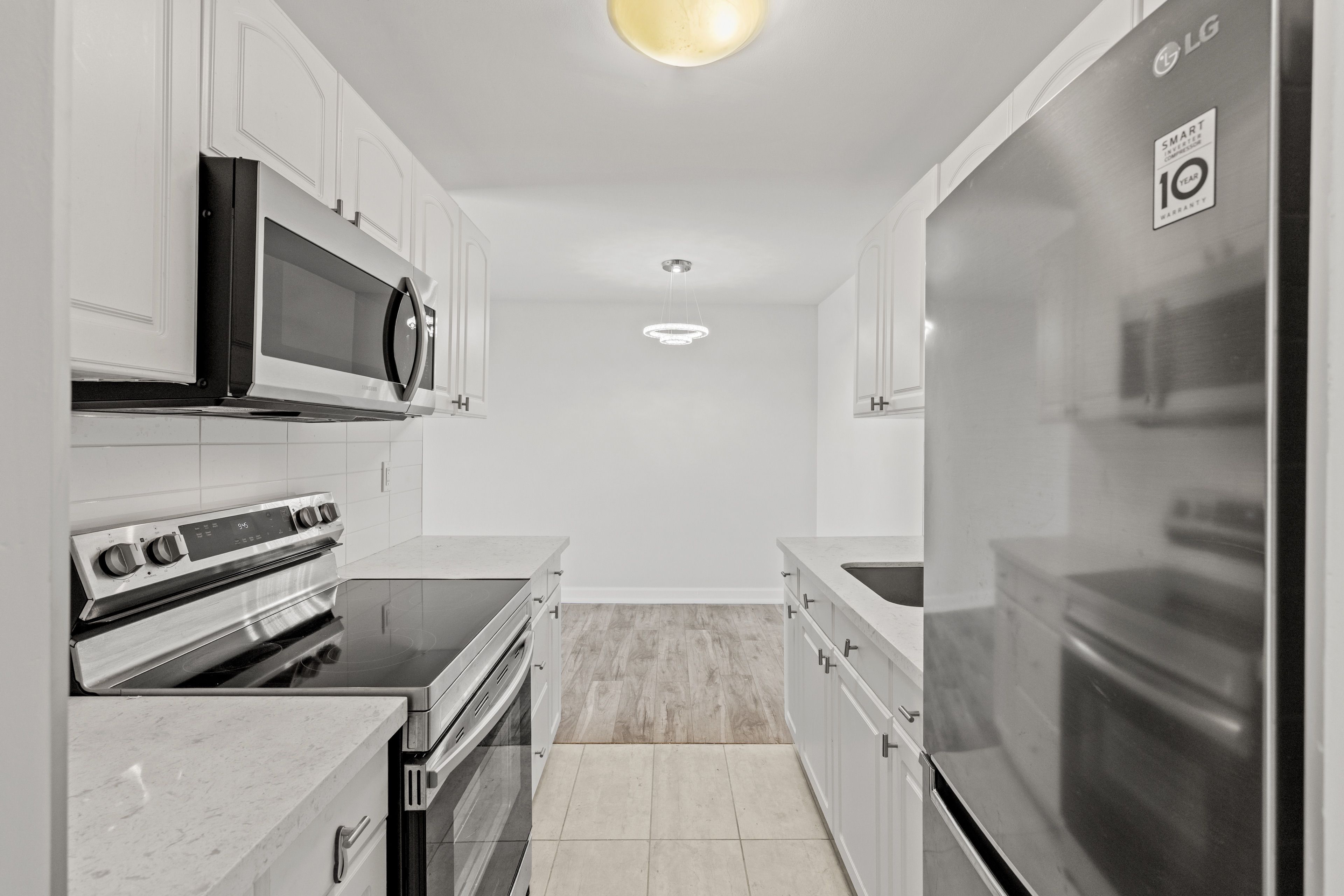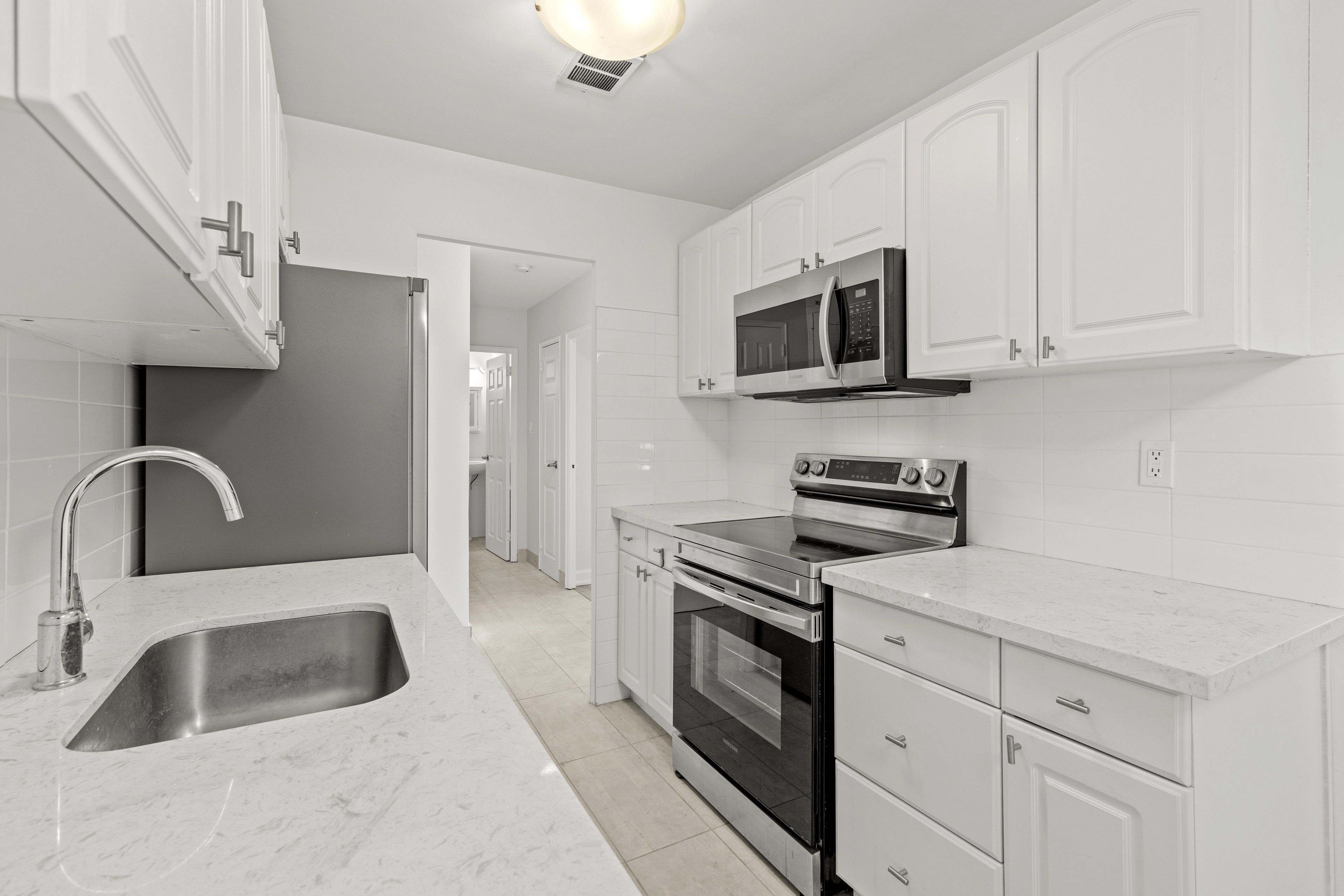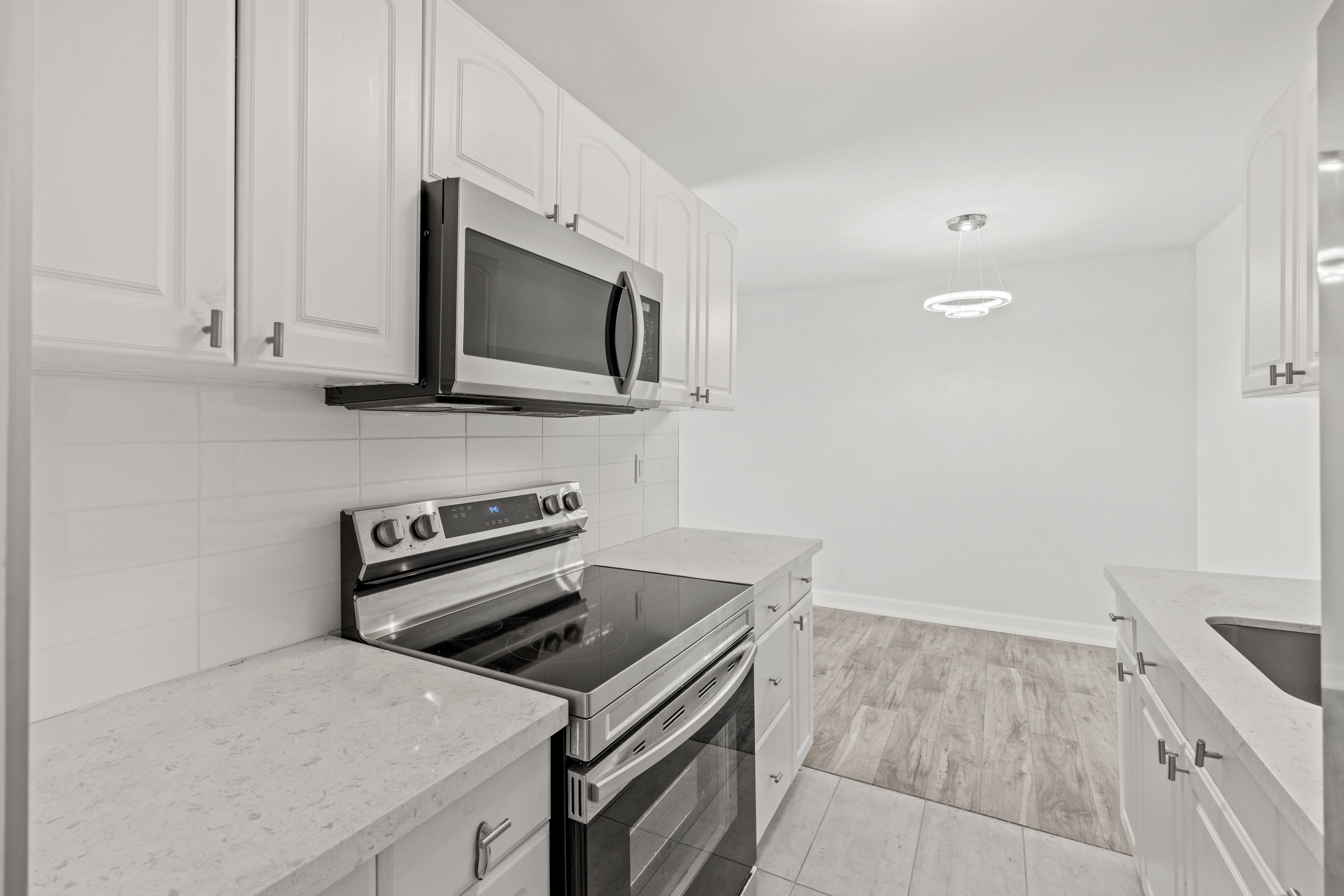 • Bright modern kitchen with new stainless steel appliances and stylish backsplash.