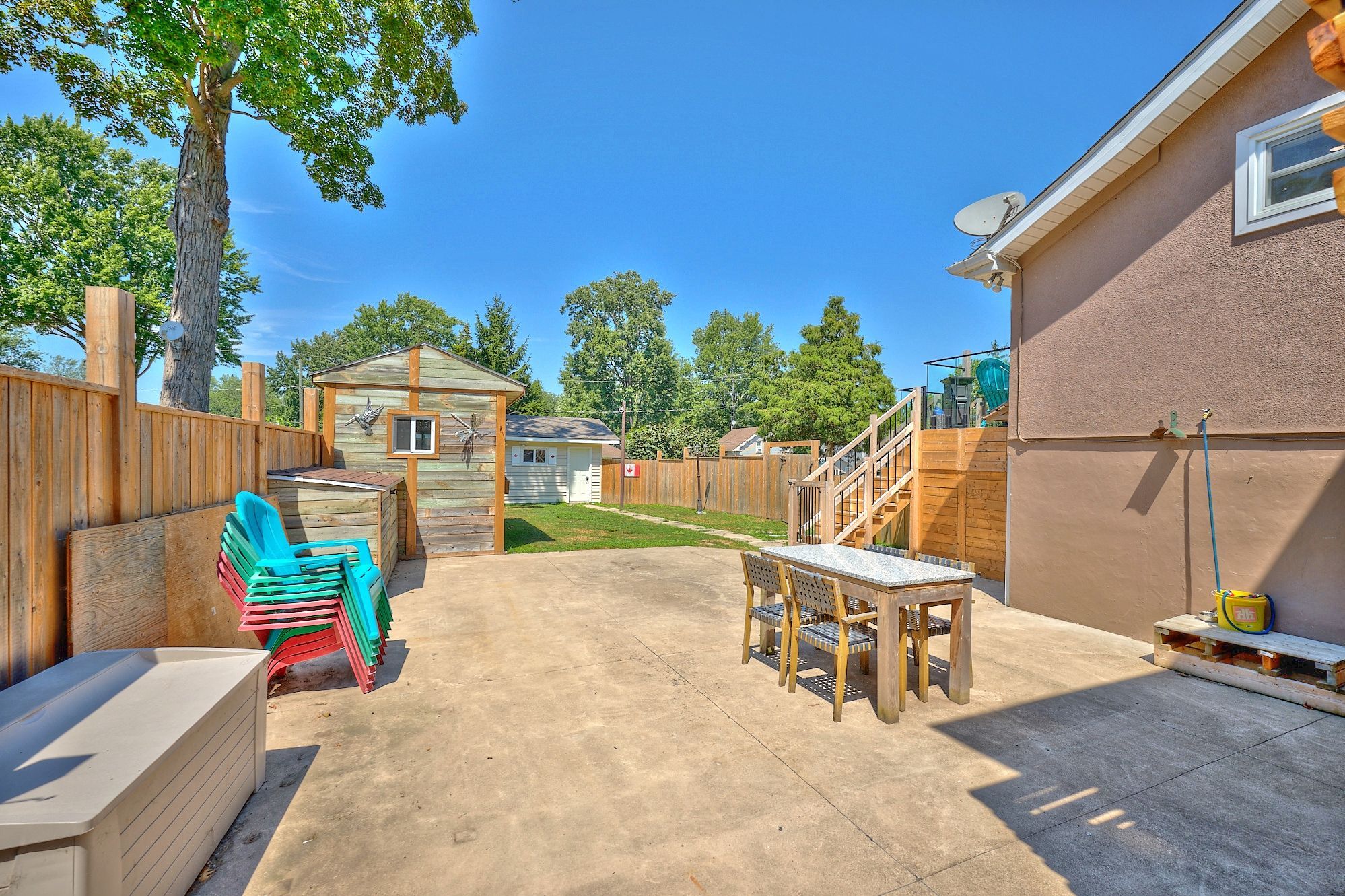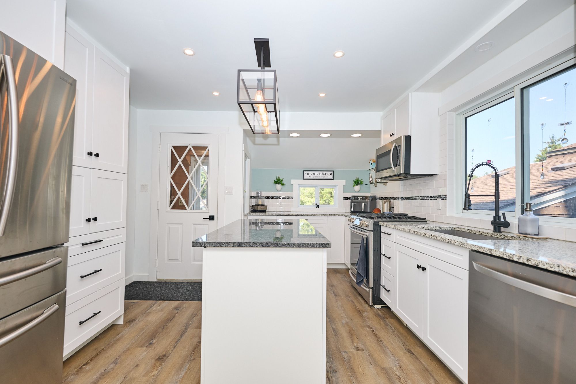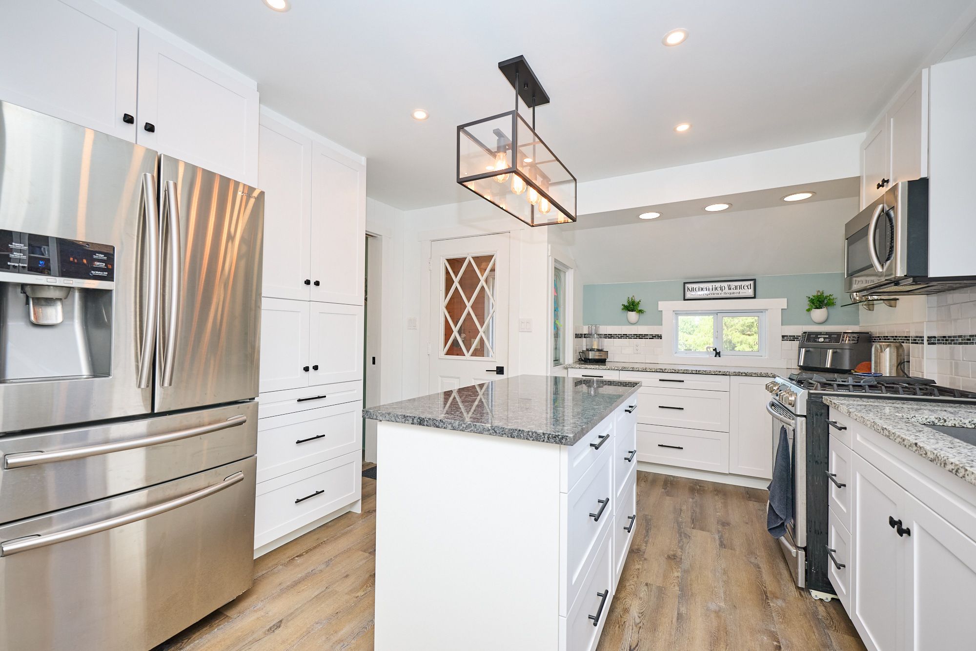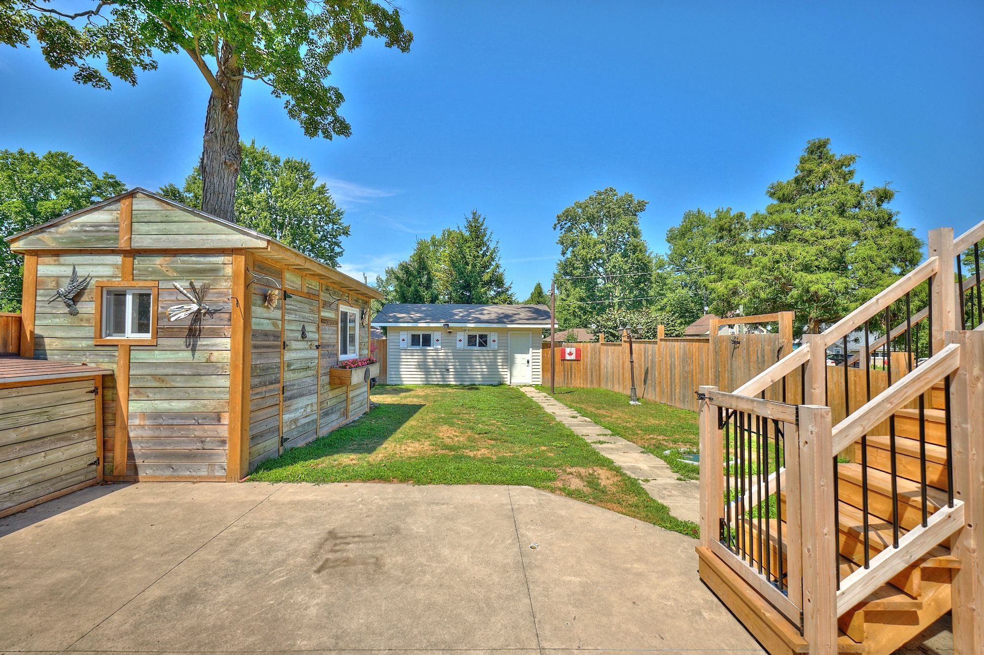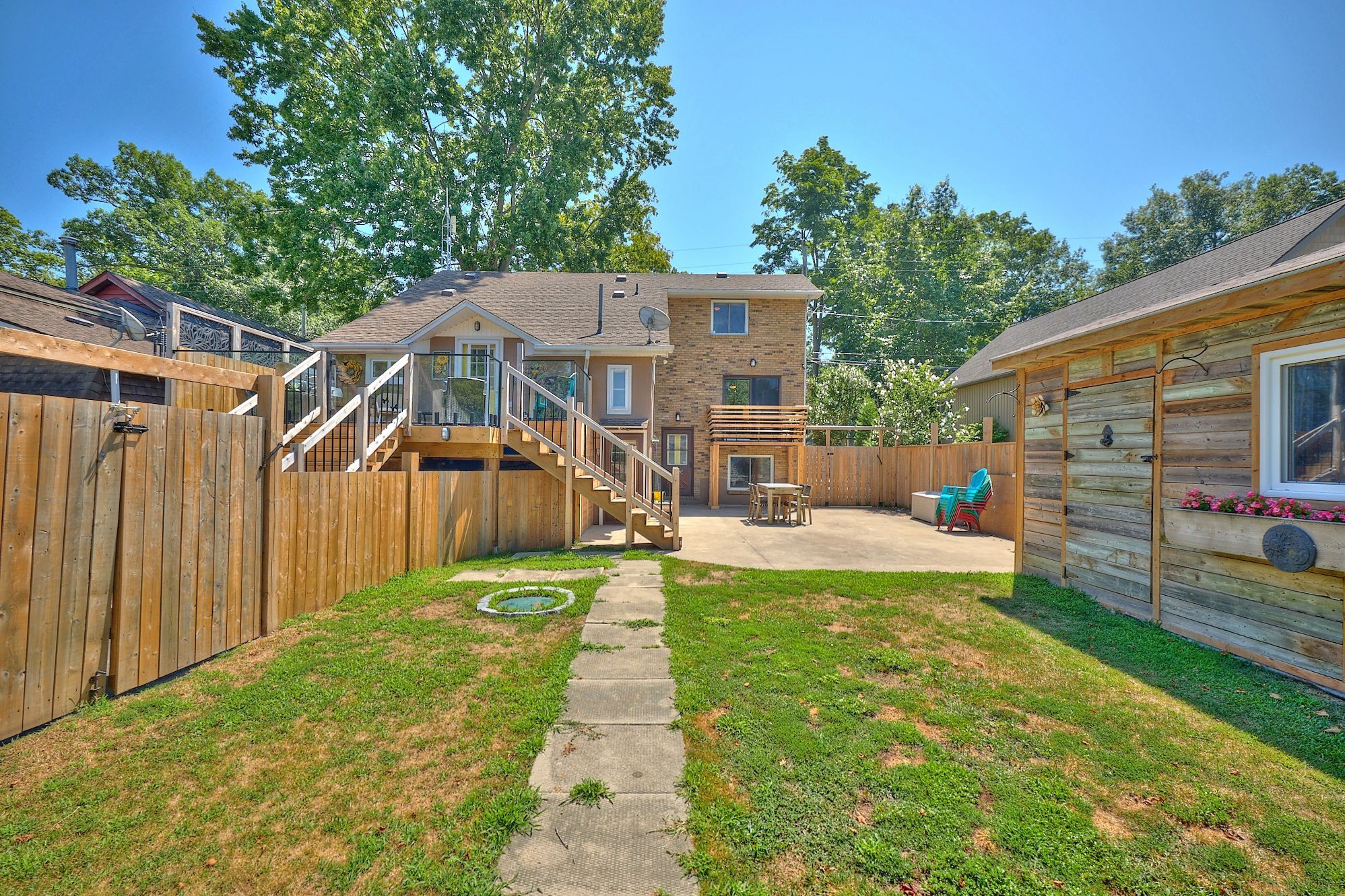 A price that gets attention. A location that speaks for itself. An incredible opportunity with deeded lake access! This fully updated home offers over 1,930 square feet of living space, a detached garage, two large sheds, and two separate parking areas, one spot at the front and parking for four at the back, in addition to the single-car garage. The property extends all the way to woodland drive. Inside, you'll find an open-concept layout with bedrooms on both the main and upper levels. The stunning white kitchen features granite countertops, a massive island perfect for meal prep, and plenty of cabinetry and drawers for storage. The living room includes a cozy gas fireplace and a grand staircase leading to the upper floor. The main floor also features a family room with a newly rebuilt private balcony, a bedroom, and a fully renovated bathroom. Upstairs, you'll find two additional bedrooms and another updated bathroom (excluding the shower). This home has seen numerous upgrades throughout, making it completely move-in ready. Improvements include an added cistern with a new front porch built to cover it, basement insulation with osb wall finishes, and an updated basement window. Additional updates feature a water softener, a hot water tank (owned), and replaced front windows. The exercise/weight room includes a dri-core subfloor for added comfort, and most lighting fixtures throughout the home have been replaced. Outdoors, you'll find a back deck with sleek glass railings and two recently updated driveways. Custom window shades have been installed on the upper floor, along with enhancements to the large family room. Please note: this property offers its own deeded access and right-of-way to the lake, adding exceptional convenience and value.