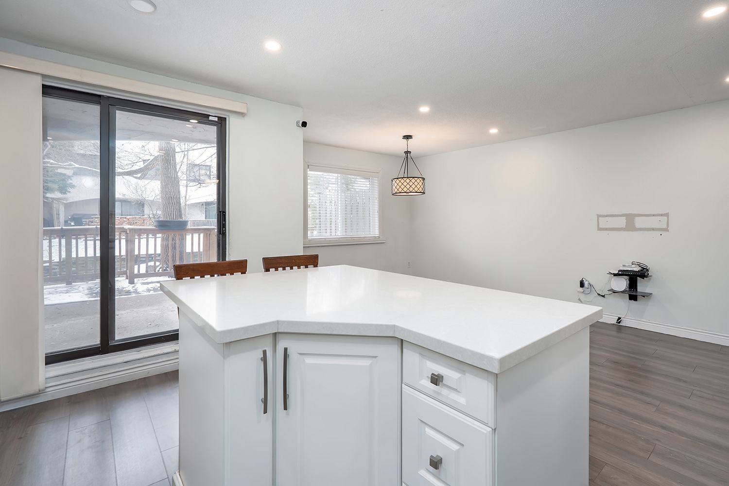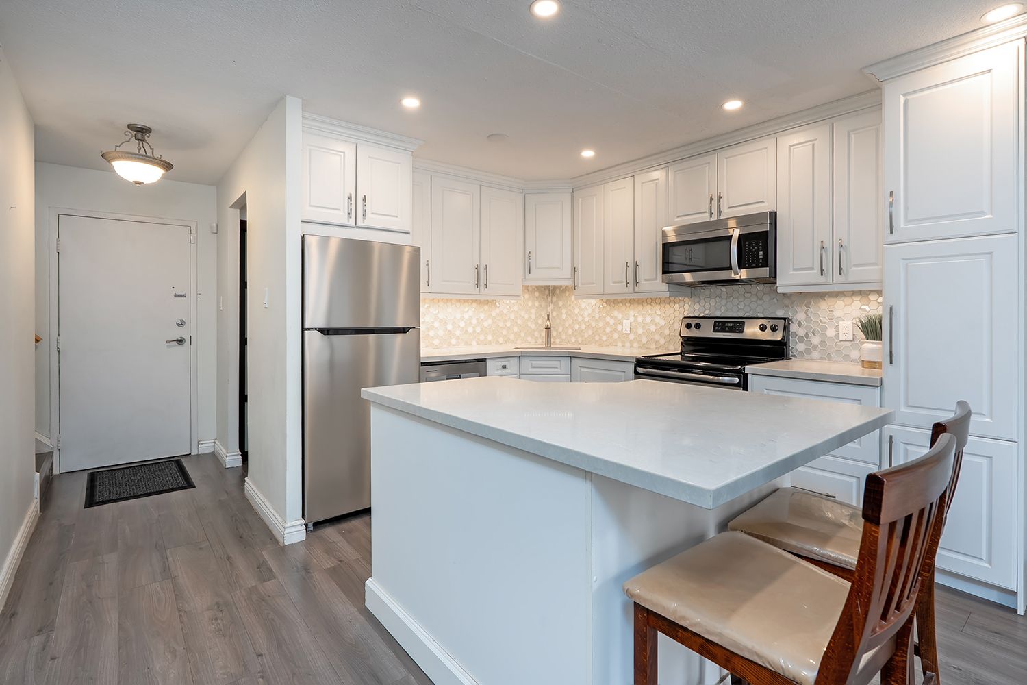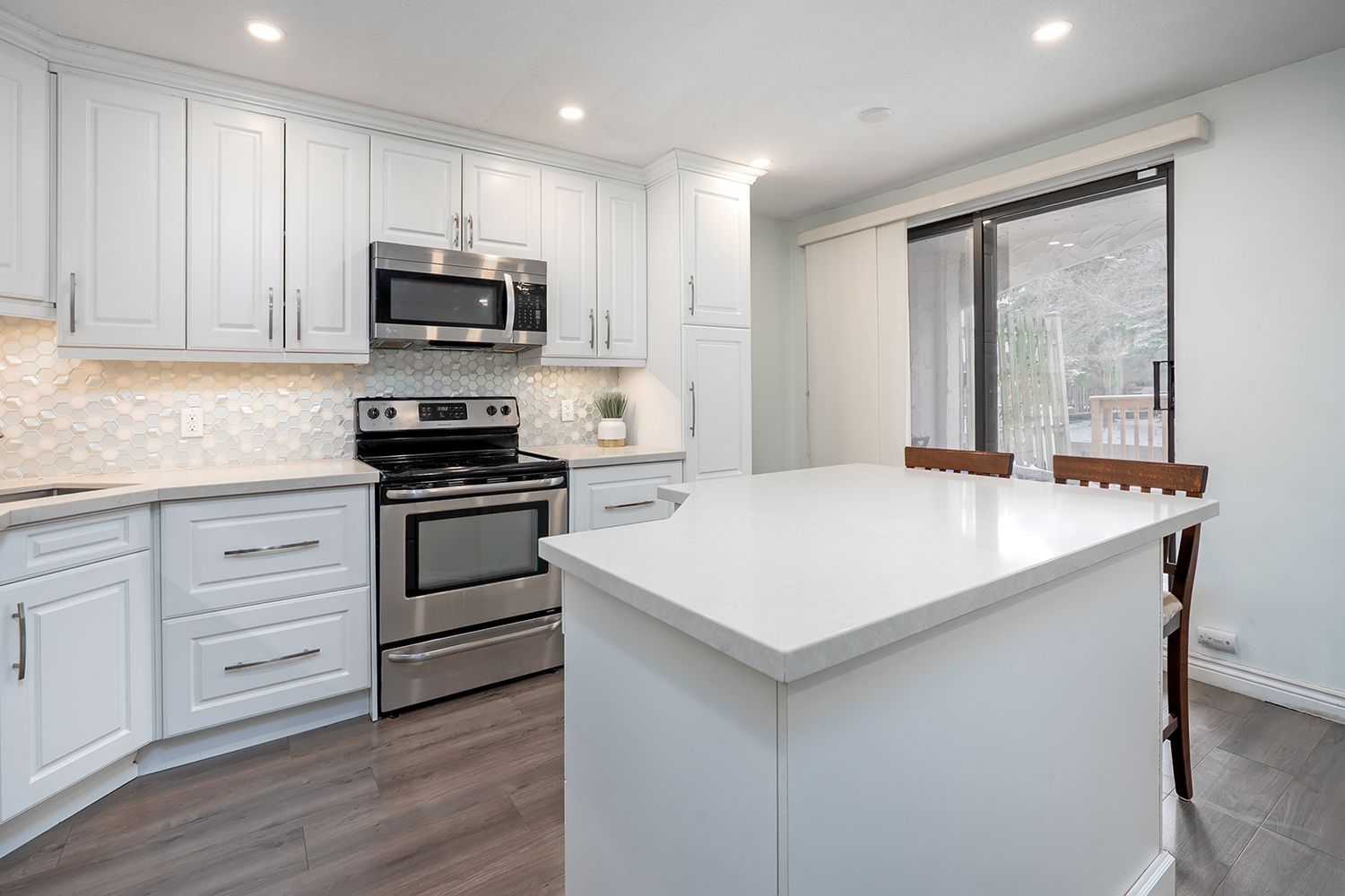 • Renovated kitchen featuring quartz counters and a spacious island.