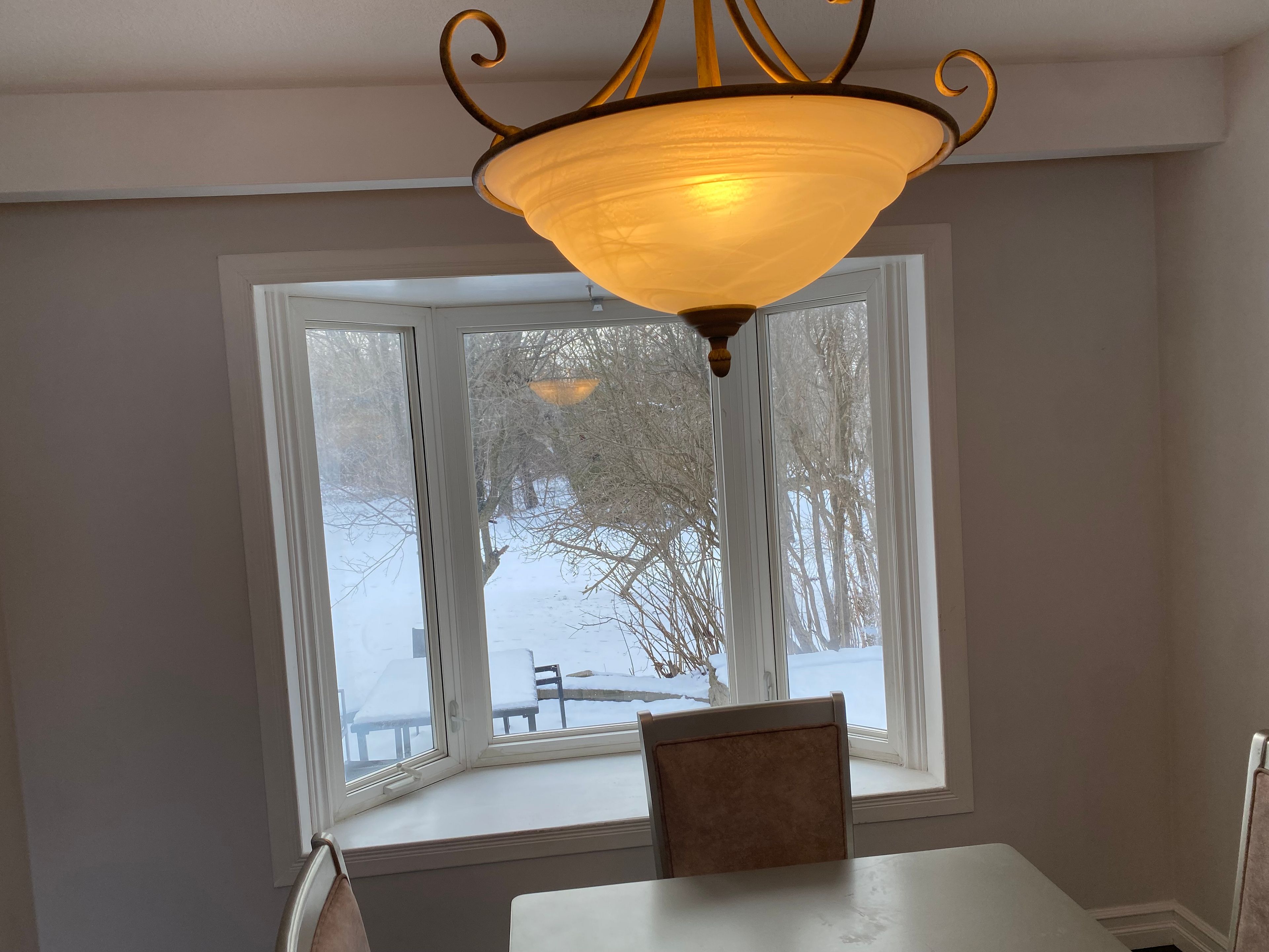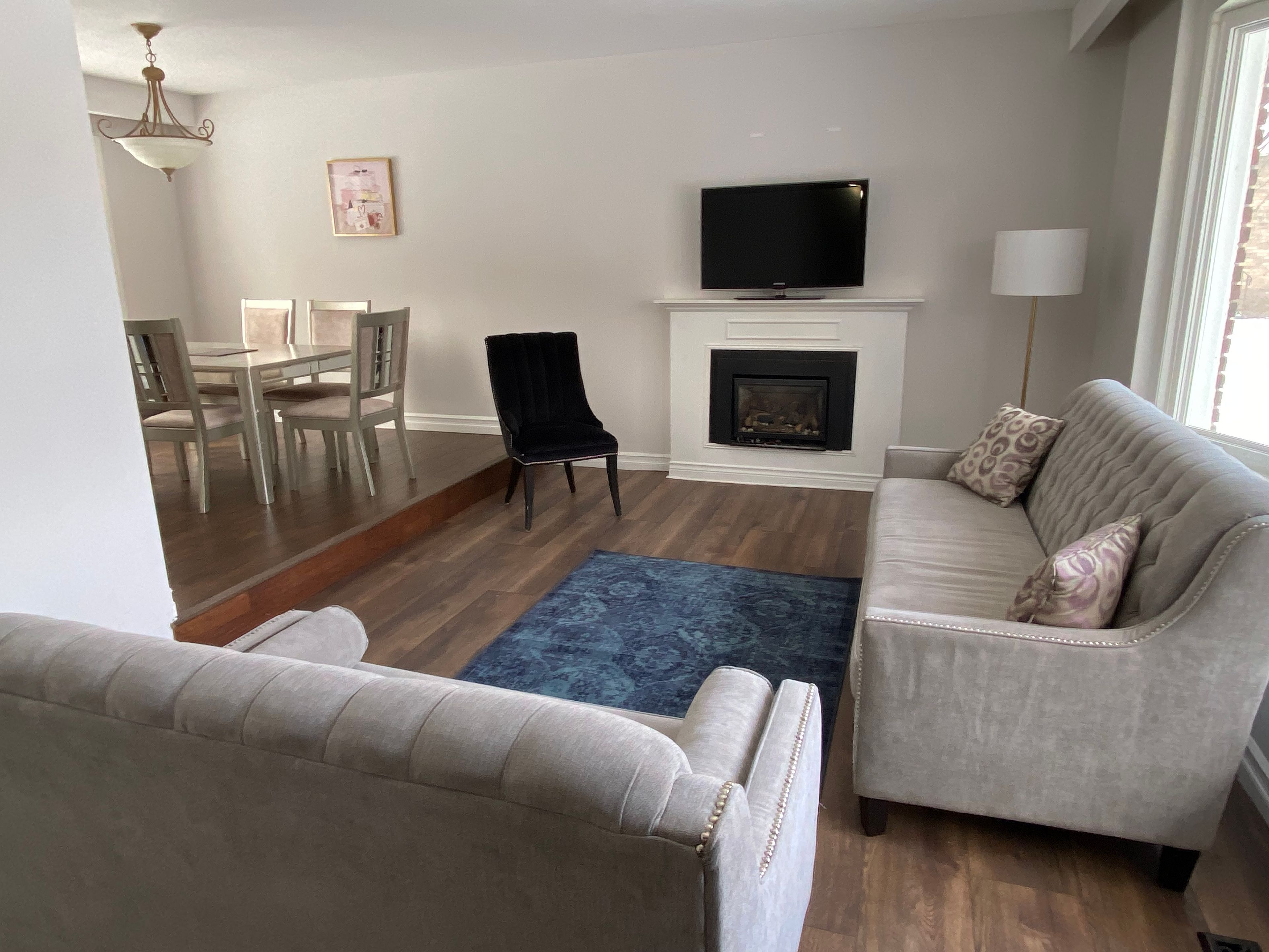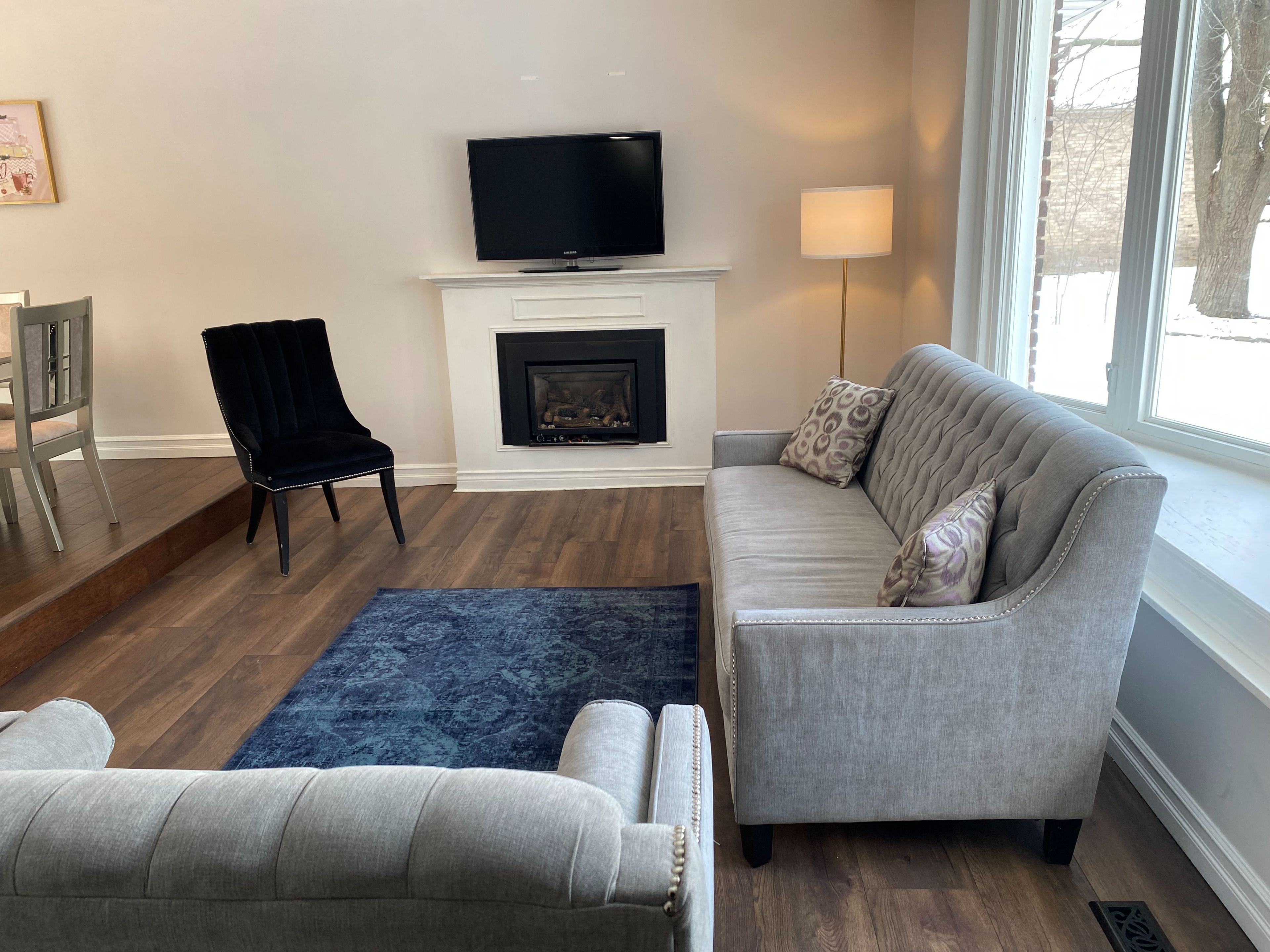 • Freshly painted sunken living room with a cozy gas fireplace and bay windows.