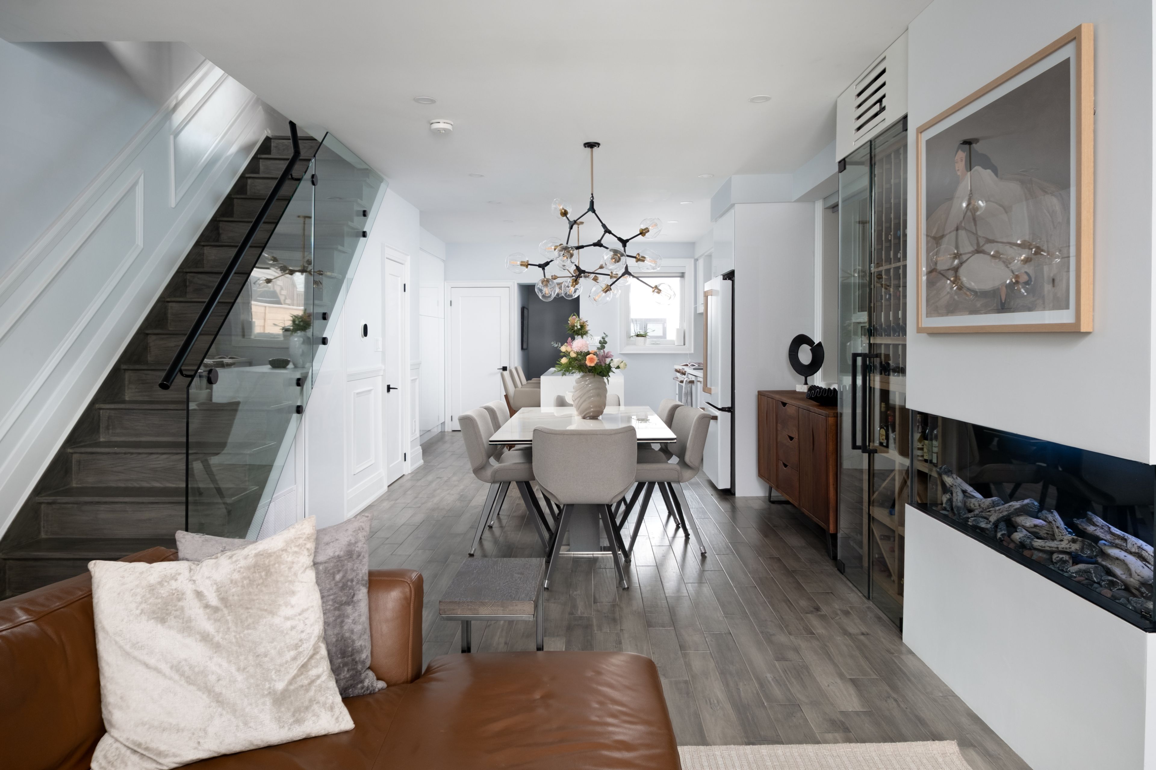 • Impressive interior features like a marble fireplace and sleek wine cellar.