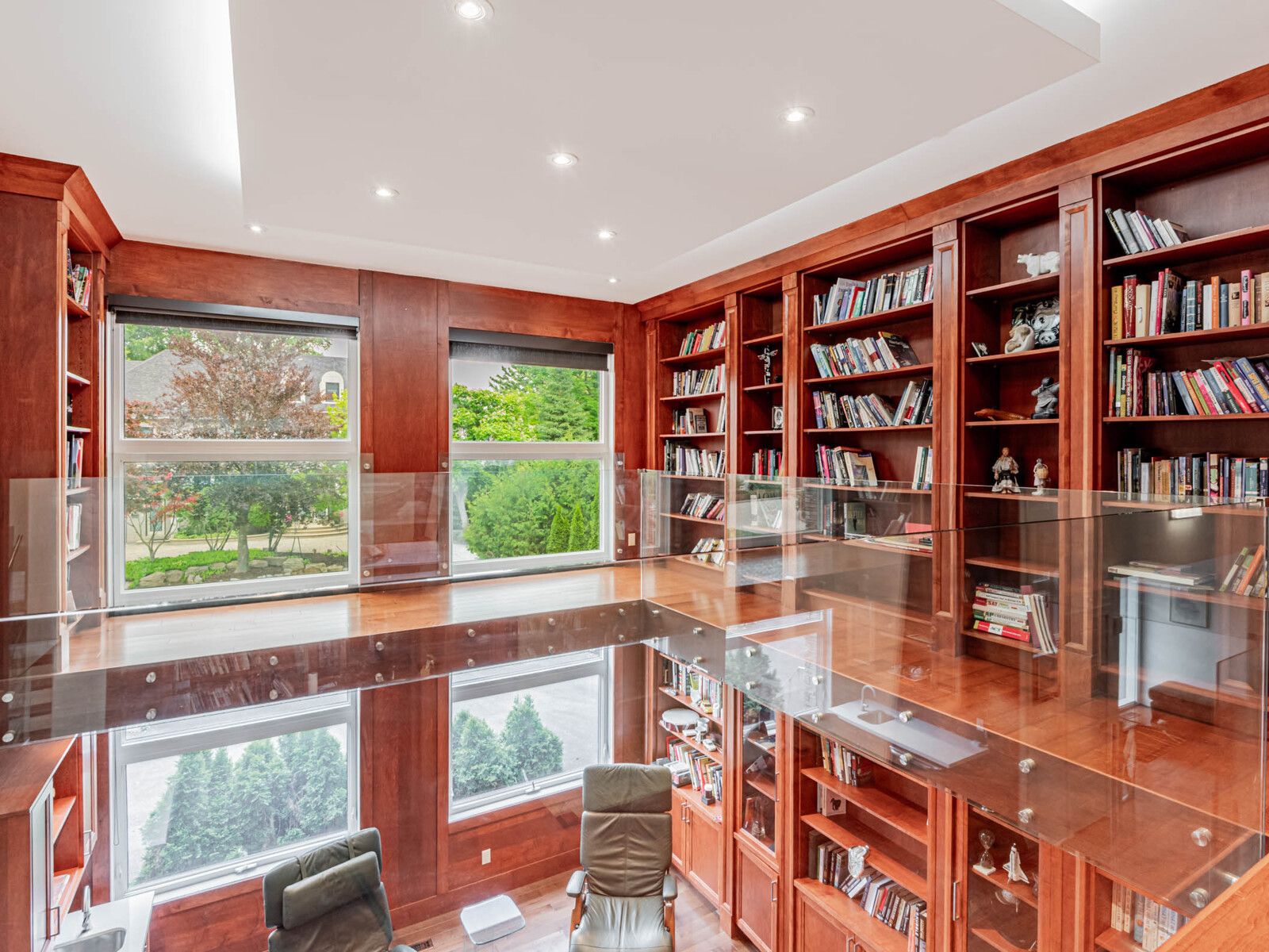 Situated pristinely on a 150ft wide lot, this one-of-a-kind custom built home offers a unique design language perfect for families. Flanked by dual double garages, the circular drive can accommodate 14 cars. The entrance welcomes a water feature, and access to the double level office featuring wood trim, a coffered ceiling & glass railings. A sprawling kitchen includes an over-sized bi-level island with contrasting countertops, sub-zero fridge, dual wall ovens, three sinks & ceiling mounted hood. The optimal design extends into the bedrooms where each bedroom features an upper loft space. Special features of this house will include a full-sized gym with basketball net, rock climbing wall & treadmill, a media room with inclined seating, a projector, and hi-fi system, and a sauna. A quiet & safe neighborhood with great schools. Book a showing today to experience this one-of-a-kind house for yourself.