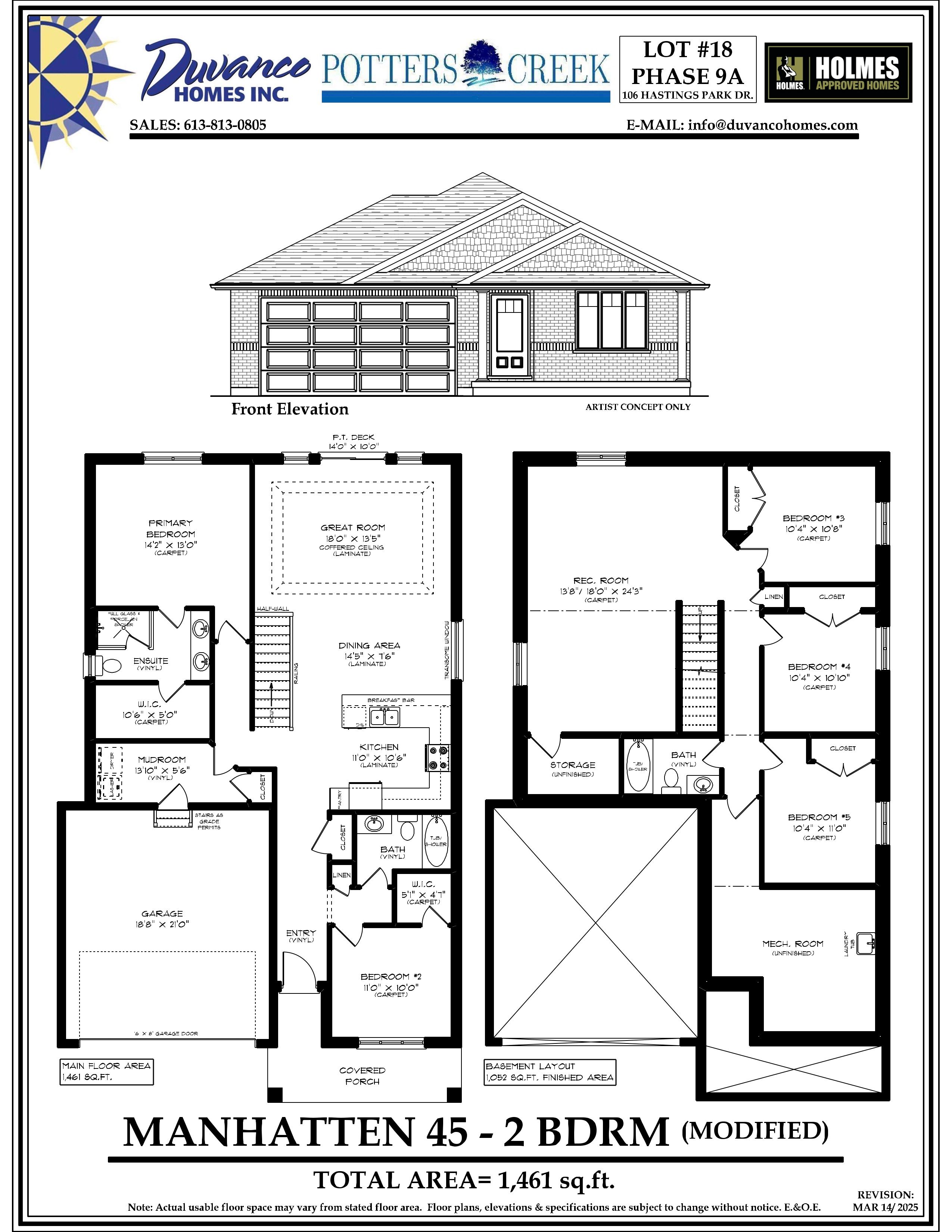 Welcome to this exceptional manhattan by duvanco homes where quality craftsmanship meets thoughtful design in one of belleville's most loved neighbourhoods. This stunning 2+3 bedroom home delivers impressive value without compromising on the spacious details of a modern home. Step inside to discover an open concept layout bathed in natural light, where a beautifully appointed kitchen awaits with designer cabinetry with upgraded crown moulding, a generous breakfast bar and loads of cabinetry to make your organized friends green with envy. The living room features a sophisticated coffered ceiling that adds architectural interest overhead. Retreat to the primary bedroom, thoughtfully positioned for maximum privacy, complete with a luxurious four-piece ensuite featuring double vanity, gorgeous porcelain tile, and a spacious walk-in closet. The fully finished basement is the real showstopper-three additional bedrooms, a recreation room for family gatherings, and another full bathroom expand your living possibilities dramatically. Every duvanco home undergoes a rigorous holmes approved three-stage inspection, giving you peace of mind with certification and detailed reporting. Outside, enjoy the fully sodded yard, professional landscaping, and double-wide driveway. The neighbourhood shines with walking paths, pickle ball courts, potter's creek playground, and proximity to loyalist college and potters creek conservation area. This home is almost finished and will be ready for you to move in may 21st!