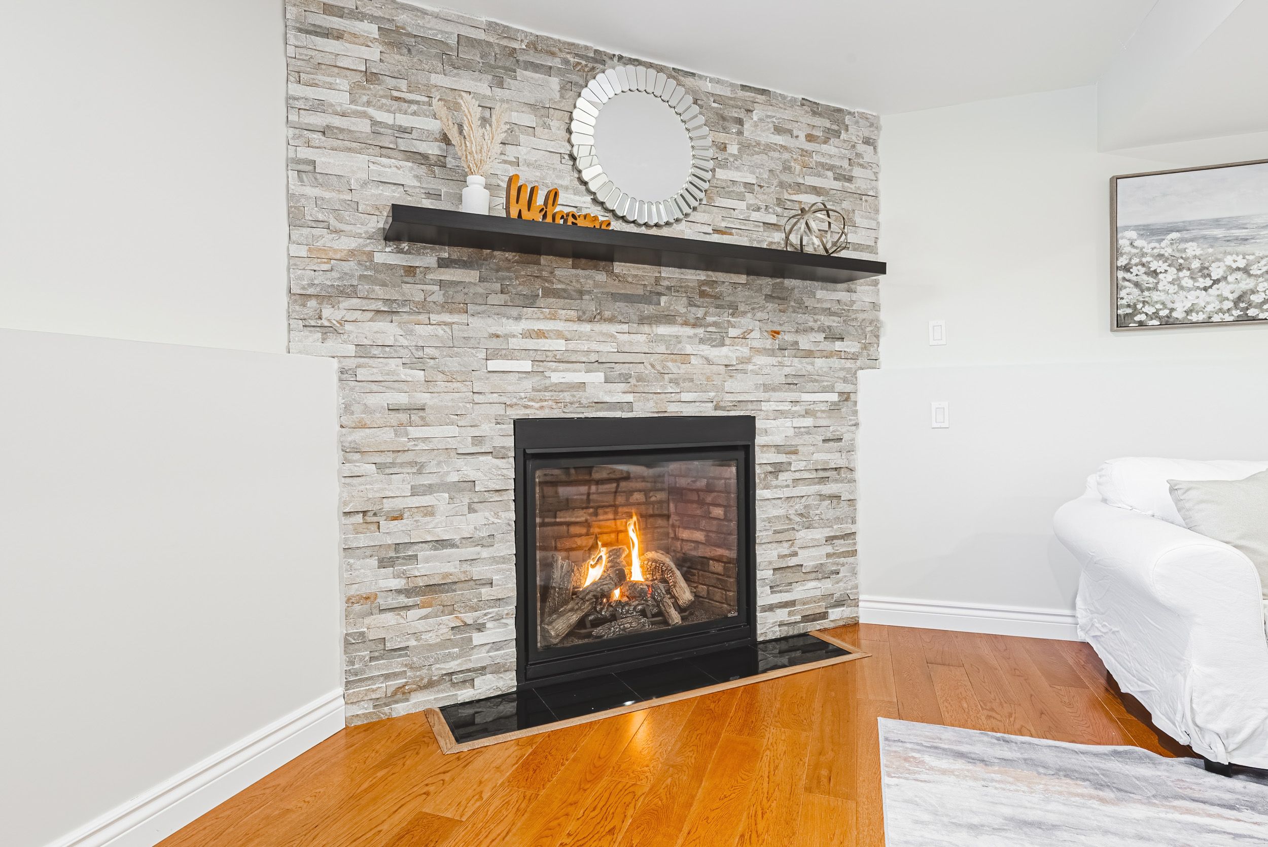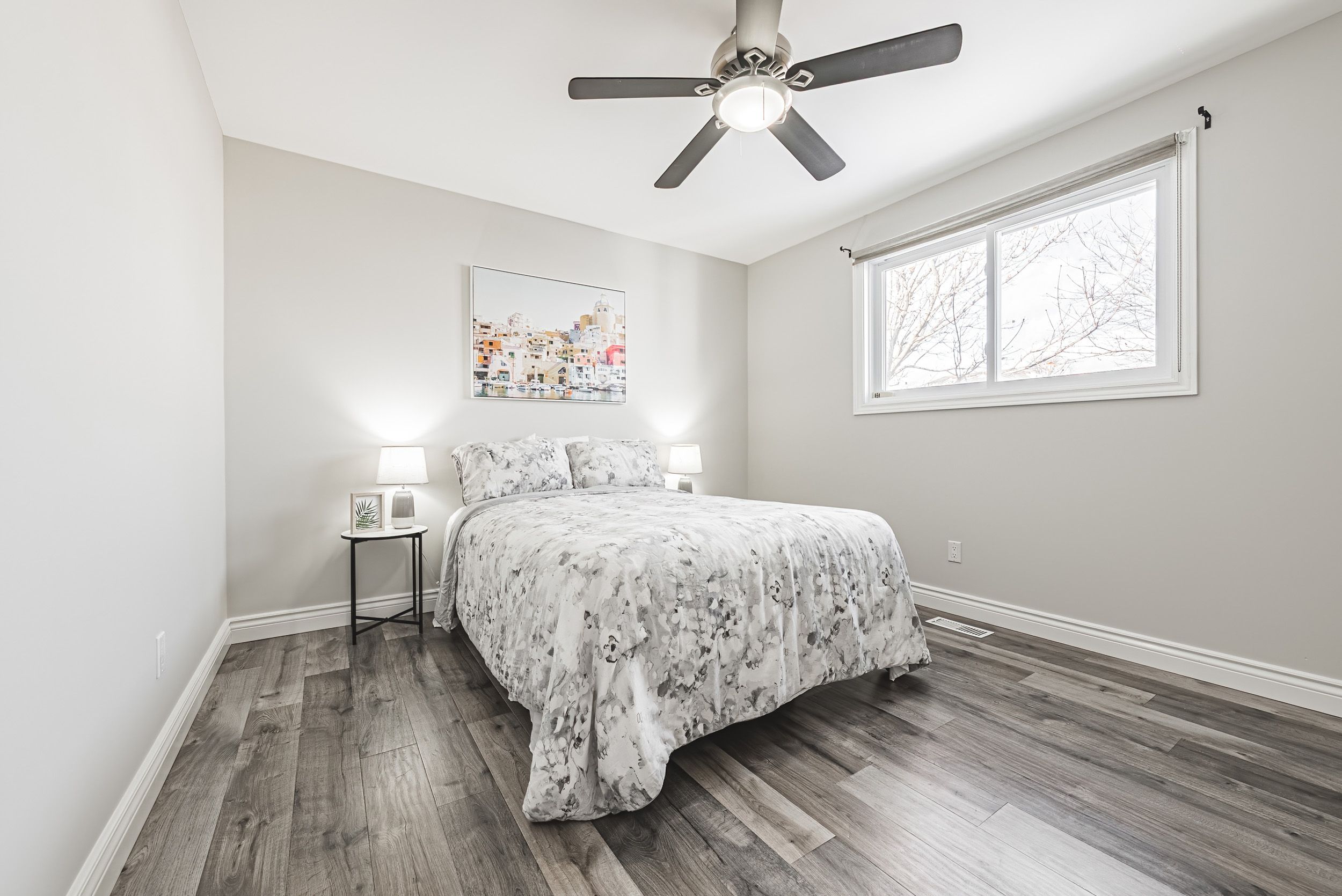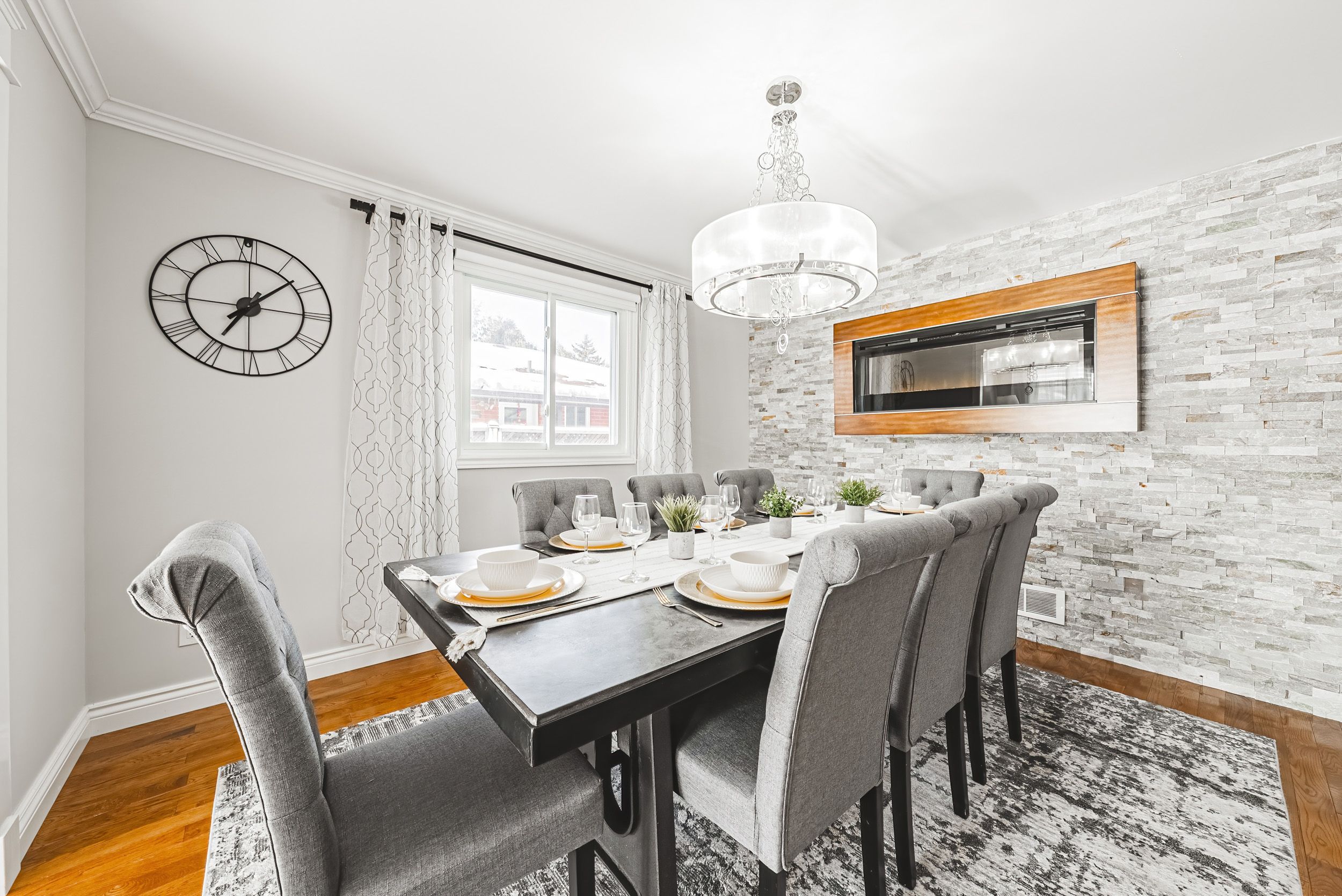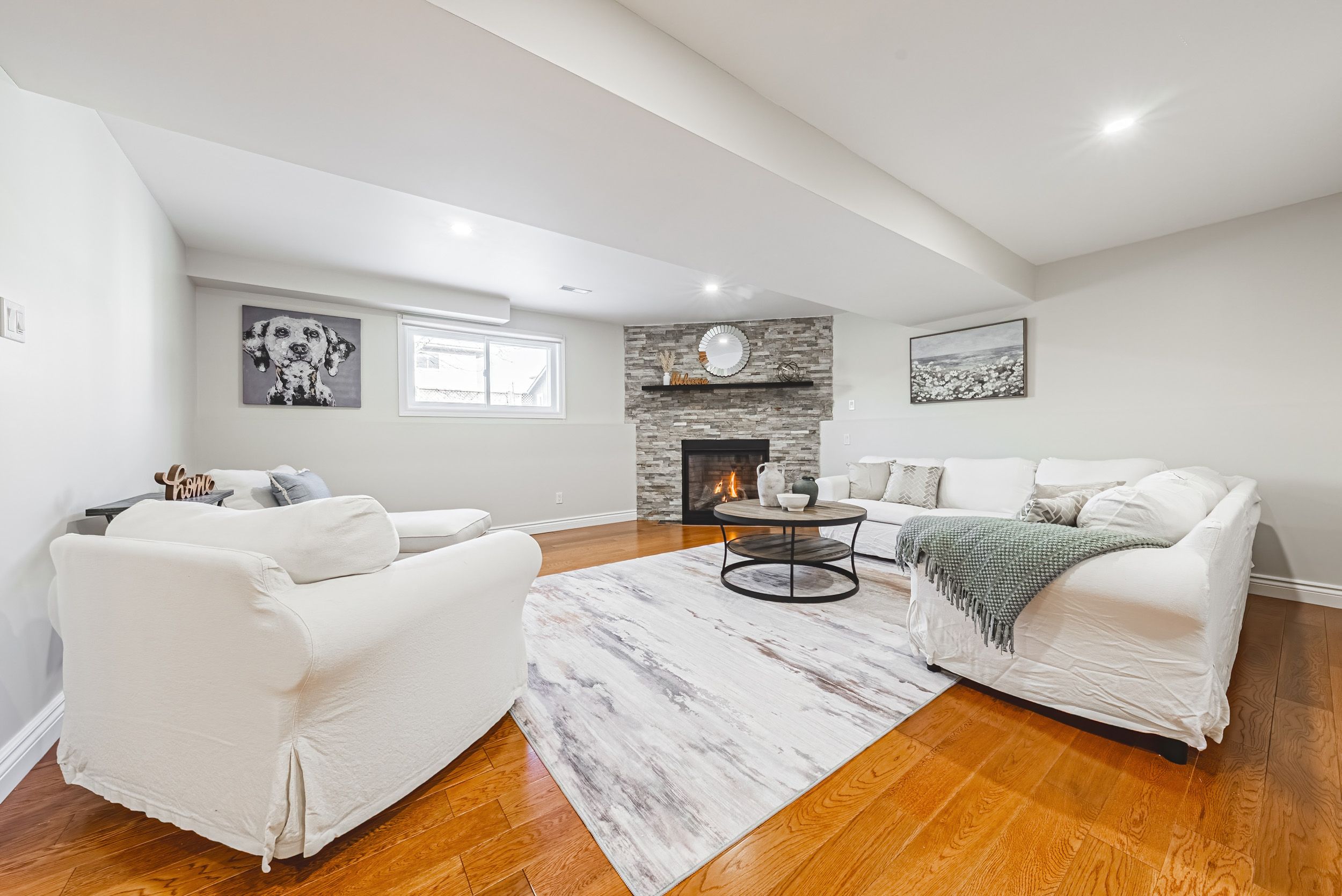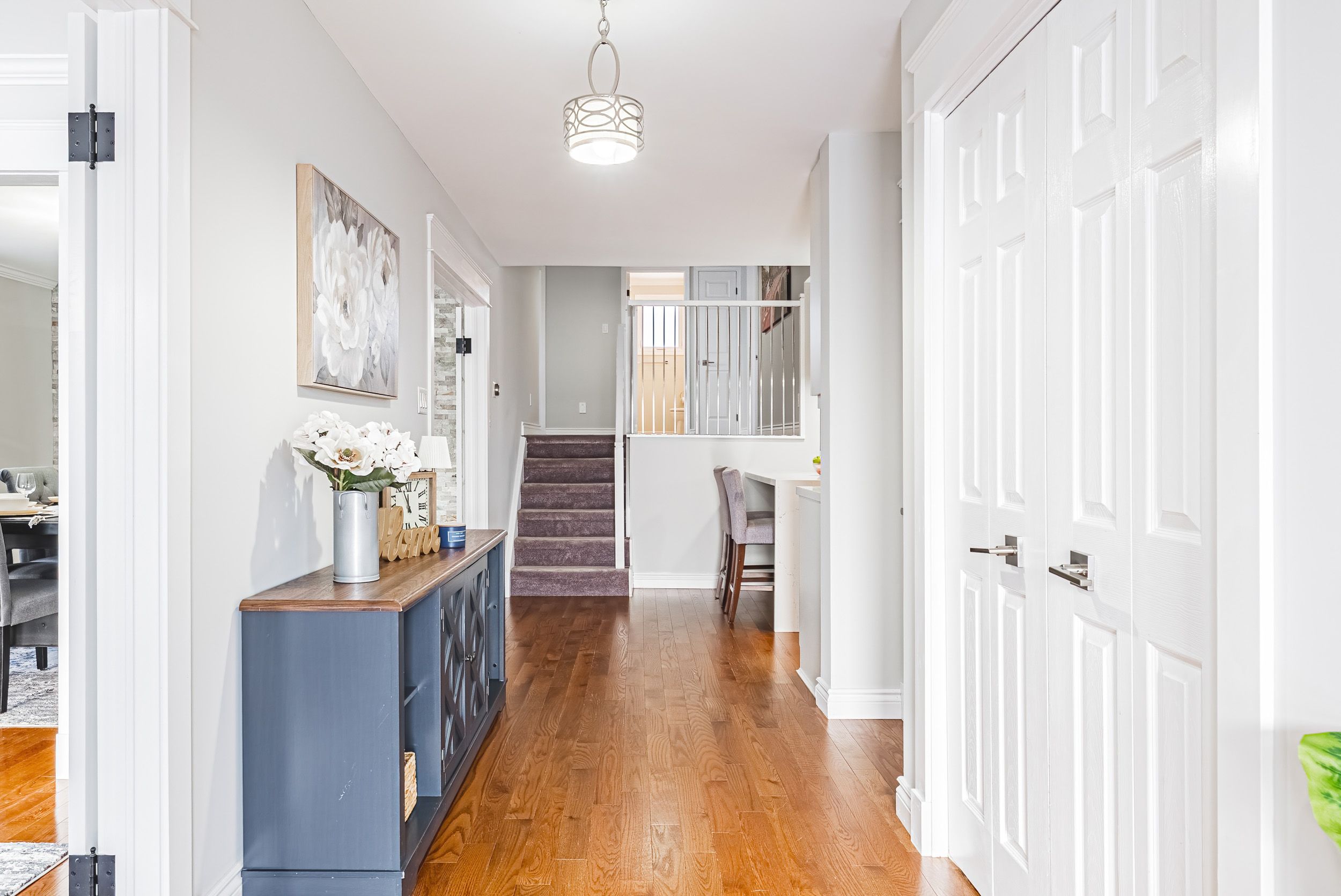 Beautifully maintained 4-bedroom, 2-bathroom backsplit with double garage, offering an impressive amount of finished living space across four levels in the prestigious leckie park community of upper stoney creek. This home delivers a bright, functional layout with designated living, dining, and kitchen areas that create an ideal flow for everyday living and entertaining. The updated white kitchen showcases quartz countertops, stainless steel appliances, an island, custom cabinetry, crown moulding, and thoughtful storage touches, including a built-in spice drawer. The dining area is warm and inviting with hardwood floors throughout and ambient fireplace providing a turnkey setup for hosting family and friends. The upper level offers three comfortable bedrooms and a stylish 4-piece bathroom. The lower levels offer exceptional versatility, featuring a spacious family room with a gas fireplace, an additional bedroom, and a full 4-piece bathroom. The basement continues to impress with an updated laundry room, separate utility room, and an additional recreation space. Outside, the property boasts excellent curb appeal with a double-wide driveway and a fully fenced backyard complete with cedar decking, green space, garden shed and two electric retractable awnings for effortless comfort. The attached double garage is a standout feature with its epoxy finished flooring, clean, durable and ideal for storage or a workshop setup. Ideally located near parks, trails, grocery stores, restaurants, community centre, cineplex theatres, and offering quick access to the linc, redhill, and qew.