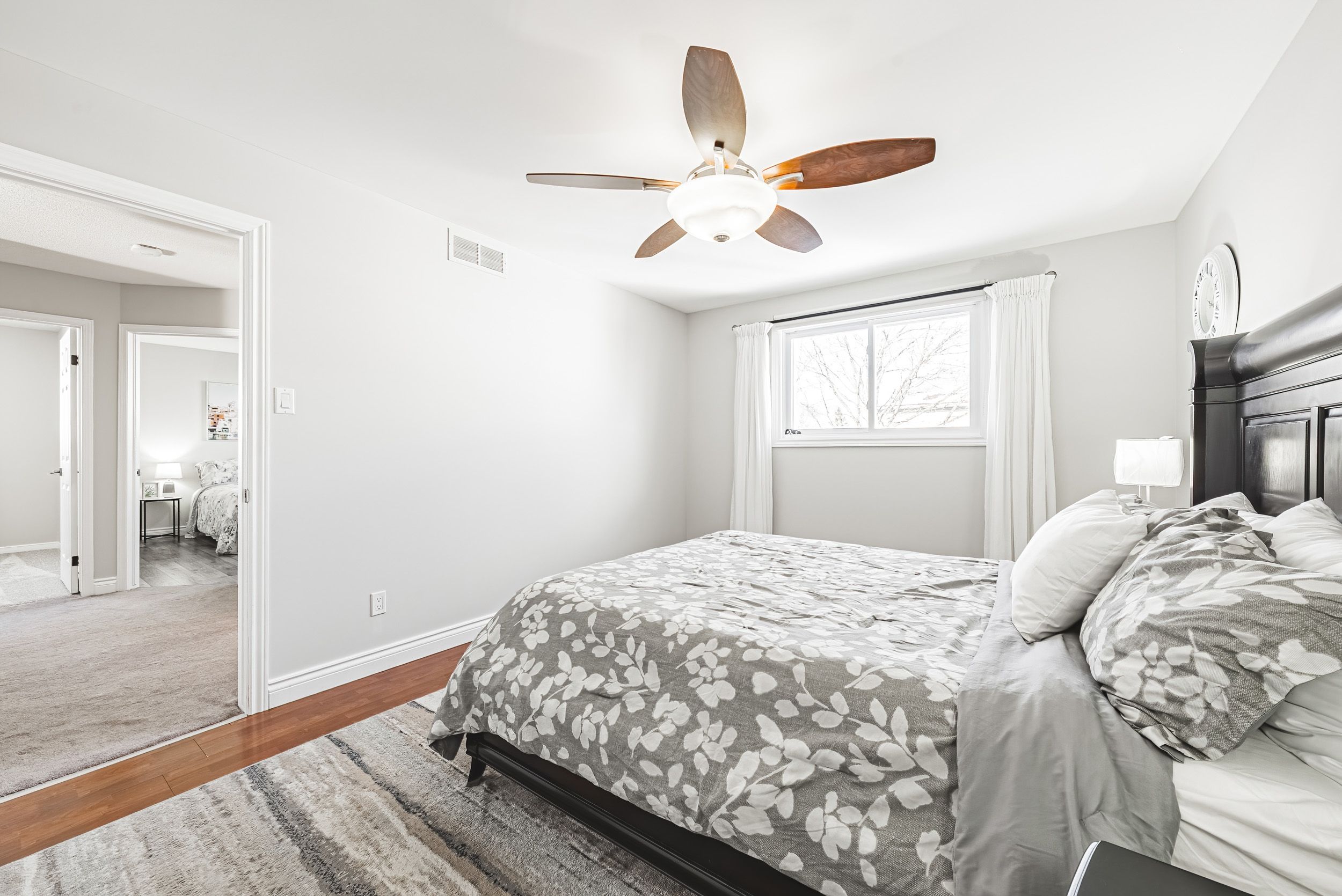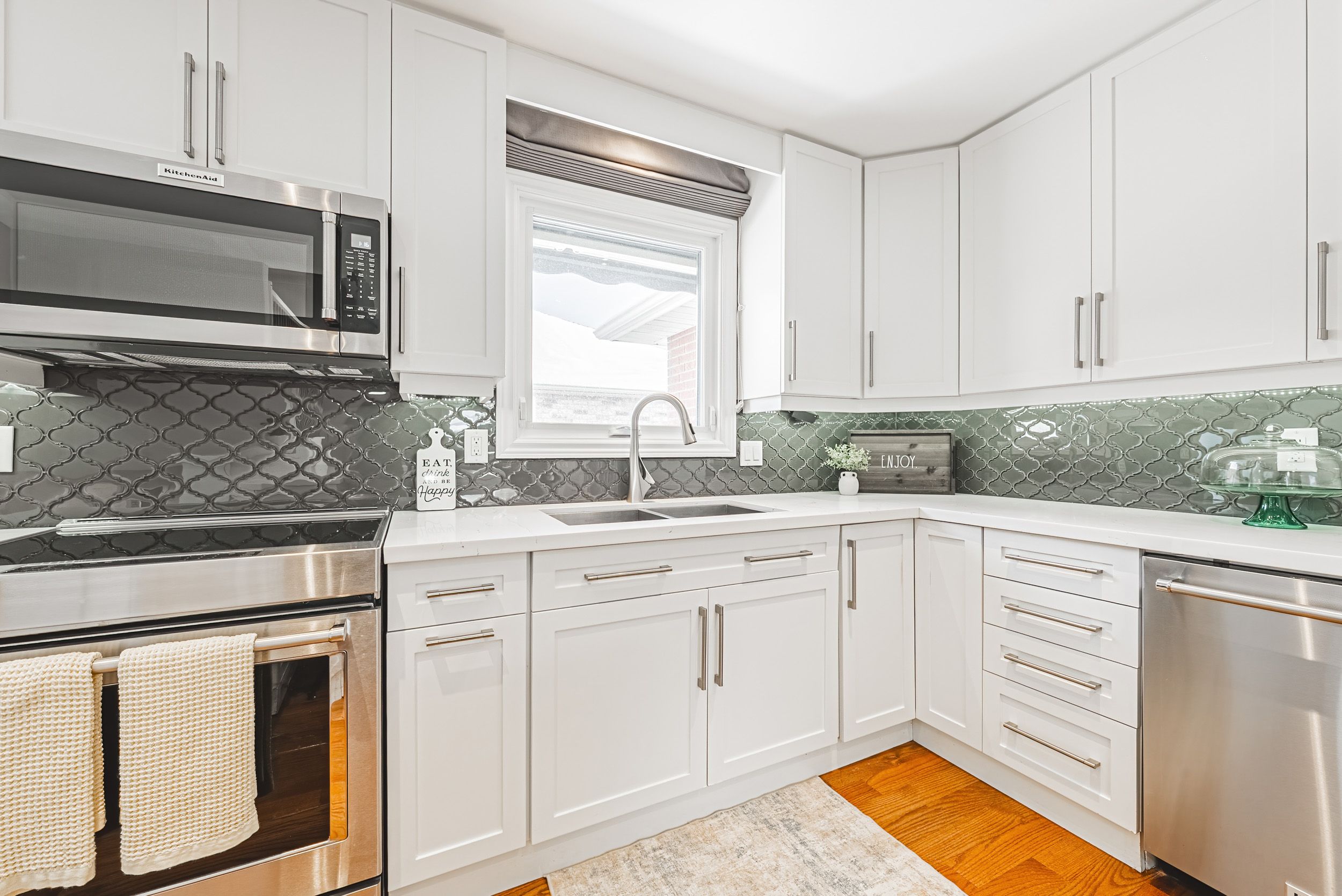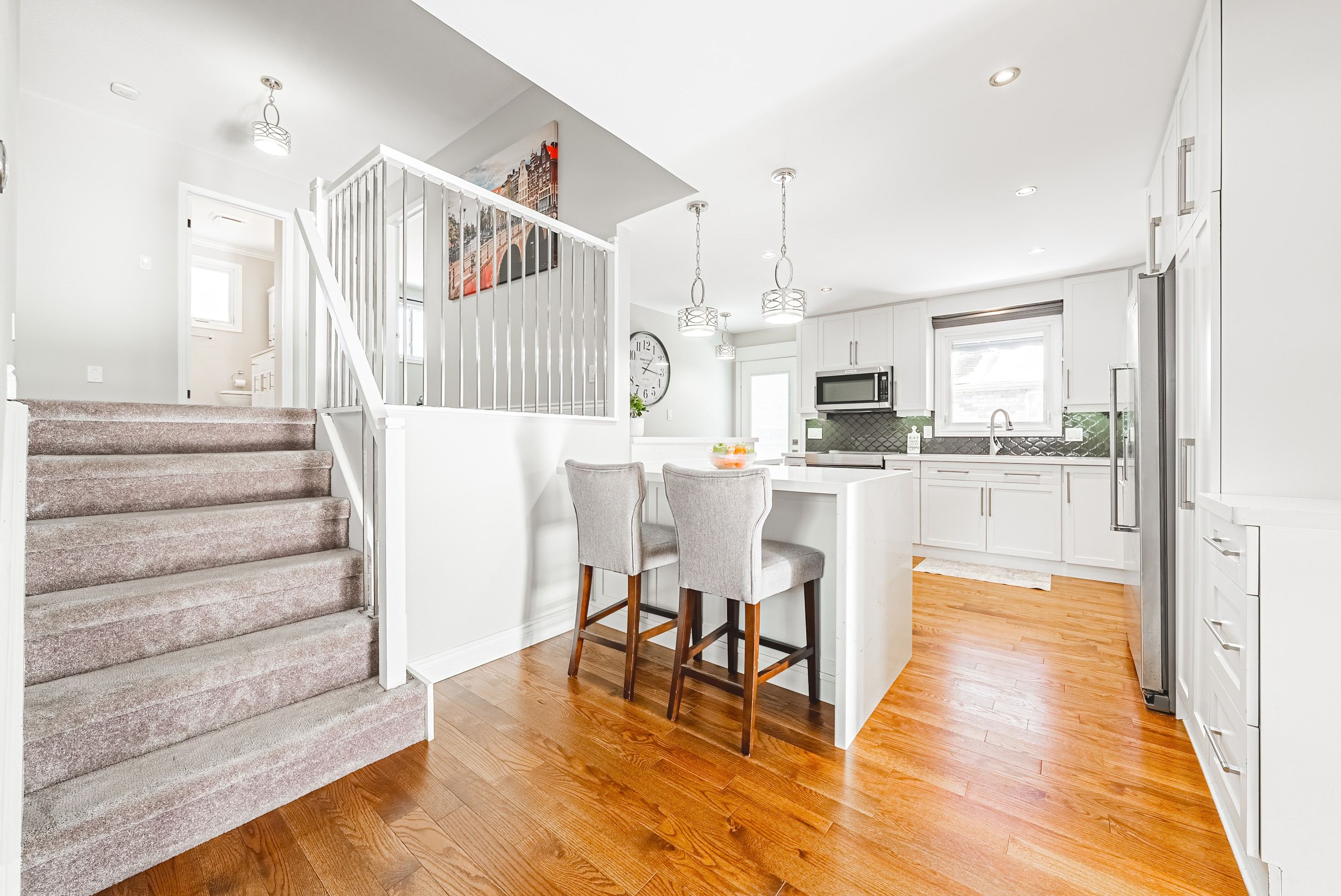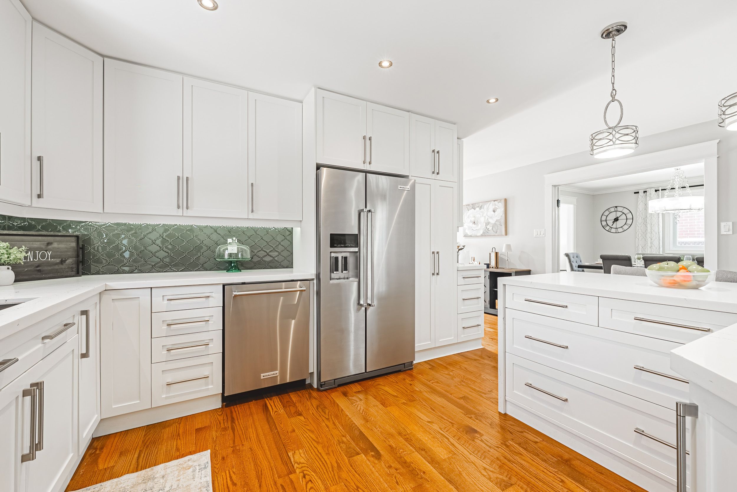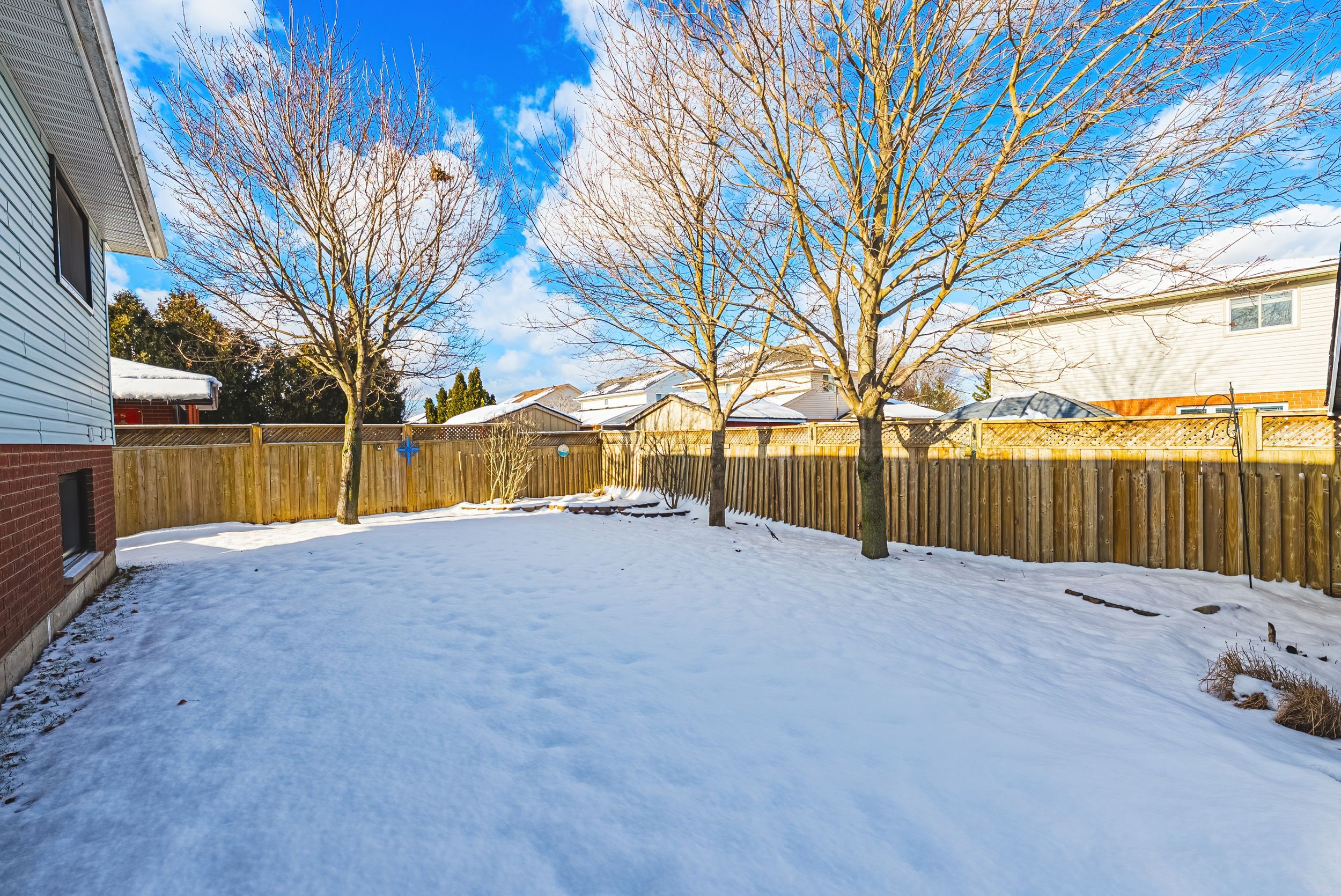 Beautifully maintained 4-bedroom, 2-bathroom backsplit with double garage, offering an impressive amount of finished living space across four levels in the prestigious leckie park community of upper stoney creek. This home delivers a bright, functional layout with designated living, dining, and kitchen areas that create an ideal flow for everyday living and entertaining. The updated white kitchen showcases quartz countertops, stainless steel appliances, an island, custom cabinetry, crown moulding, and thoughtful storage touches, including a built-in spice drawer. The dining area is warm and inviting with hardwood floors throughout and ambient fireplace providing a turnkey setup for hosting family and friends. The upper level offers three comfortable bedrooms and a stylish 4-piece bathroom. The lower levels offer exceptional versatility, featuring a spacious family room with a gas fireplace, an additional bedroom, and a full 4-piece bathroom. The basement continues to impress with an updated laundry room, separate utility room, and an additional recreation space. Outside, the property boasts excellent curb appeal with a double-wide driveway and a fully fenced backyard complete with cedar decking, green space, garden shed and two electric retractable awnings for effortless comfort. The attached double garage is a standout feature with its epoxy finished flooring, clean, durable and ideal for storage or a workshop setup. Ideally located near parks, trails, grocery stores, restaurants, community centre, cineplex theatres, and offering quick access to the linc, redhill, and qew.