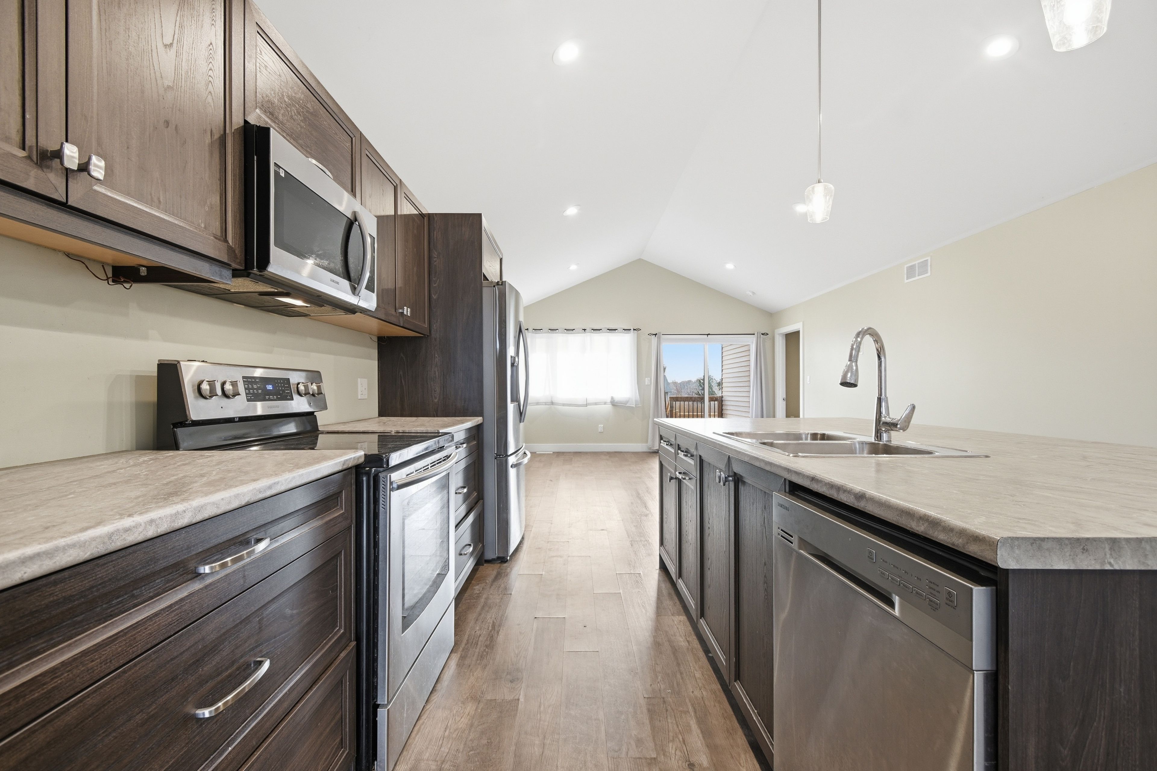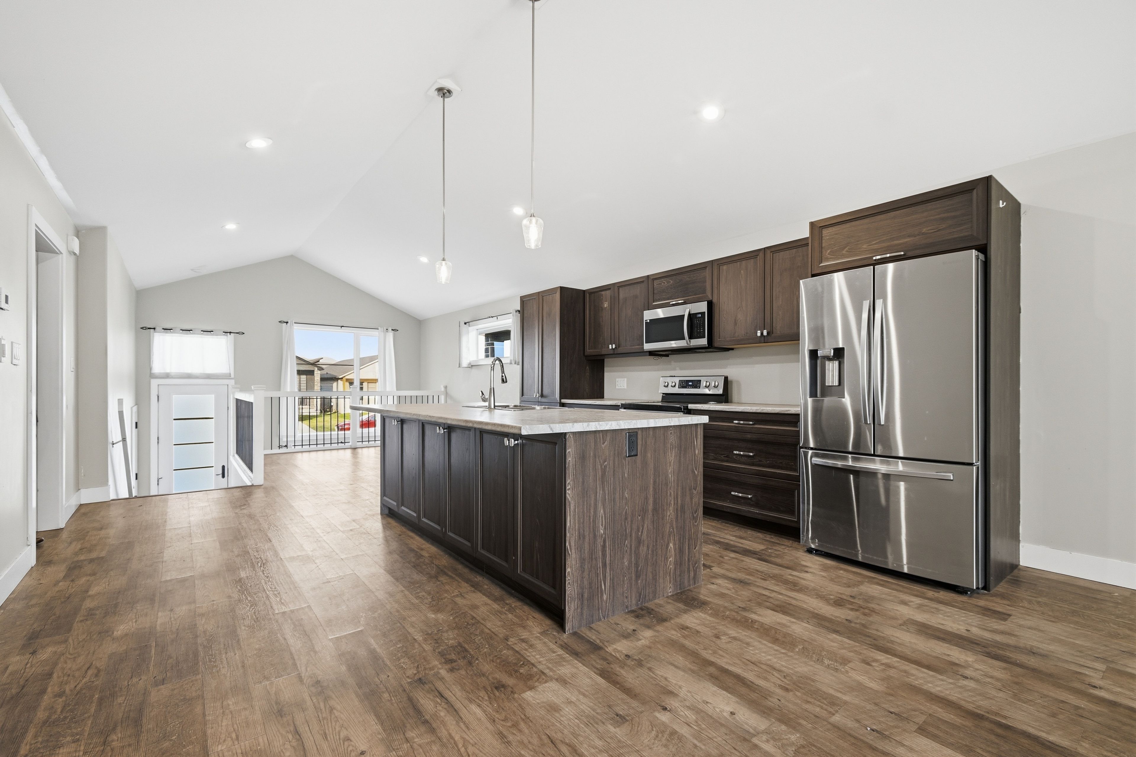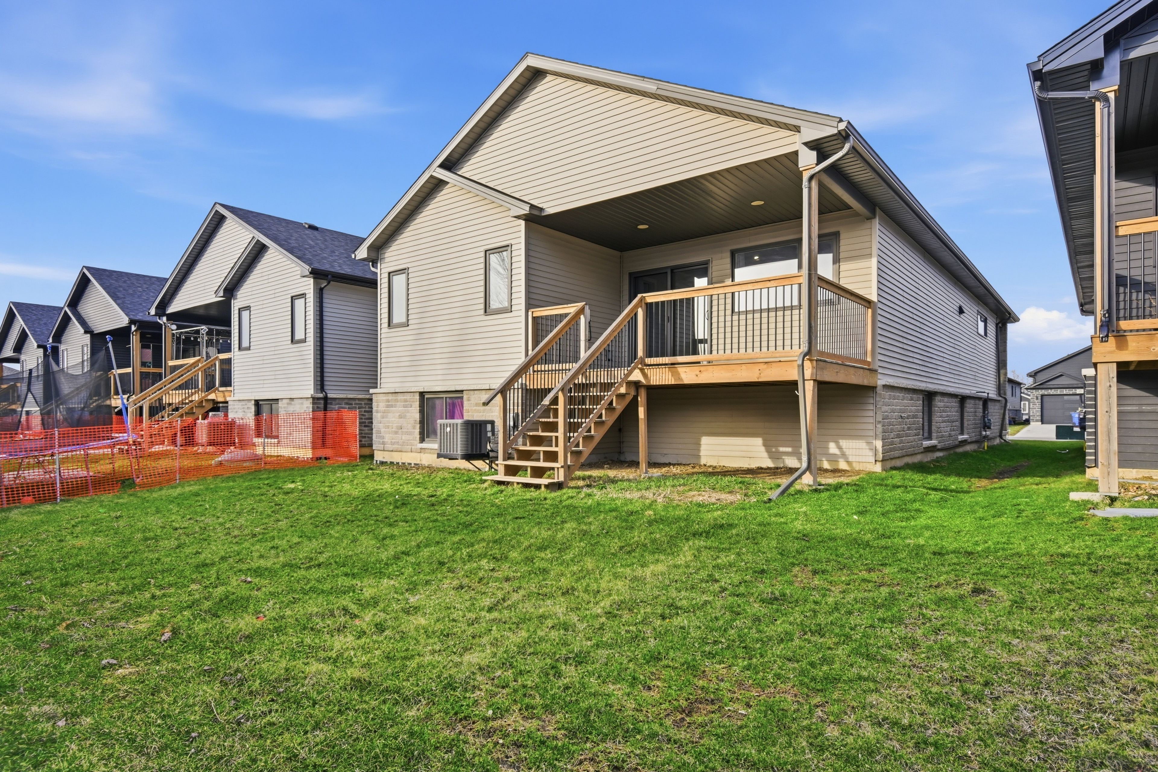 **modern raised ranch built in 2022** welcome to this bright and thoughtfully designed bungalow offering open-concept living, with vaulted ceilings & premium layout, modern finishes, and excellent potential with an unfinished basement. **open-concept main level with vaulted ceilings** enjoy a sun-filled living room with a large front window and seamless walk-out to a wooden deck with covered porch - perfect for relaxing or entertaining. The central kitchen features a large island, stainless steel appliances including fridge, stove, built-in microwave, and dishwasher, flowing into a spacious eat-in area with vaulted ceilings and vinyl flooring. The primary bedroom offers a walk-in closet and a private 3pc ensuite with a standing shower. Two additional bedrooms with closets and vinyl flooring are serviced by a 4pc main bathroom. Functional layout and natural light make this home ideal for comfortable everyday living.**unfinished lower level- endless potential** the basement features high ceilings, large windows, and a utility room with tankless hot water heater, offering a great opportunity to create additional living space, recreation areas, or an in-law suite tailored to your needs.**great outdoor space & family-friendly setting** the property includes a double front driveway, single-car garage, and a backyard with covered porch and wooden deck - ideal for outdoor enjoyment. Located in a growing chatham community, close to amenities, schools, and parks. A fantastic opportunity for buyers seeking modern bungalow living with room to grow.