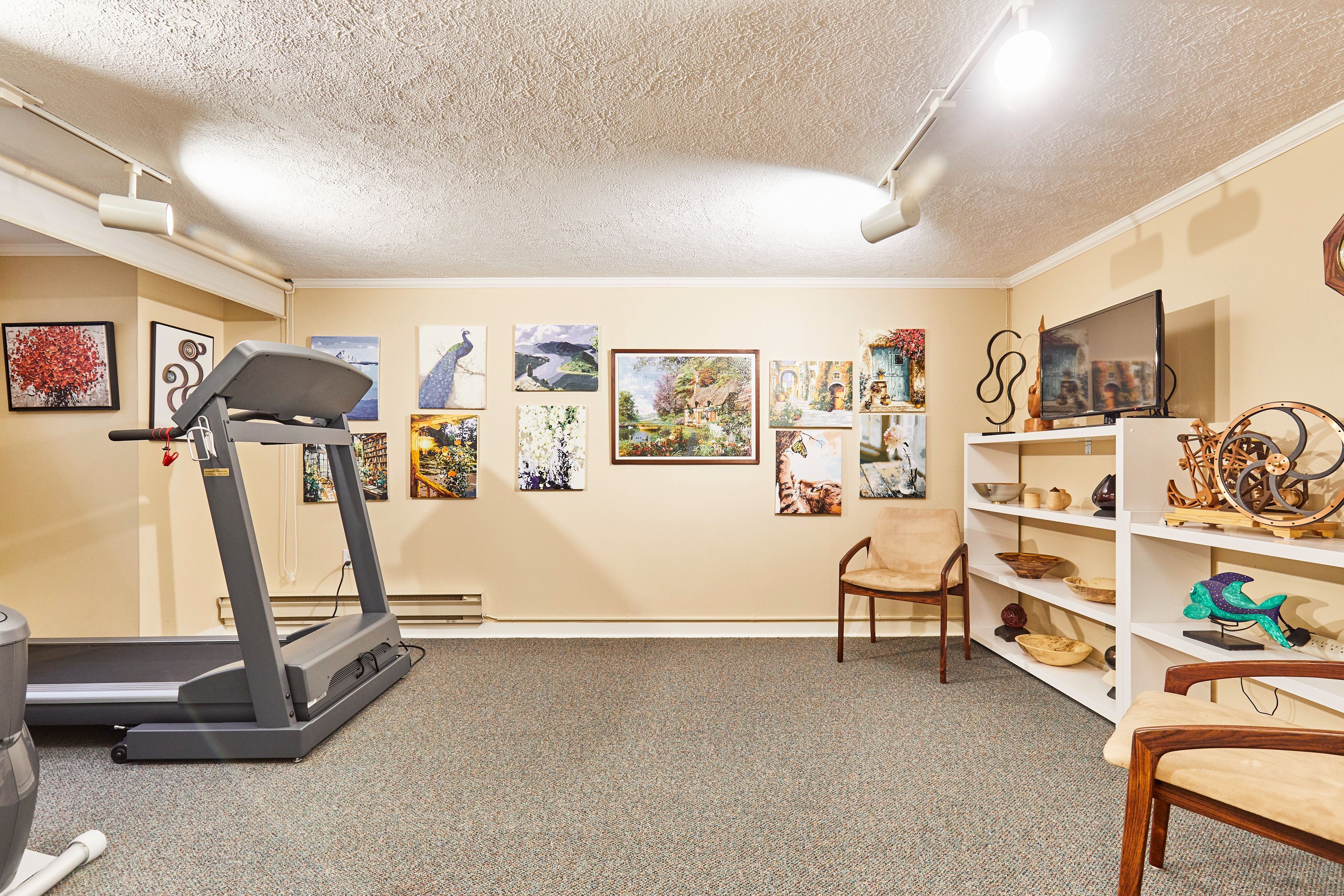 • Lower level rec room, gym space, and ample storage options available.