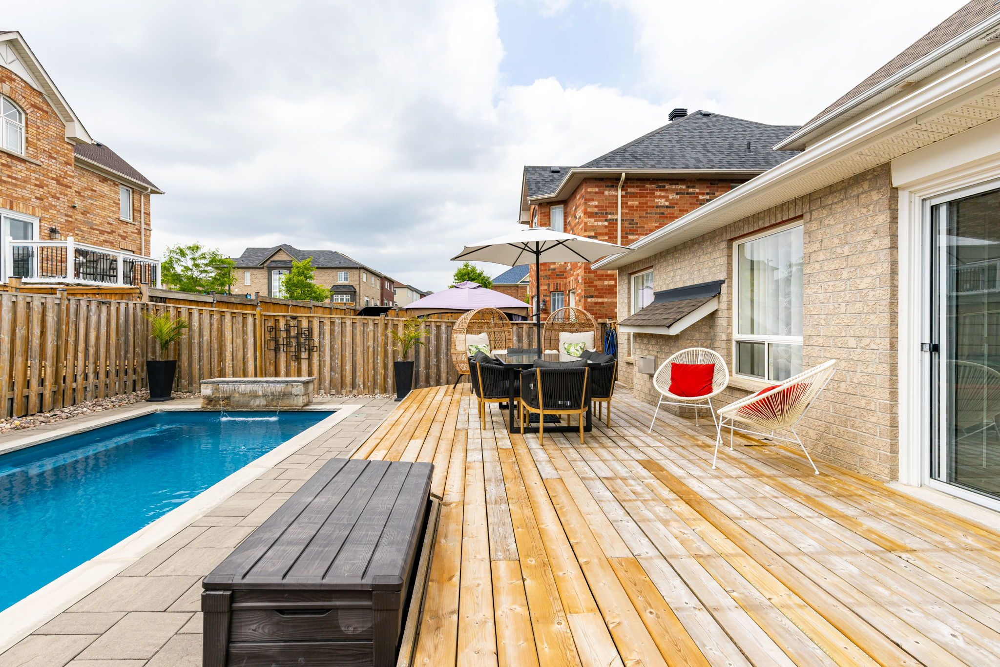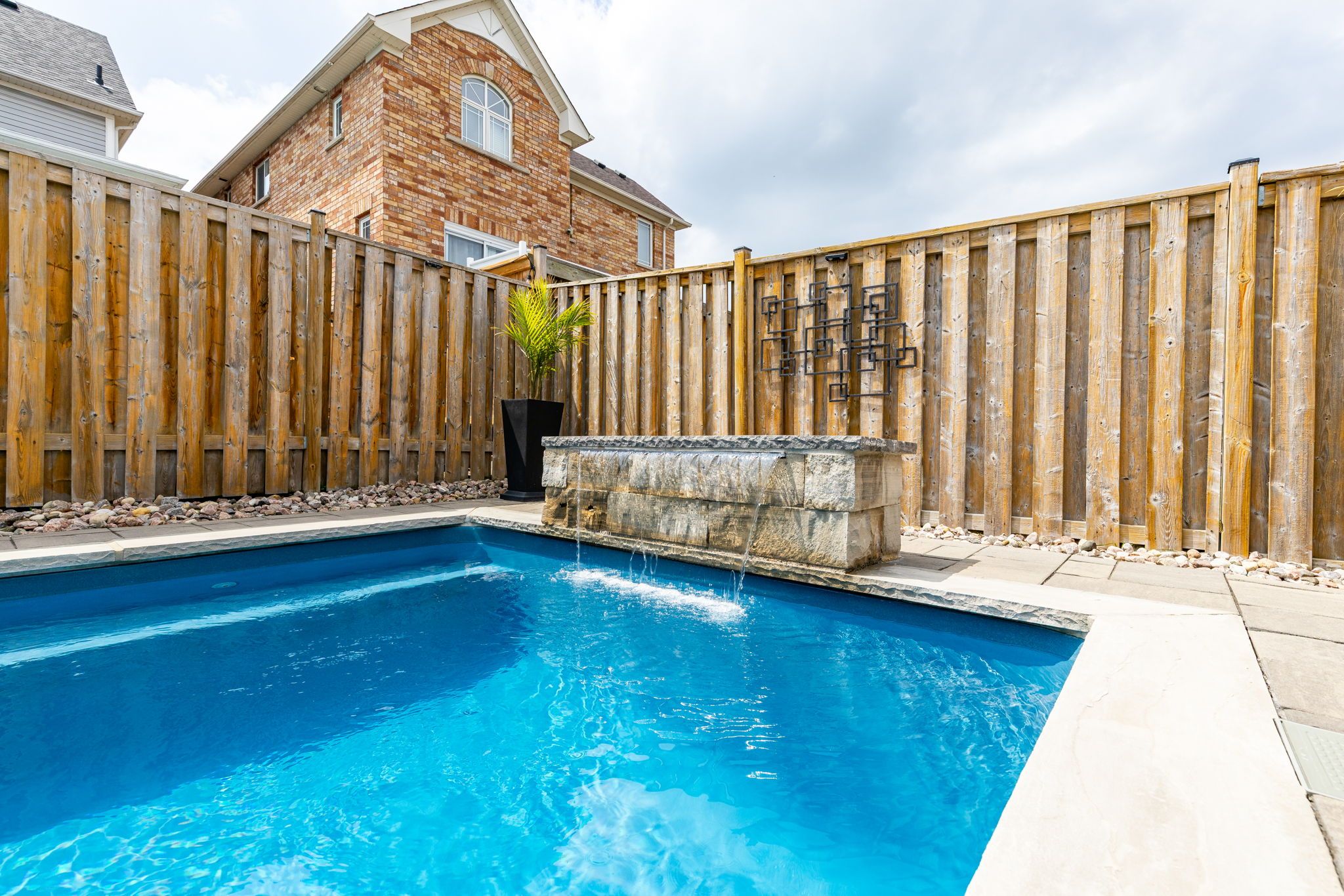 • Beautiful backyard with stone landscaping and a heated saltwater pool.