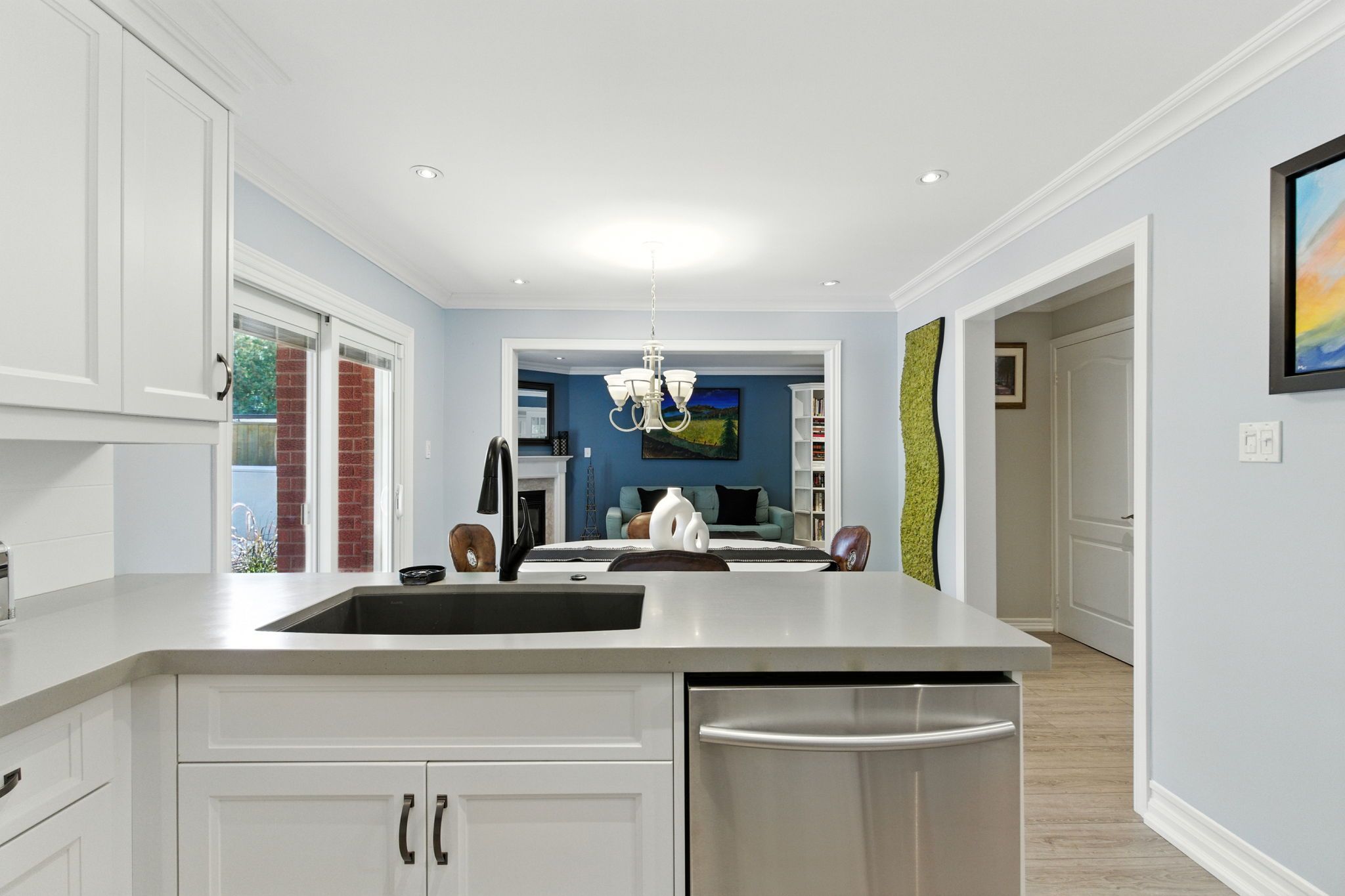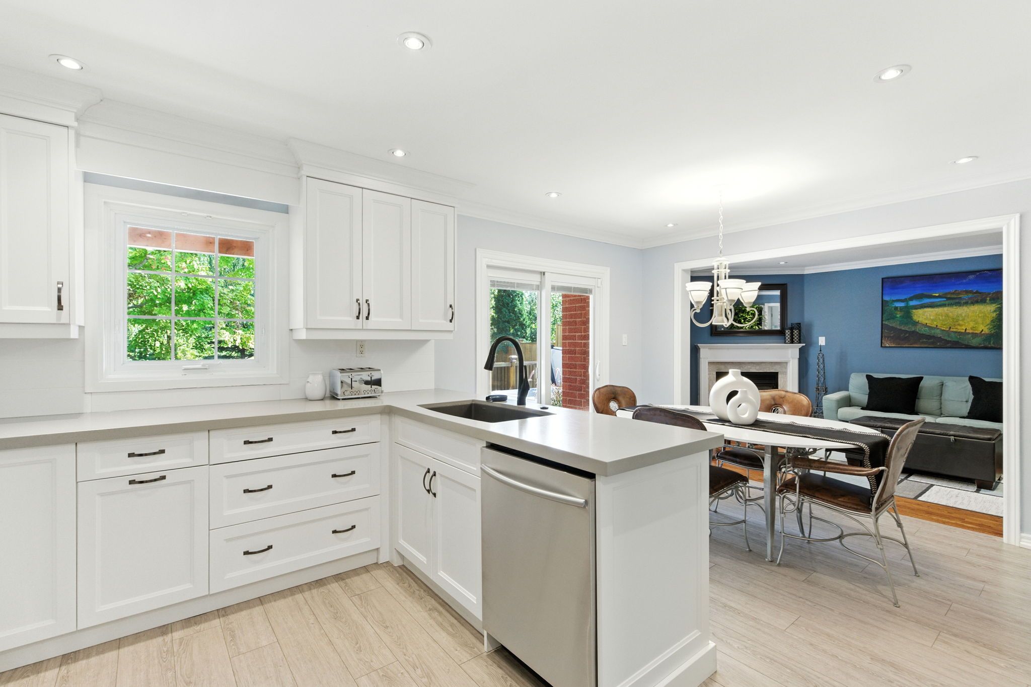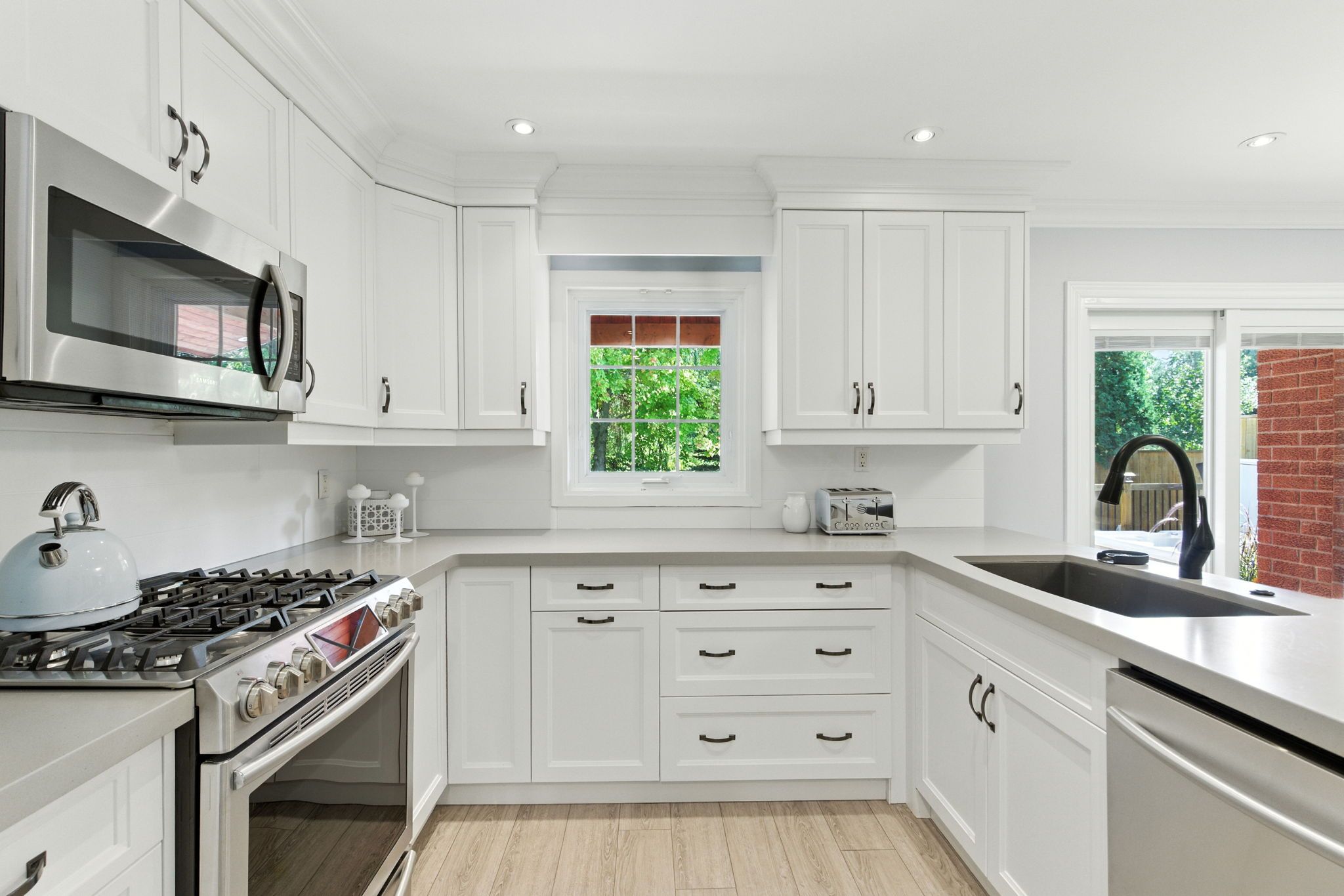 • Renovated eat-in kitchen equipped with modern appliances and gas range.