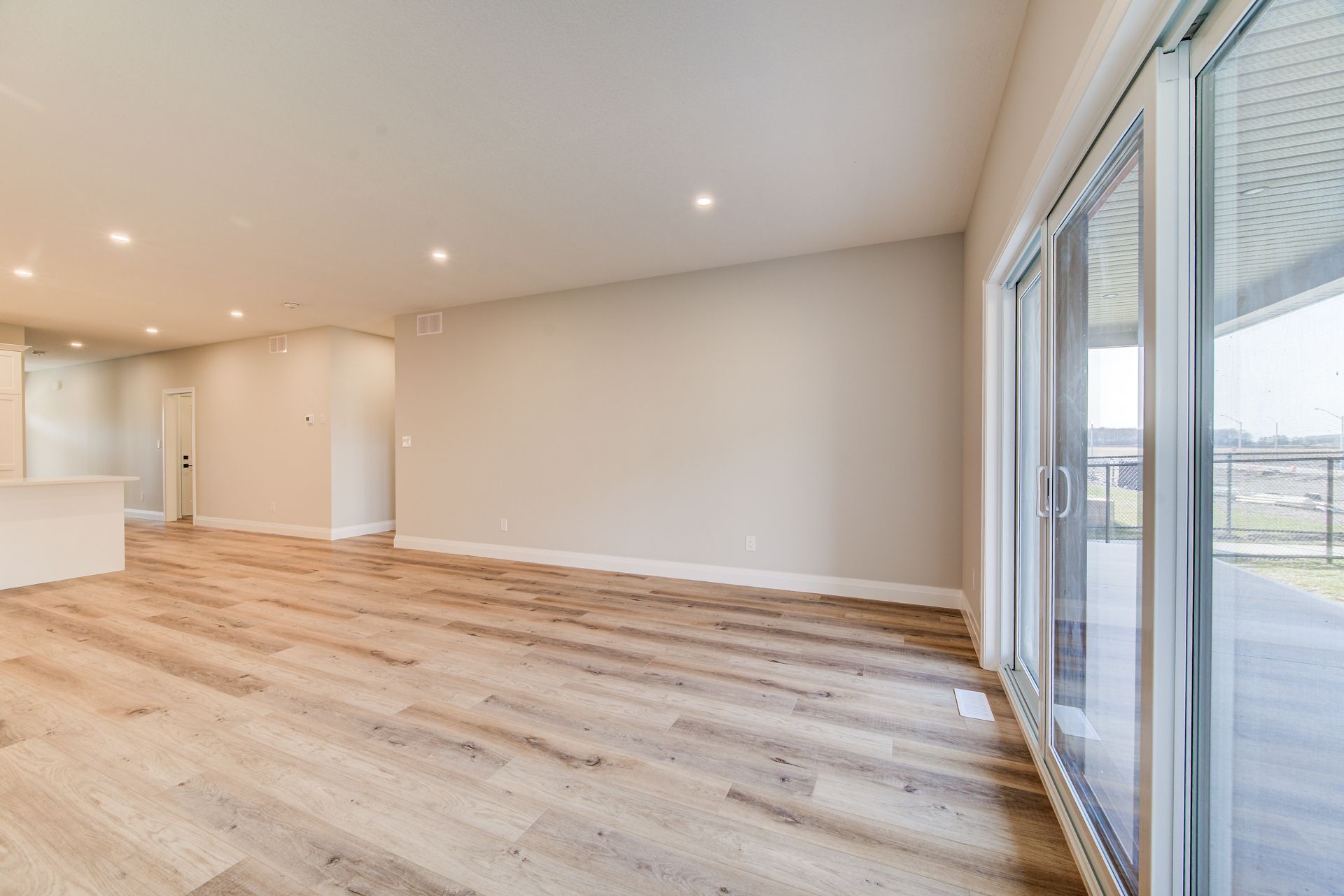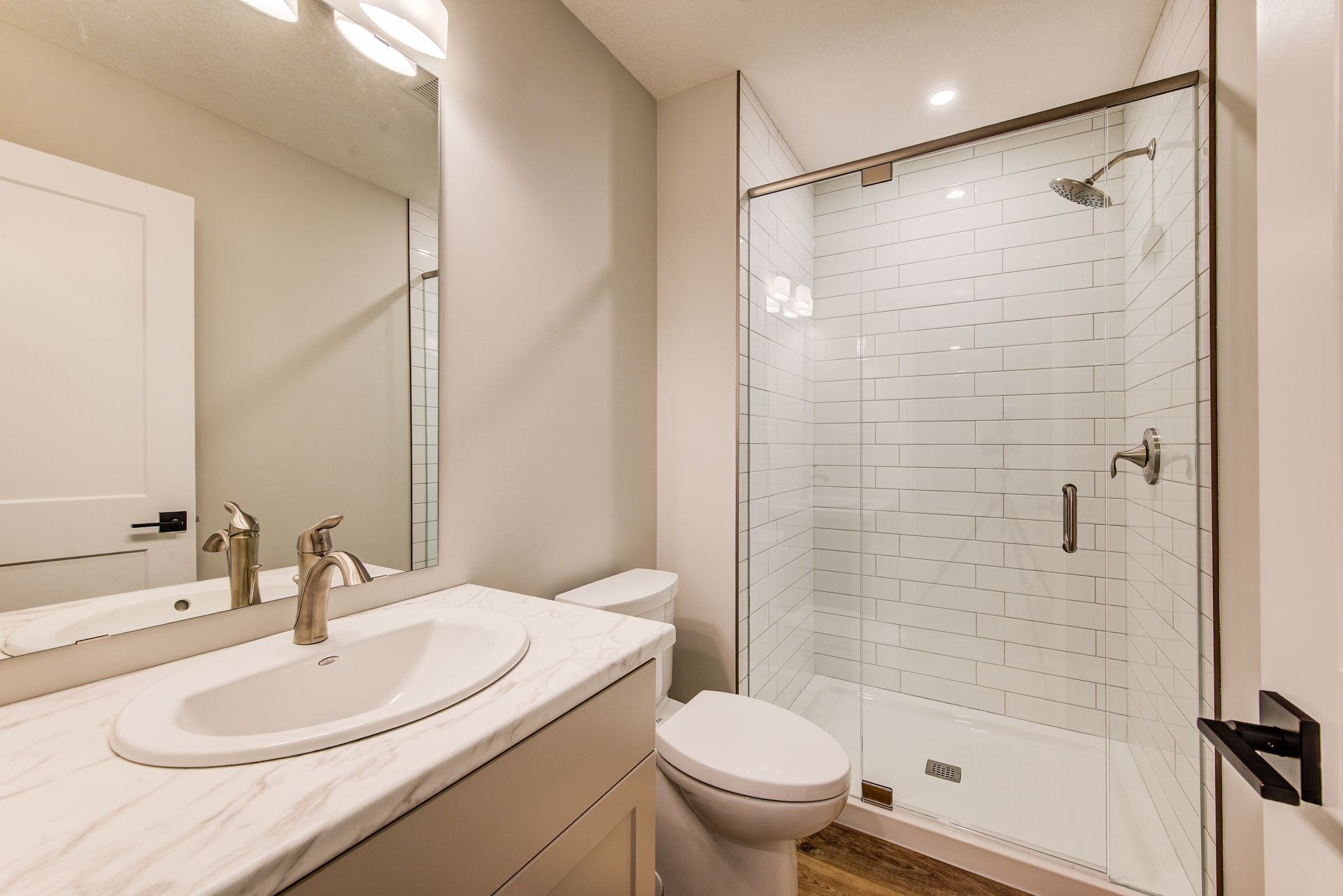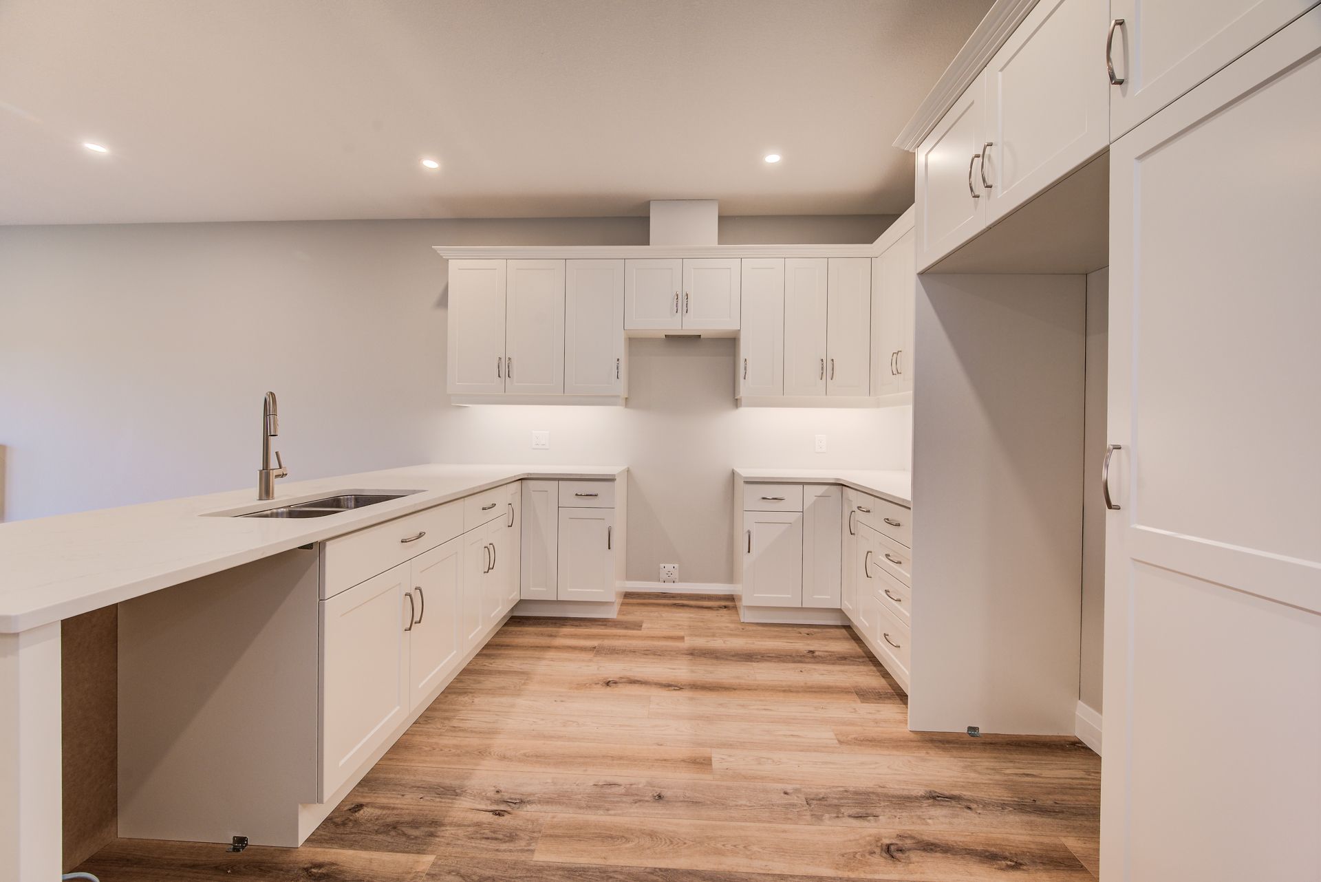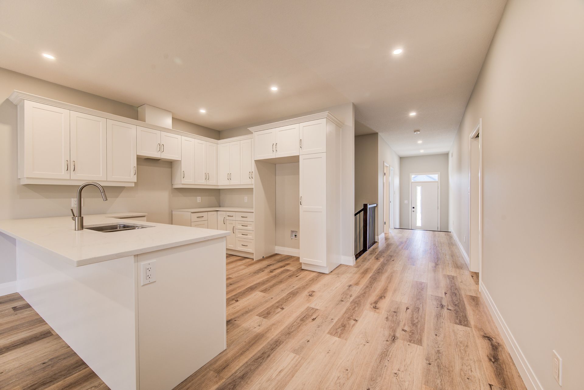 • Custom kitchen features quartz countertops and upgraded fixtures.