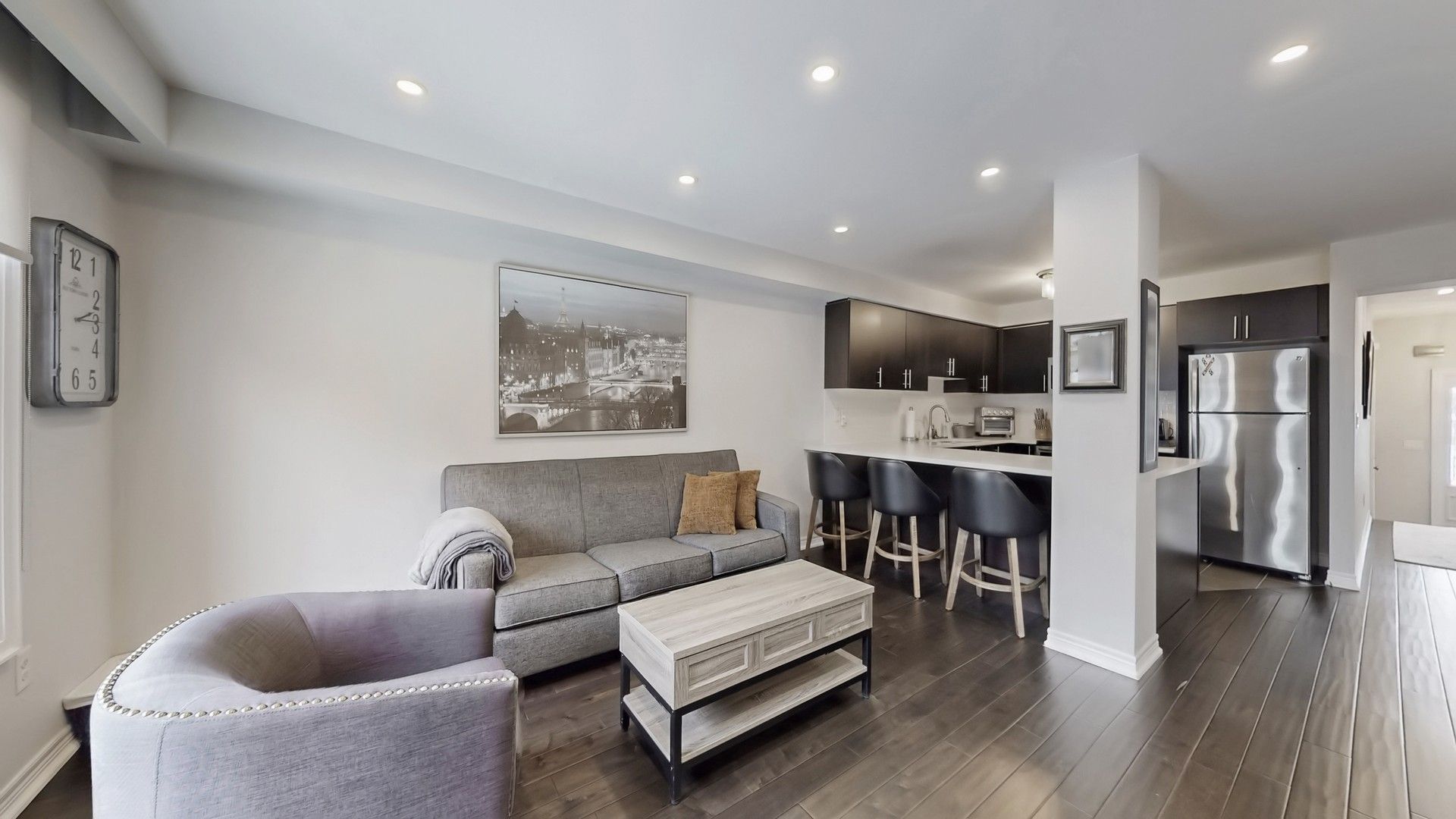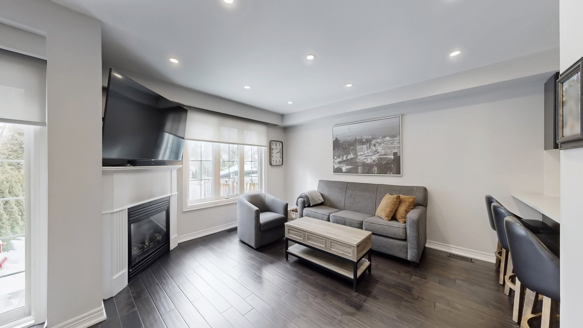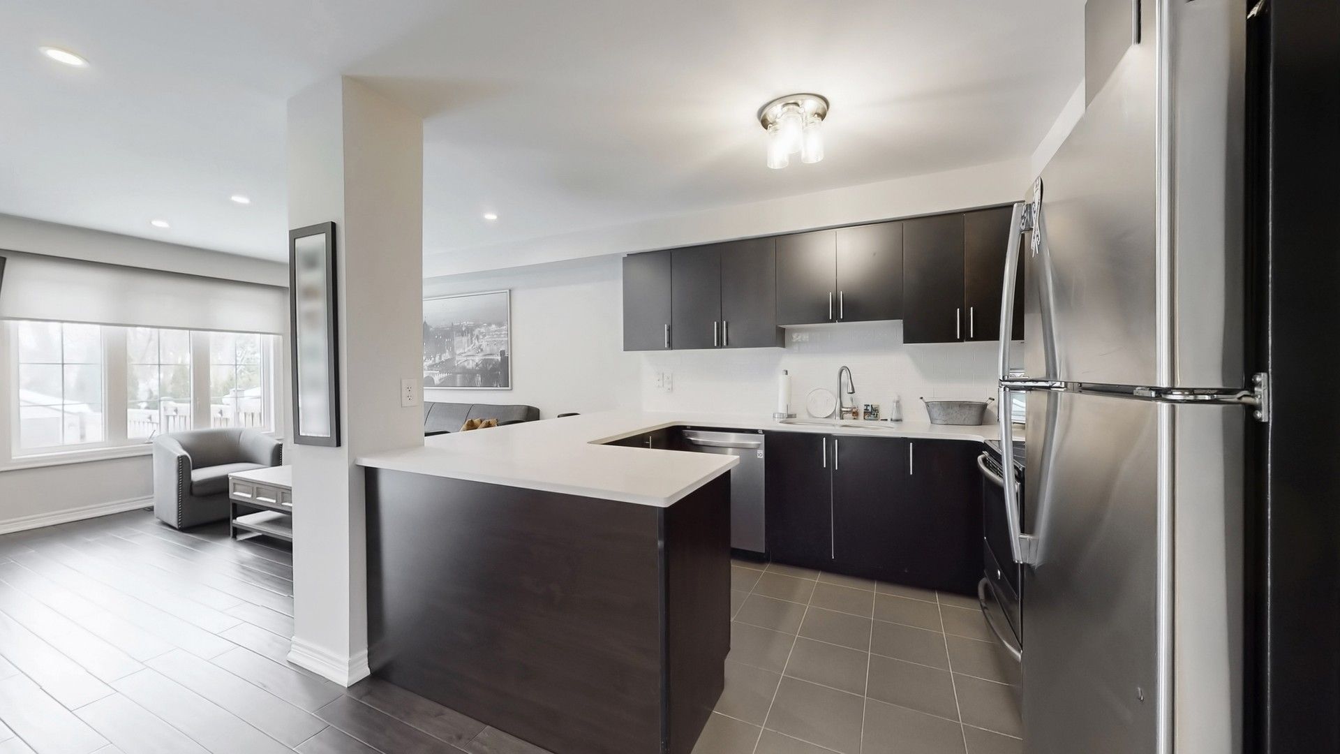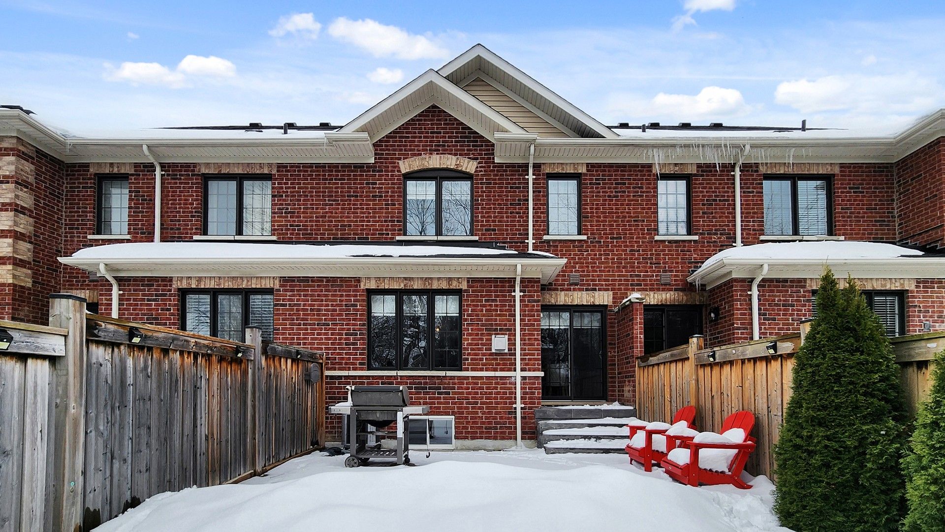 Step into the sought-after brooklyn model freehold townhome located in the highly desirable brooklin community of north whitby, known for its family-friendly streets, newer homes, top schools, and easy access to hwy 407 & 412. This stunning 3-bedroom home offers a fantastic open layout with extensive upgrades throughout. The main floor features smooth ceilings, gorgeous hand-scraped hardwood flooring, and a cozy gas fireplace, creating the perfect space for entertaining or relaxing. The upgraded chef's kitchen includes quartz countertops, undermount sink, crackled pearl backsplash, stainless steel appliances, and upgraded faucet, all thoughtfully designed for style and functionality. Upstairs you'll find spacious bedrooms, an elegant oak staircase with wrought iron pickets, upgraded trim, fresh professional paint, and premium custom window coverings including sunscreen roller shades on the main floor, vinyl plantation shutters in the front bedrooms, and custom roman shades in the primary bedroom and ensuite. The finished garage is ideal for any car enthusiast with epoxy floors and metal checker-plate baseboards, plus extra driveway parking. The basement is 95% complete, needing only doors and paint - perfect for a future rec room, gym, or in-law space. Step outside to your private backyard retreat featuring a stone patio (2017), storage shed, mature trees, and no rear neighbours. The home has been professionally landscaped front and back with lovely stonework, offering incredible curb appeal and low-maintenance outdoor living. Located close to schools, parks, public transit, shopping, ems & police services, this home shows true pride of ownership and is completely move-in ready.
