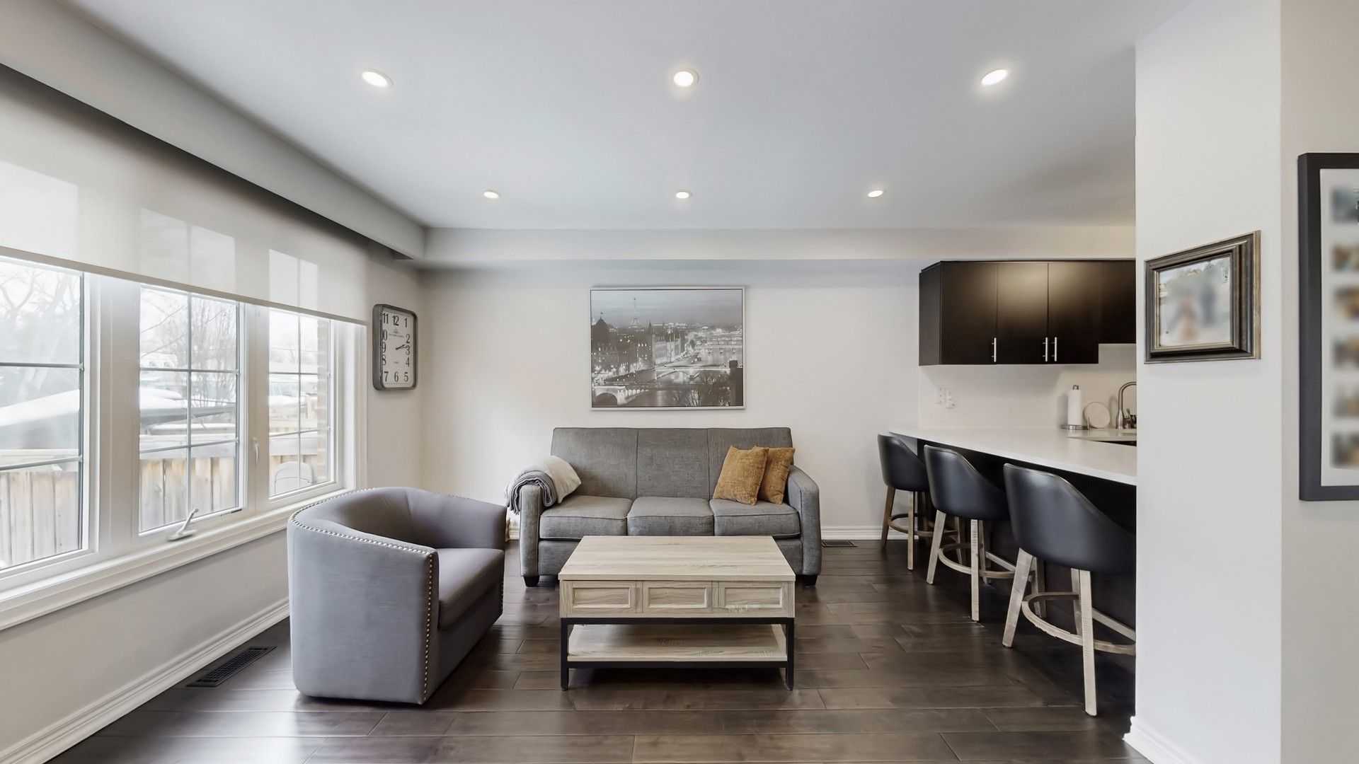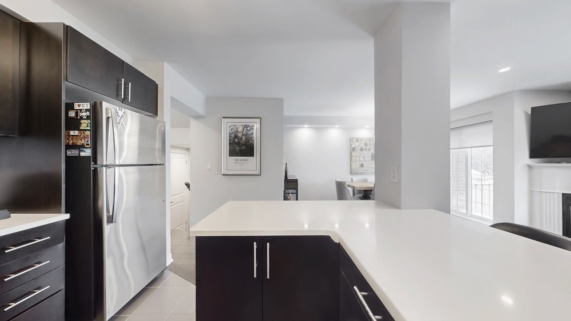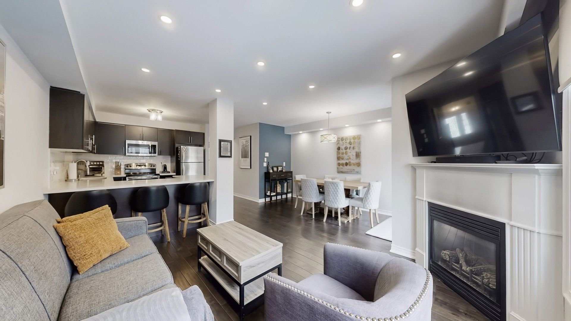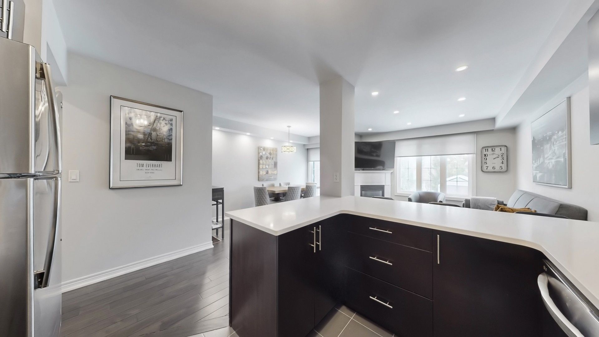 Step into the sought-after brooklyn model freehold townhome located in the highly desirable brooklin community of north whitby, known for its family-friendly streets, newer homes, top schools, and easy access to hwy 407 & 412. This stunning 3-bedroom home offers a fantastic open layout with extensive upgrades throughout. The main floor features smooth ceilings, gorgeous hand-scraped hardwood flooring, and a cozy gas fireplace, creating the perfect space for entertaining or relaxing. The upgraded chef's kitchen includes quartz countertops, undermount sink, crackled pearl backsplash, stainless steel appliances, and upgraded faucet, all thoughtfully designed for style and functionality. Upstairs you'll find spacious bedrooms, an elegant oak staircase with wrought iron pickets, upgraded trim, fresh professional paint, and premium custom window coverings including sunscreen roller shades on the main floor, vinyl plantation shutters in the front bedrooms, and custom roman shades in the primary bedroom and ensuite. The finished garage is ideal for any car enthusiast with epoxy floors and metal checker-plate baseboards, plus extra driveway parking. The basement is 95% complete, needing only doors and paint - perfect for a future rec room, gym, or in-law space. Step outside to your private backyard retreat featuring a stone patio (2017), storage shed, mature trees, and no rear neighbours. The home has been professionally landscaped front and back with lovely stonework, offering incredible curb appeal and low-maintenance outdoor living. Located close to schools, parks, public transit, shopping, ems & police services, this home shows true pride of ownership and is completely move-in ready.