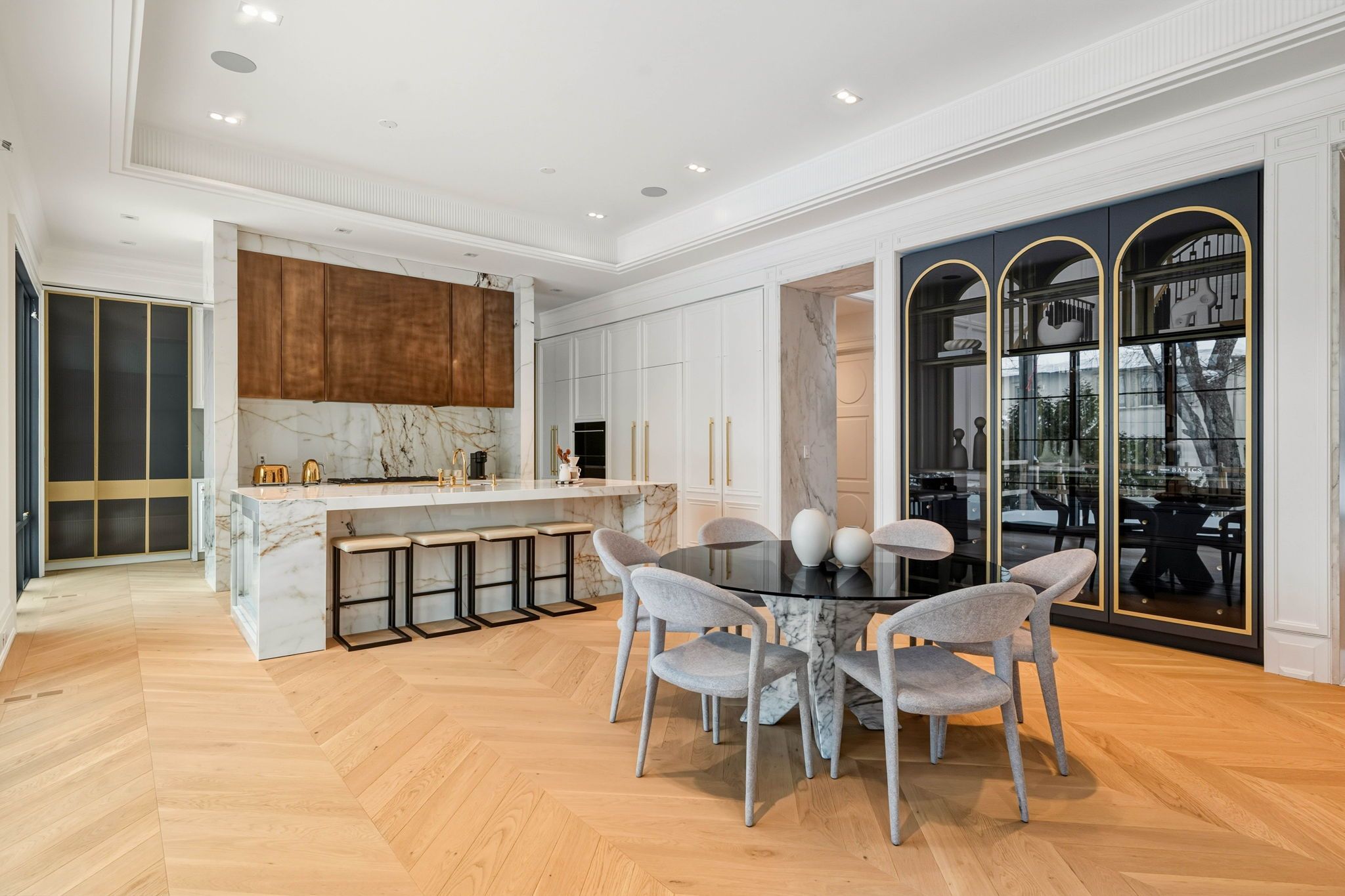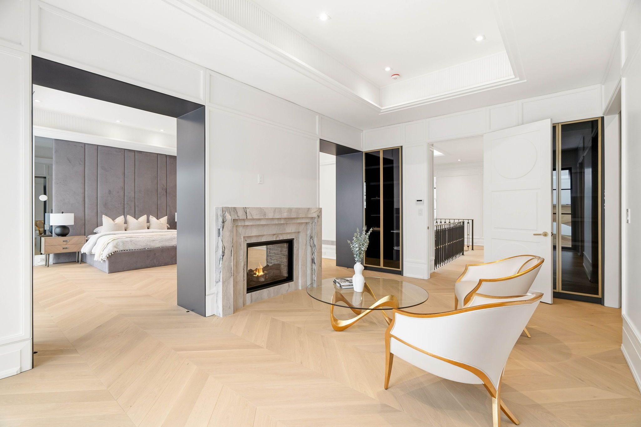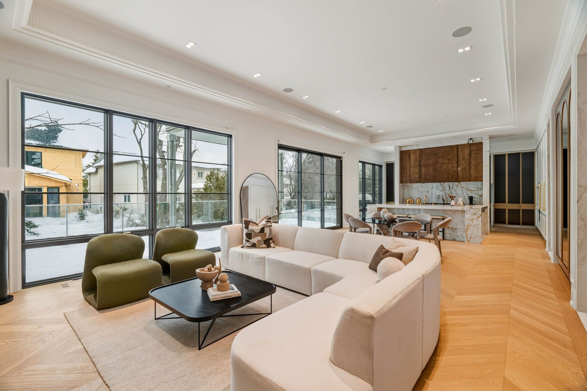 For the bespoke buyer. 1 year new! Builder own - designer palette. St. Andrew-windfields most desirable neighborhoods! Modern home over 8,000 sqft of luxurious living space. Spacious layout and impeccable design with coffered ceilings and custom fluted moulding, french panelling, white oak hardwood and marble tile throughout. The chef's kitchen plus separate prep kitchen, porcelain counters and backsplash, custom cabinetry with brass hardware, large centre island and top-of-the-line appliances, open design breakfast area and family room overlooking the rear gardens with gas fireplace and striking book-matched marble surround. Generously sized dining room, living room, and office complete the main floor. The primary suite invites you to a spacious sitting room overlooking the rear gardens featuring 2-sided gas fireplace with custom marble surround, illuminated porcelain arches leading to the bedroom suite, indulgent his and hers dressing rooms, and spa-inspired 7pc ensuite retreat. The 2nd floor also features a laundry room and 3 additional bedrooms with their own walk-in closets plus ensuites. The lower level features a nanny suite, rec room with walk-up to rear garden plus fitness room complete with sauna and separate shower, well-appointed custom onyx stone bar with displays and built-in seating, lounge area, built-in 150+ bottle wine storage, 3-tier theatre room, and lower level laundry. The rear garden features terrace with walkout from the chef's kitchen, fully fenced and surrounded by mature trees ready for your custom landscape design. Central vac, alarm system, elevator service to all floors, integrated speakers and pot lights throughout. Easy access to 401, yonge st, restaurants, parks, shopping centres, public and private schools in the area.