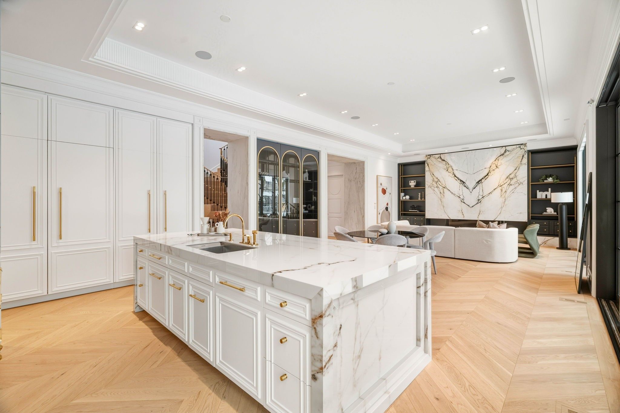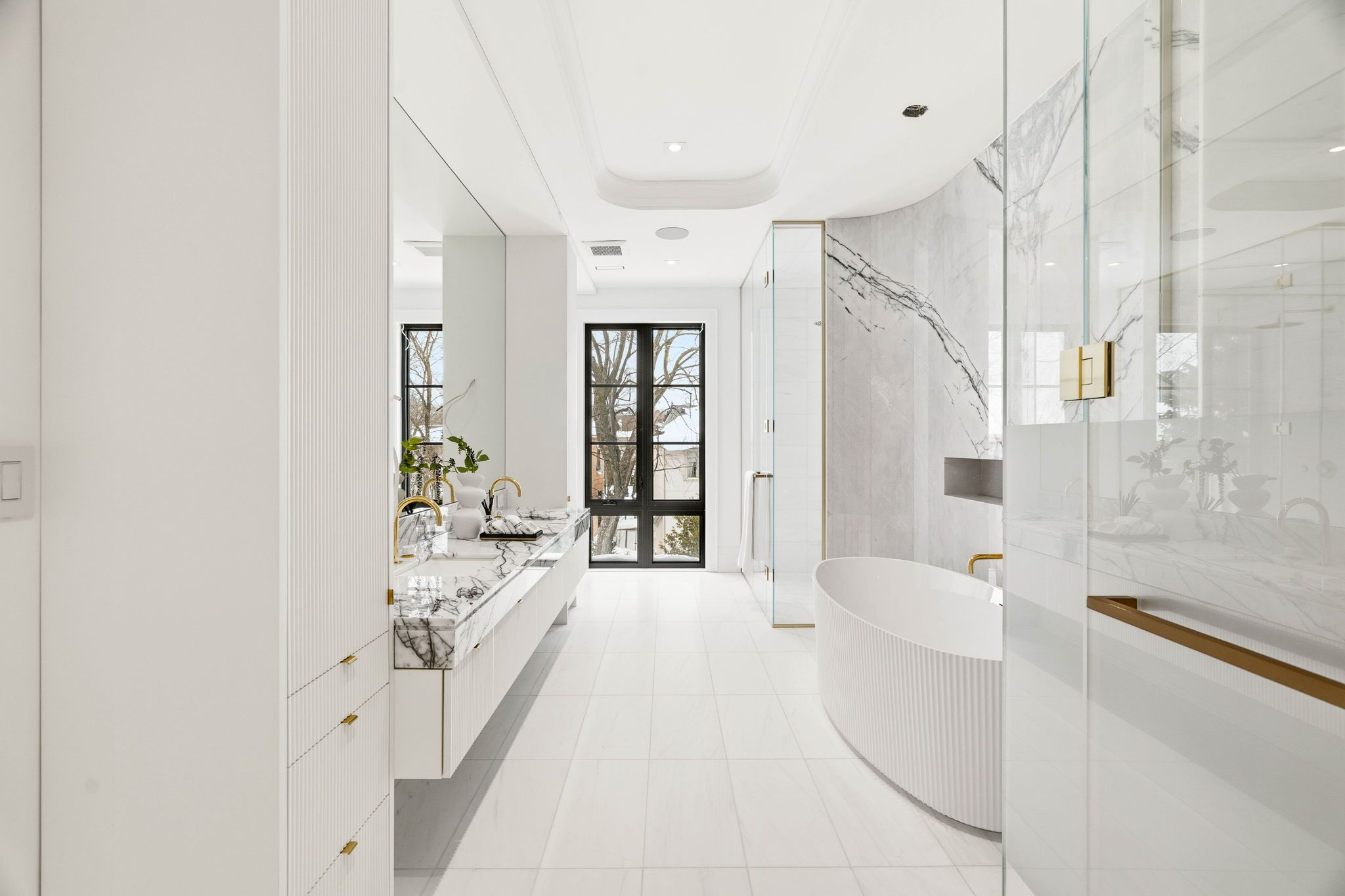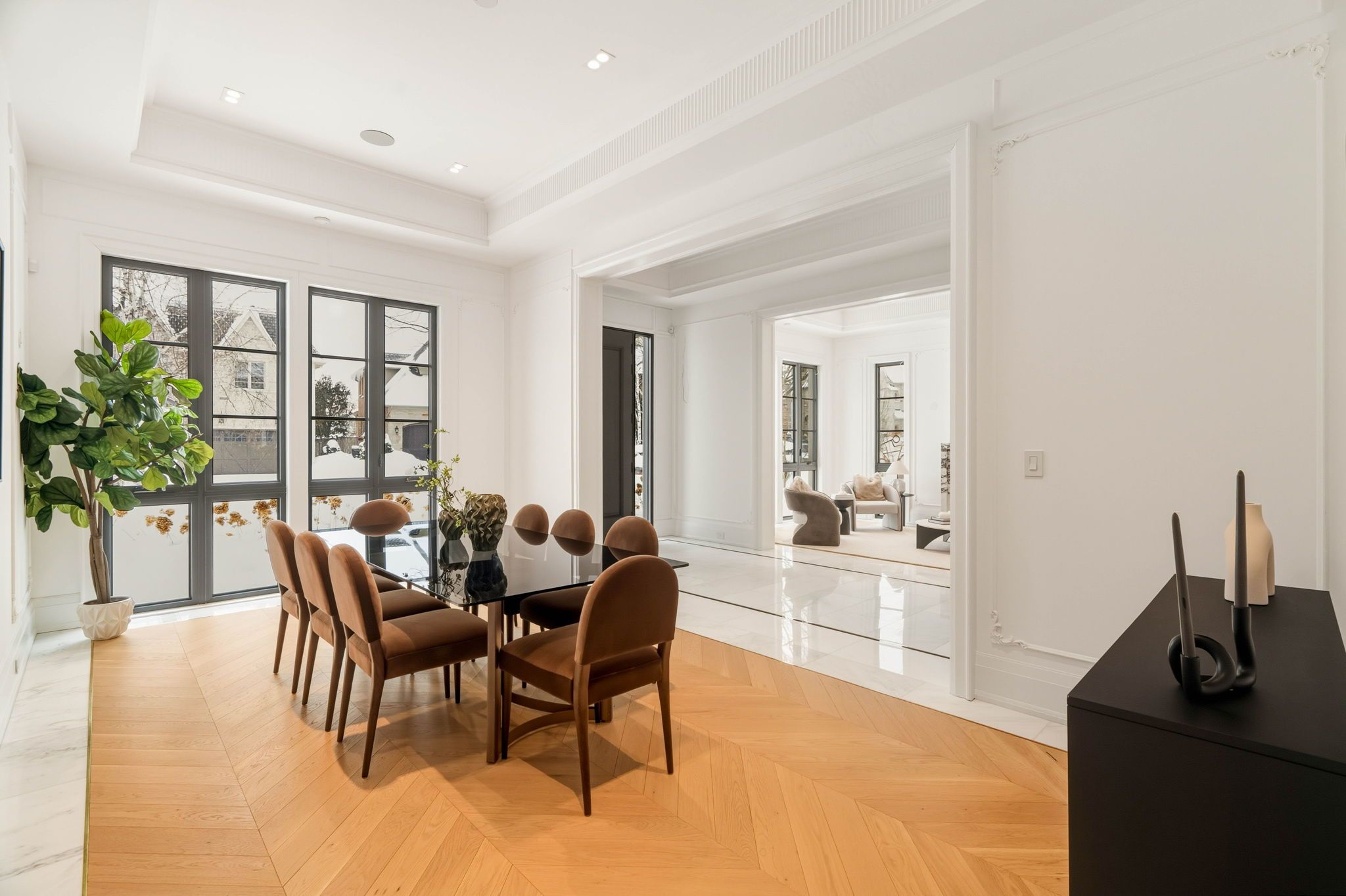 For the bespoke buyer. 1 year new! Builder own - designer palette. St. Andrew-windfields most desirable neighborhoods! Modern home over 8,000 sqft of luxurious living space. Spacious layout and impeccable design with coffered ceilings and custom fluted moulding, french panelling, white oak hardwood and marble tile throughout. The chef's kitchen plus separate prep kitchen, porcelain counters and backsplash, custom cabinetry with brass hardware, large centre island and top-of-the-line appliances, open design breakfast area and family room overlooking the rear gardens with gas fireplace and striking book-matched marble surround. Generously sized dining room, living room, and office complete the main floor. The primary suite invites you to a spacious sitting room overlooking the rear gardens featuring 2-sided gas fireplace with custom marble surround, illuminated porcelain arches leading to the bedroom suite, indulgent his and hers dressing rooms, and spa-inspired 7pc ensuite retreat. The 2nd floor also features a laundry room and 3 additional bedrooms with their own walk-in closets plus ensuites. The lower level features a nanny suite, rec room with walk-up to rear garden plus fitness room complete with sauna and separate shower, well-appointed custom onyx stone bar with displays and built-in seating, lounge area, built-in 150+ bottle wine storage, 3-tier theatre room, and lower level laundry. The rear garden features terrace with walkout from the chef's kitchen, fully fenced and surrounded by mature trees ready for your custom landscape design. Central vac, alarm system, elevator service to all floors, integrated speakers and pot lights throughout. Easy access to 401, yonge st, restaurants, parks, shopping centres, public and private schools in the area.