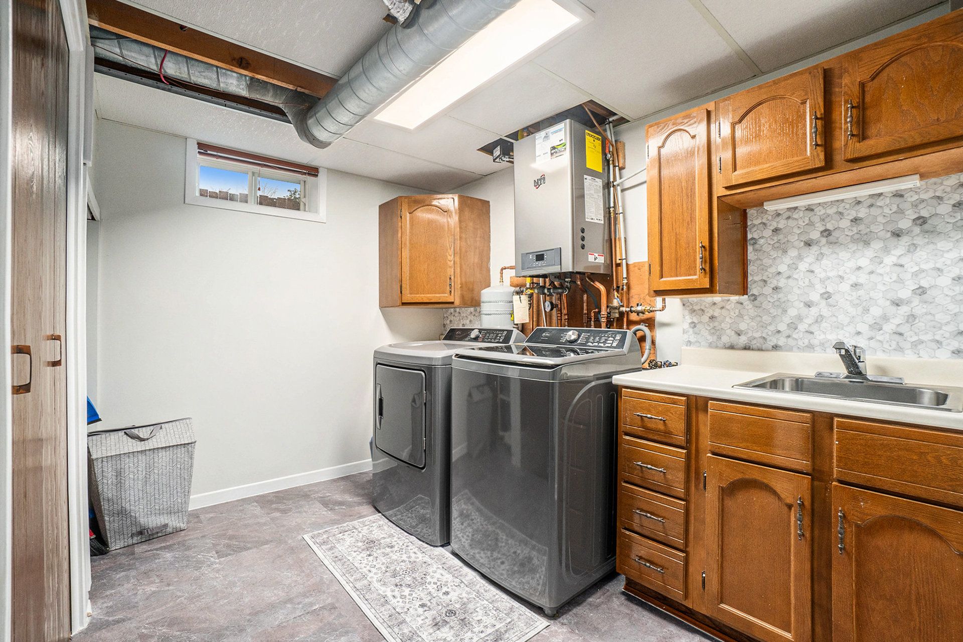 • Fully finished basement featuring a cozy gas fireplace and storage.