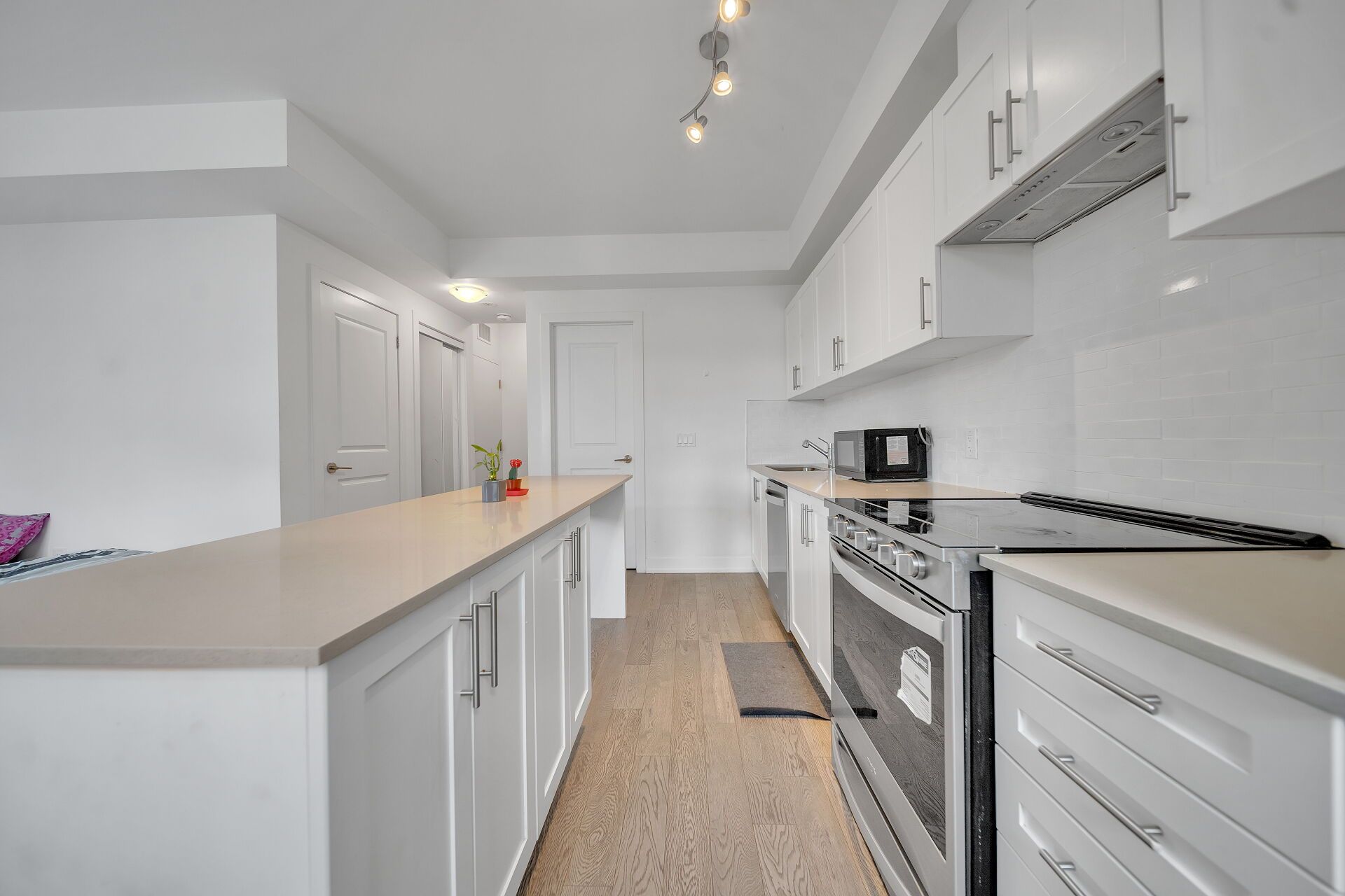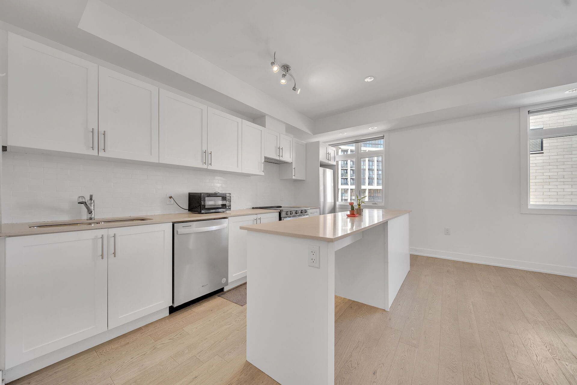 • Modern kitchen features a stylish back splash and cozy living area.