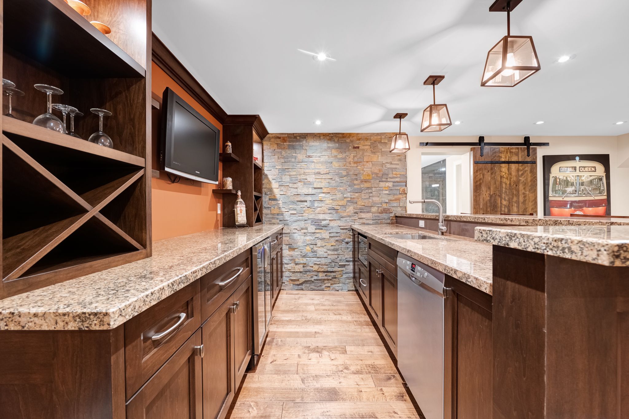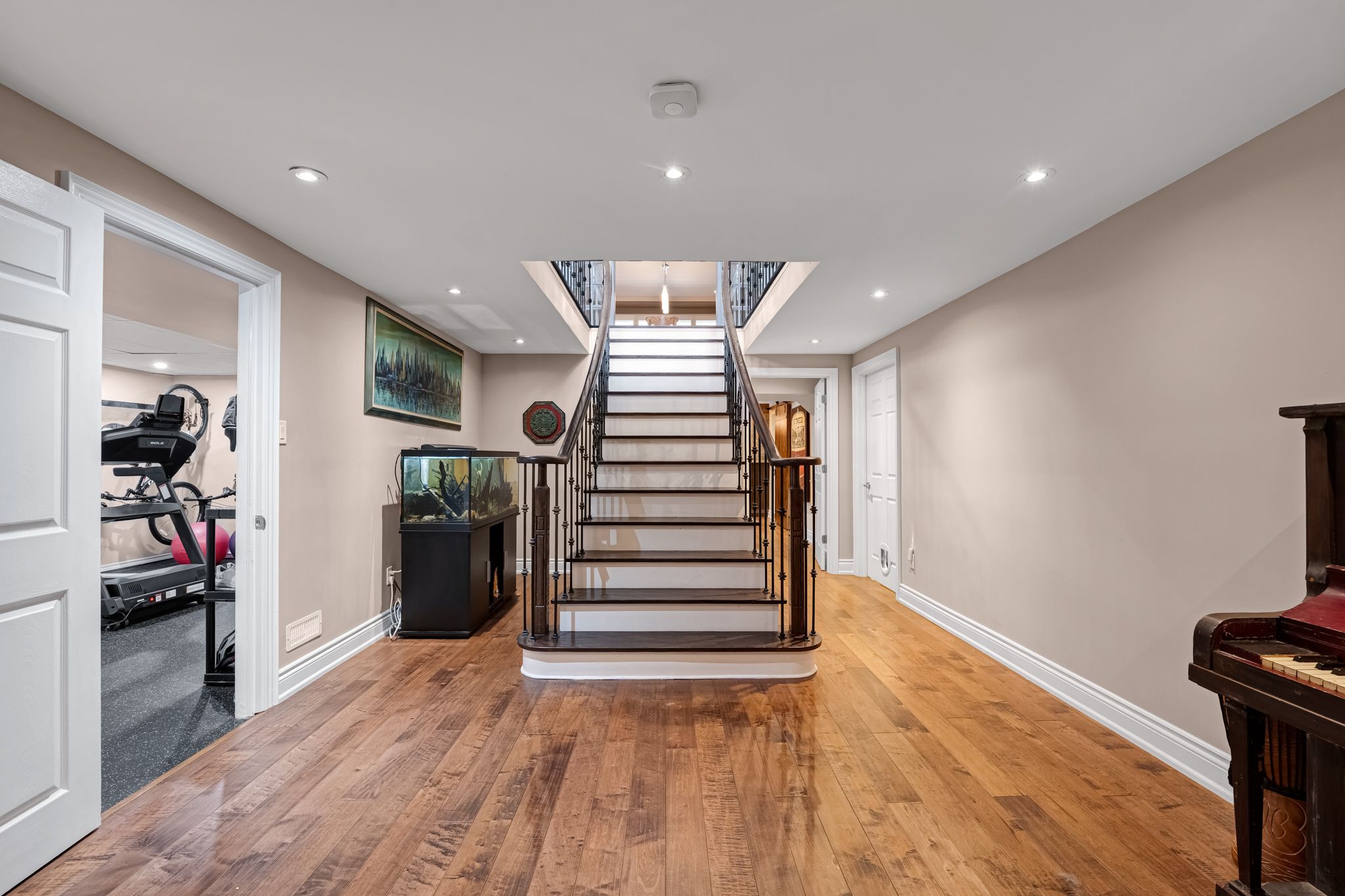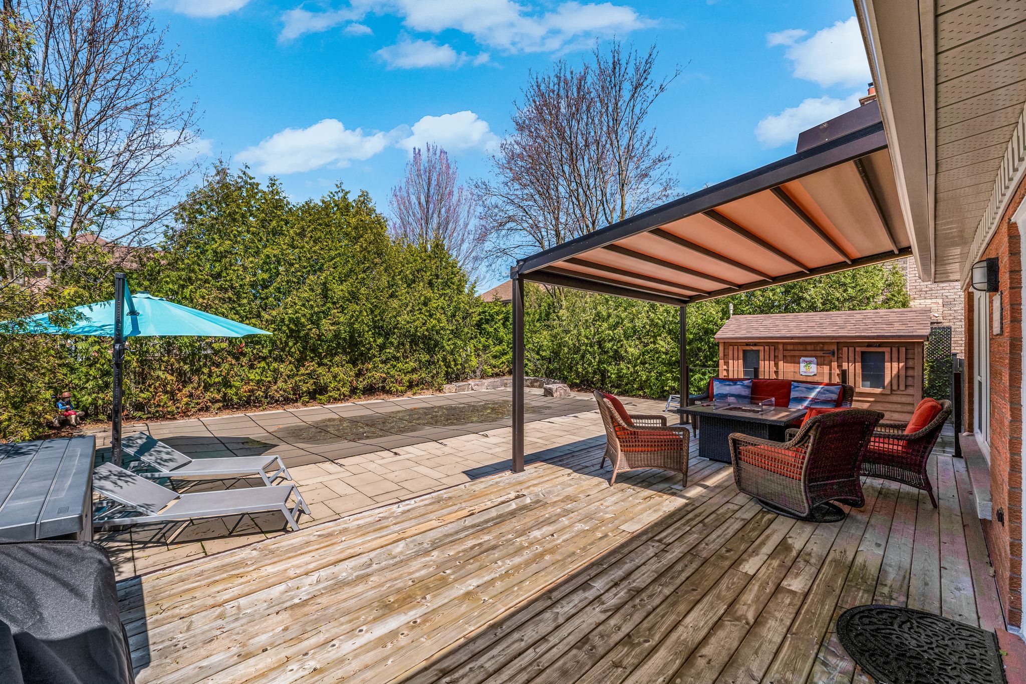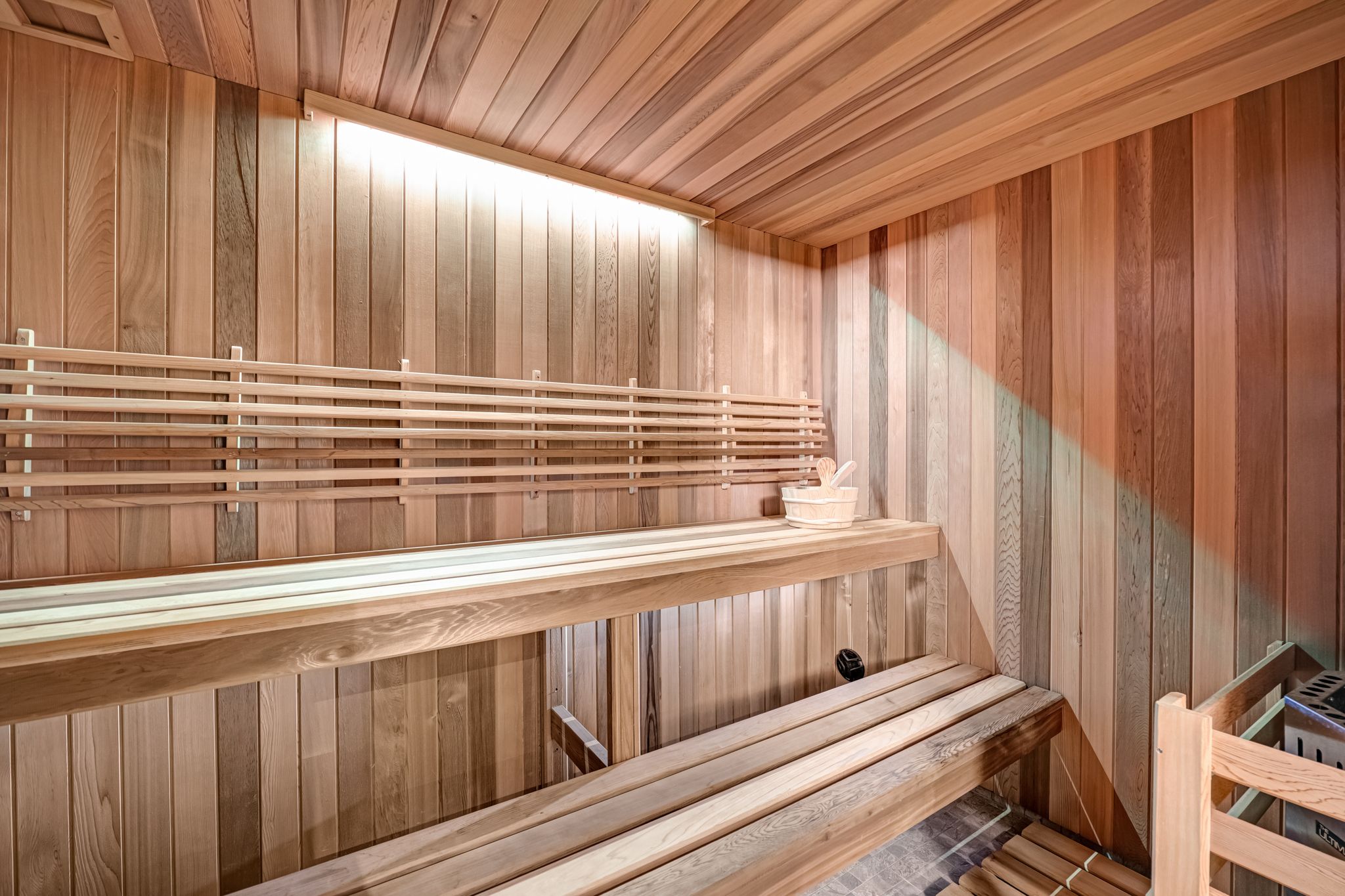 • Finished basement includes a recreation area and built-in sauna.