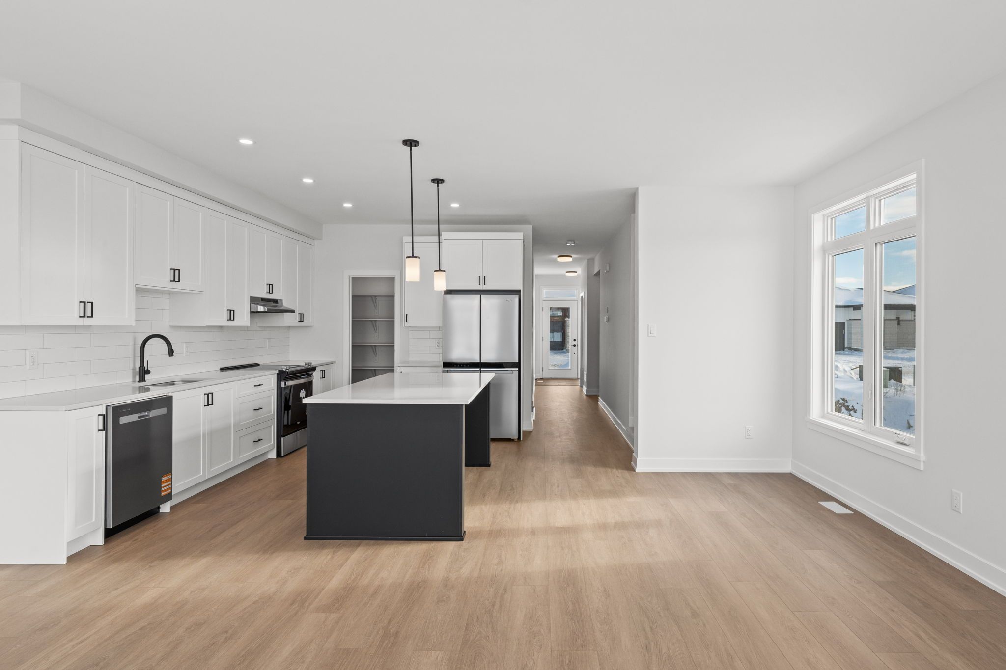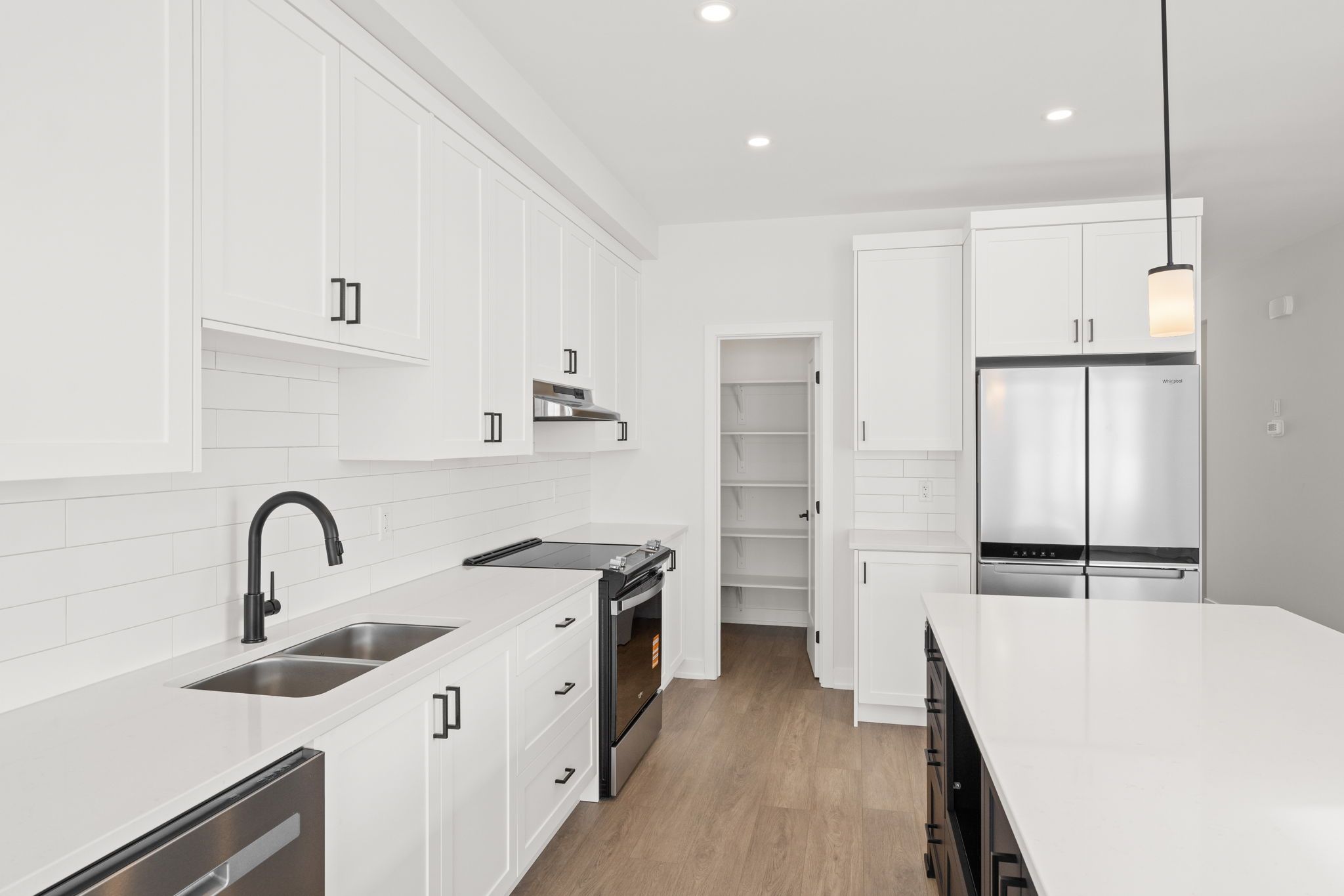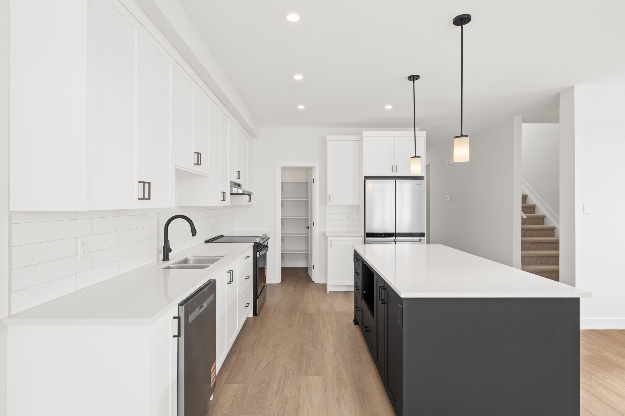 • Stylish kitchen with quartz countertops, pantry, and center island.