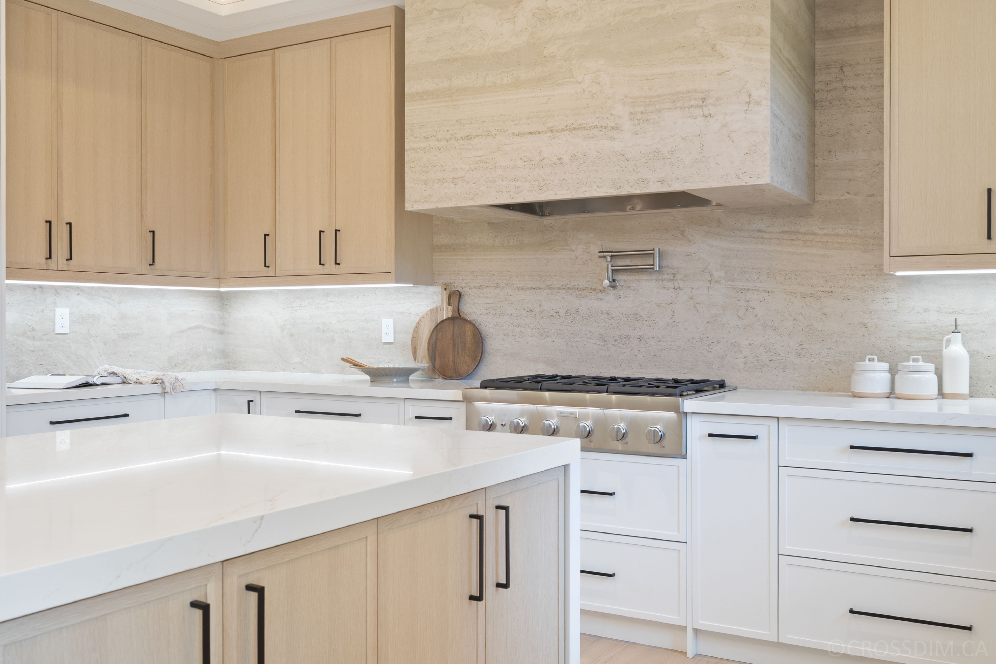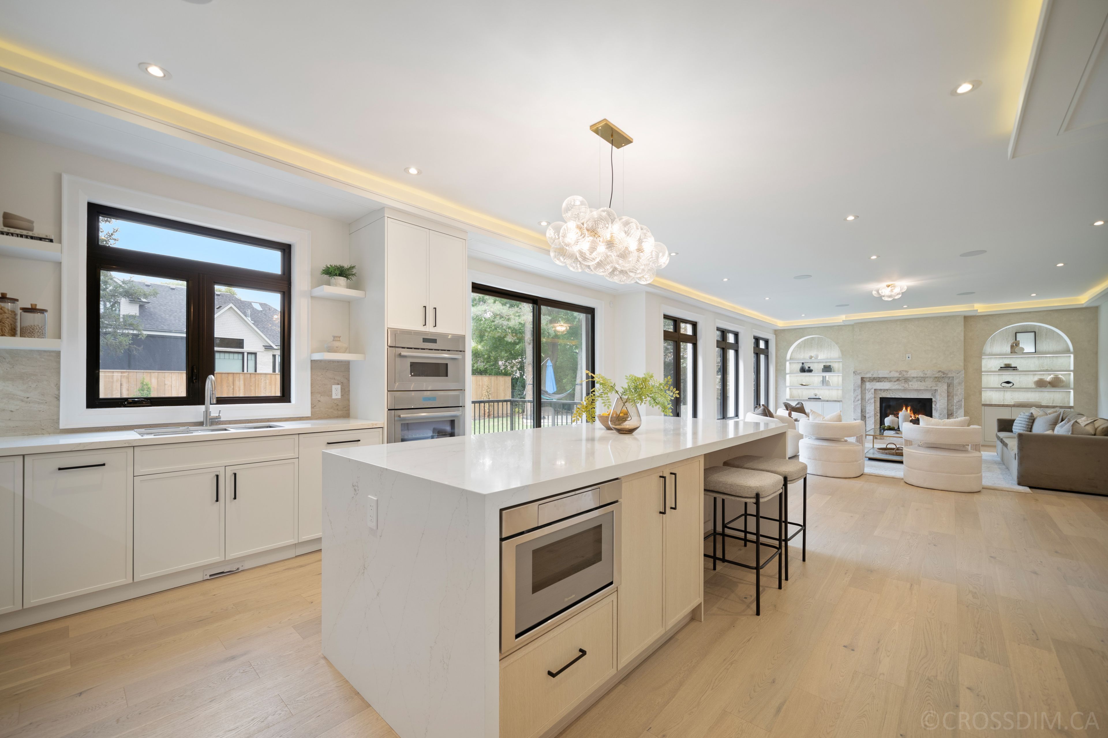 • Gourmet kitchen with oversized quartz island and luxury appliances.
