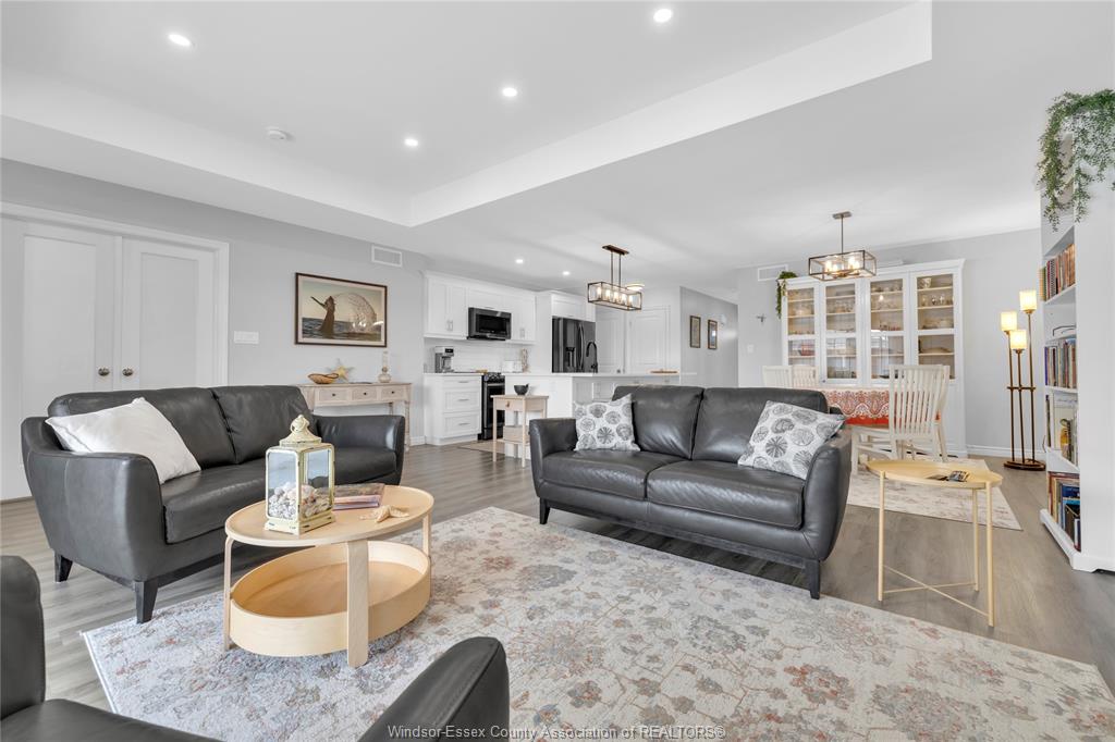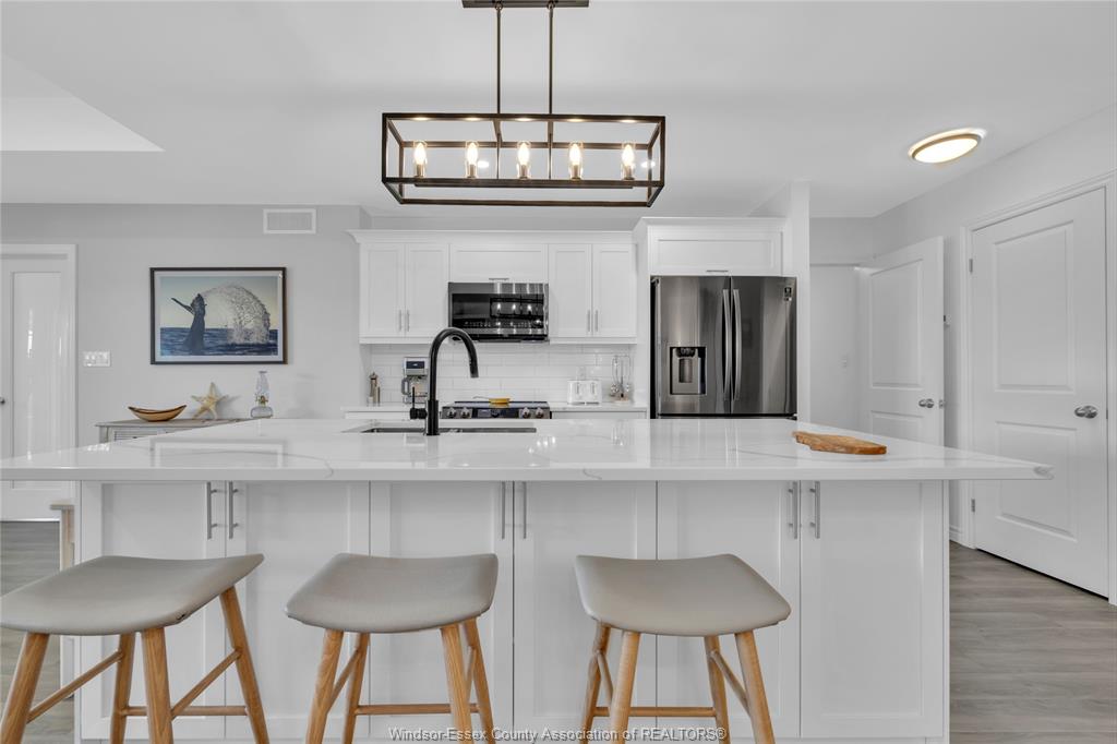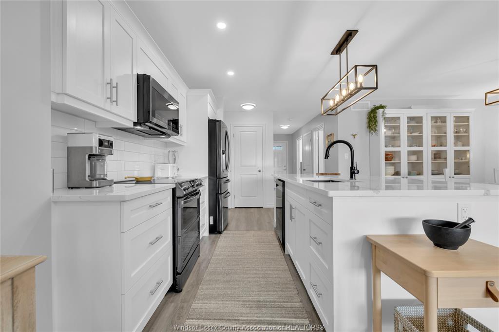 • Open concept kitchen and dining area with quartz counters and oversized island.