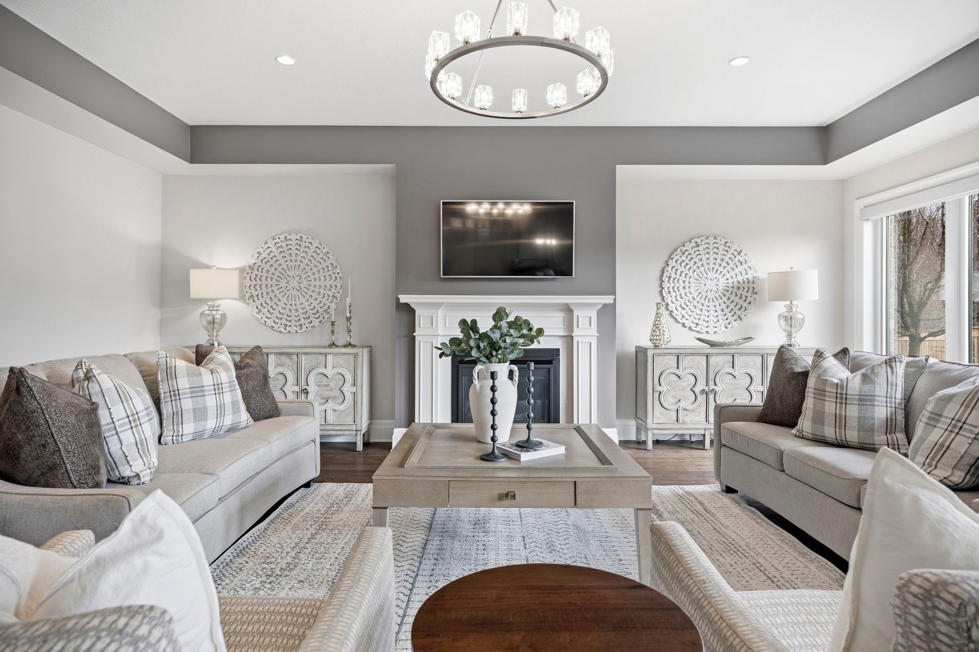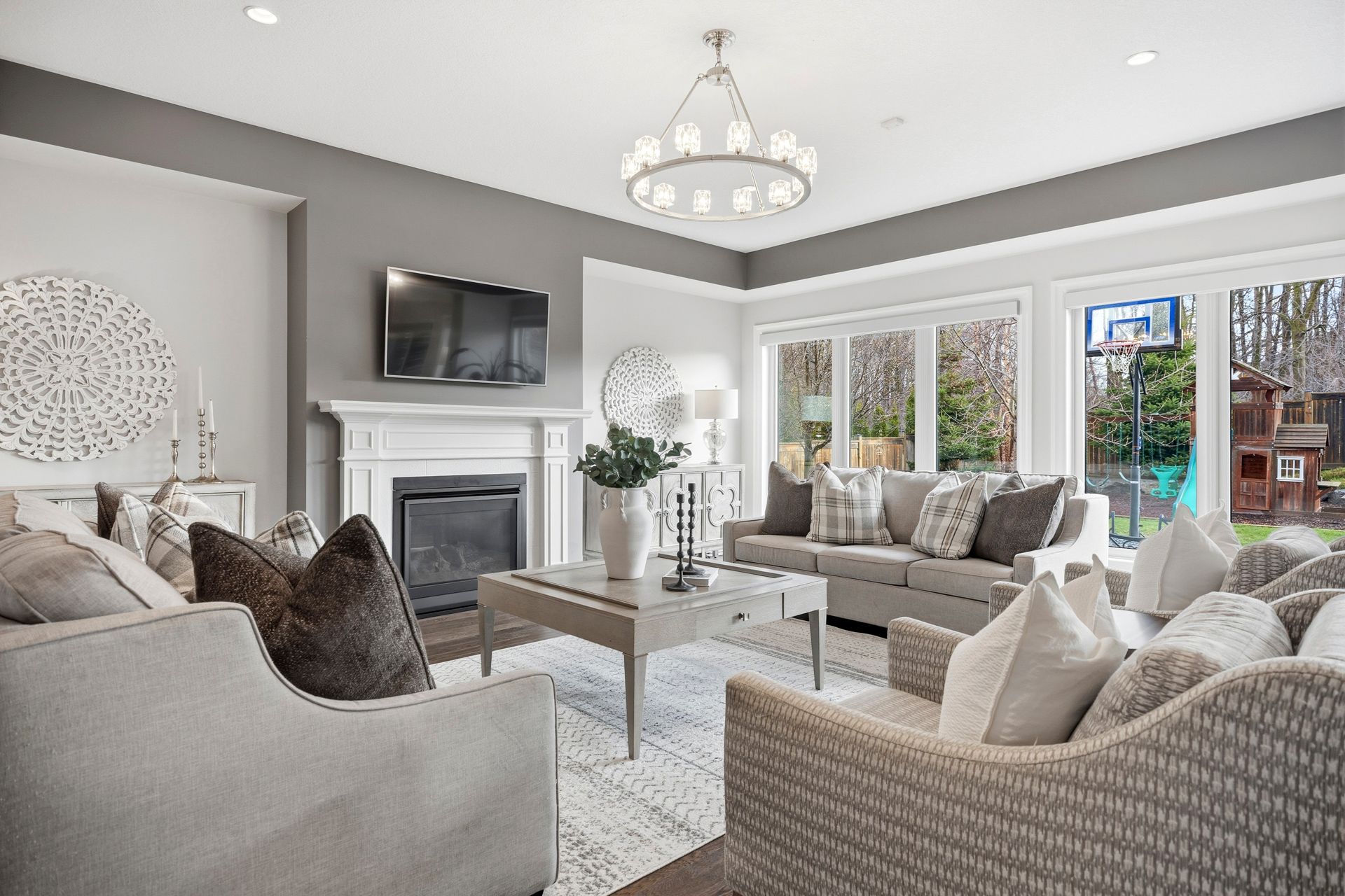 • Open-concept living area with a chef-inspired kitchen and gas fireplace.