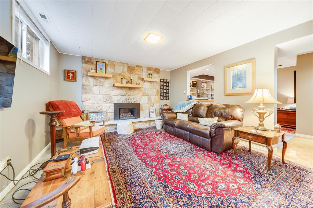 • Cozy lower-level family room with a fireplace for relaxation.