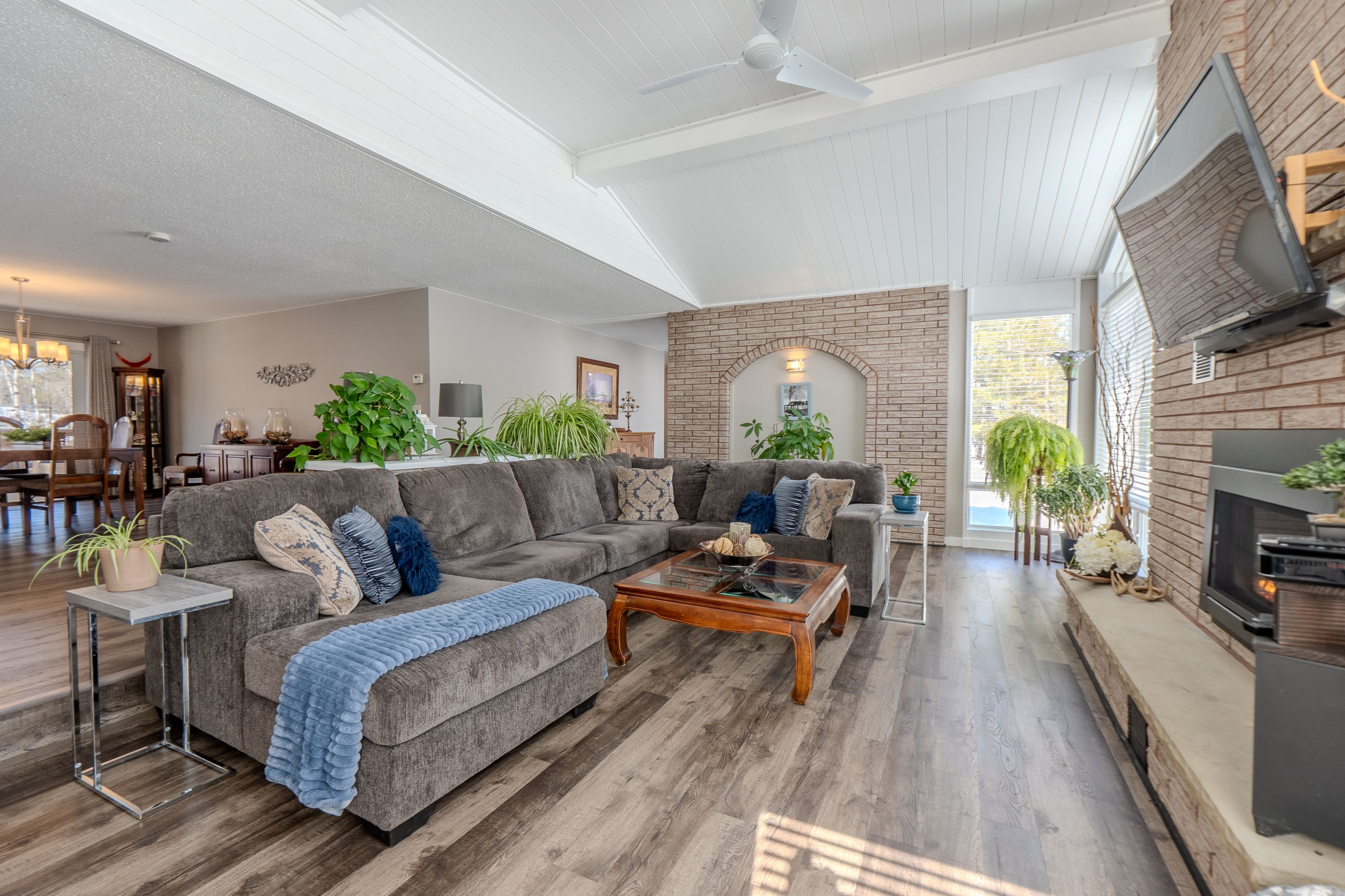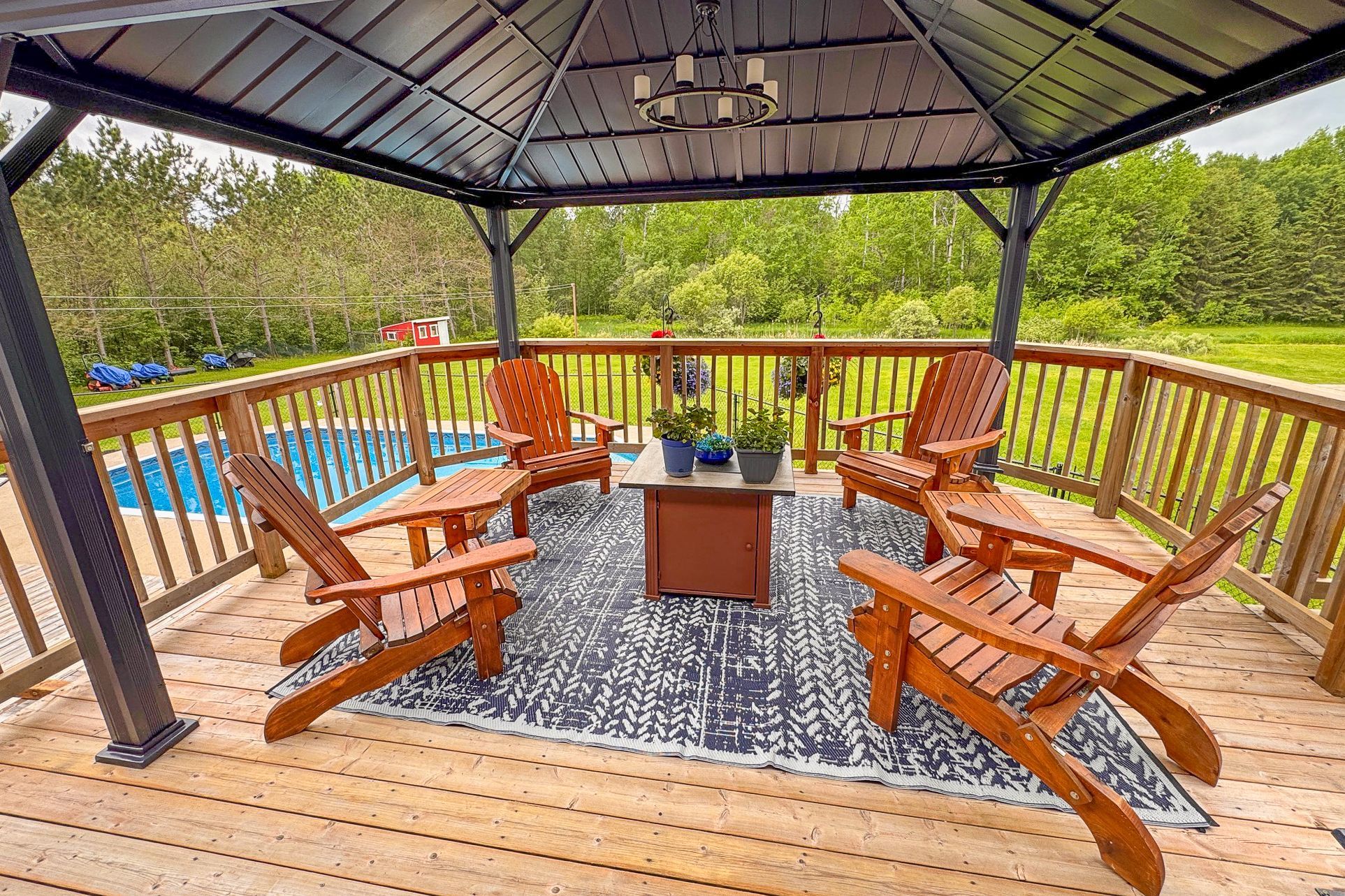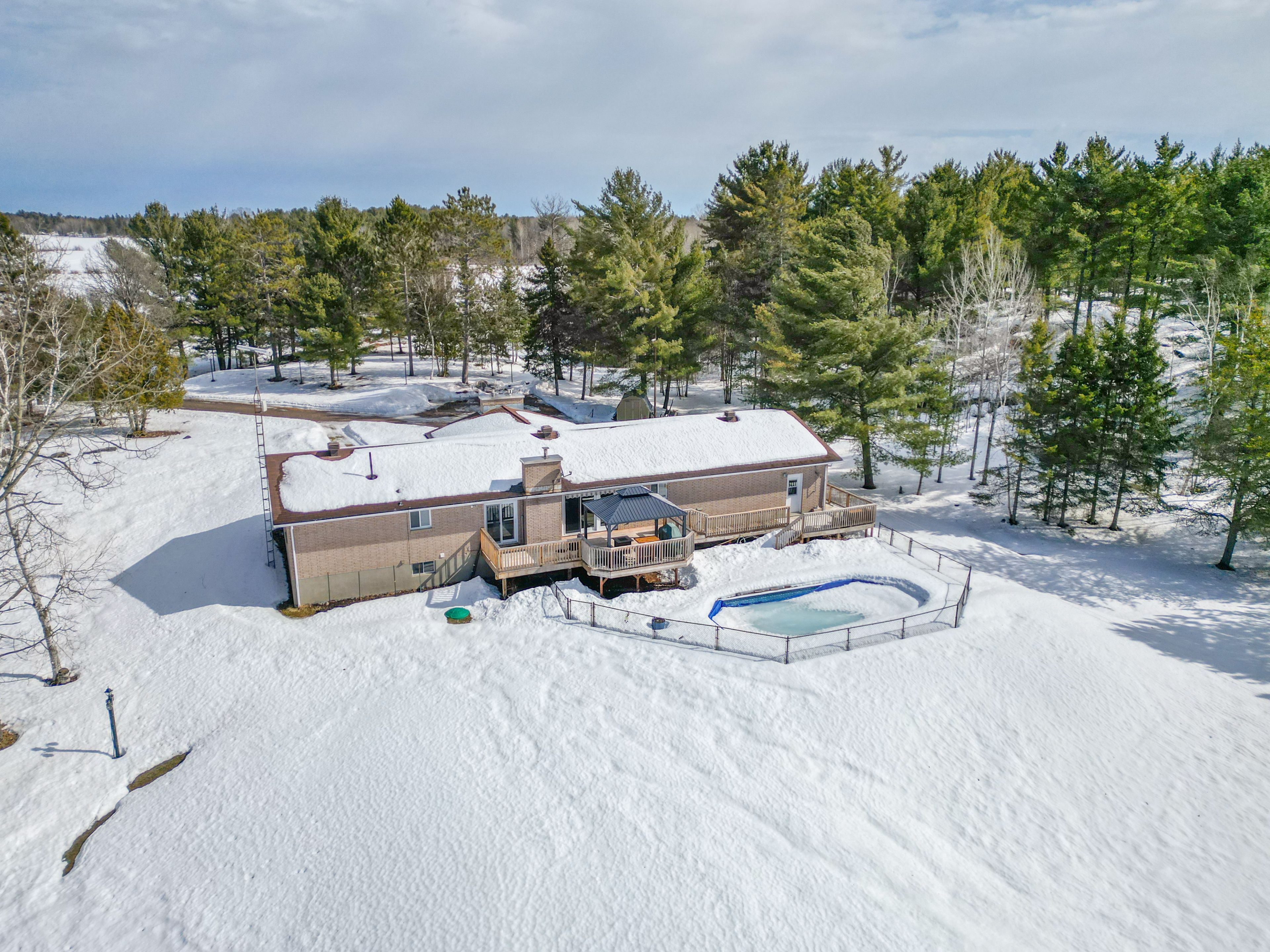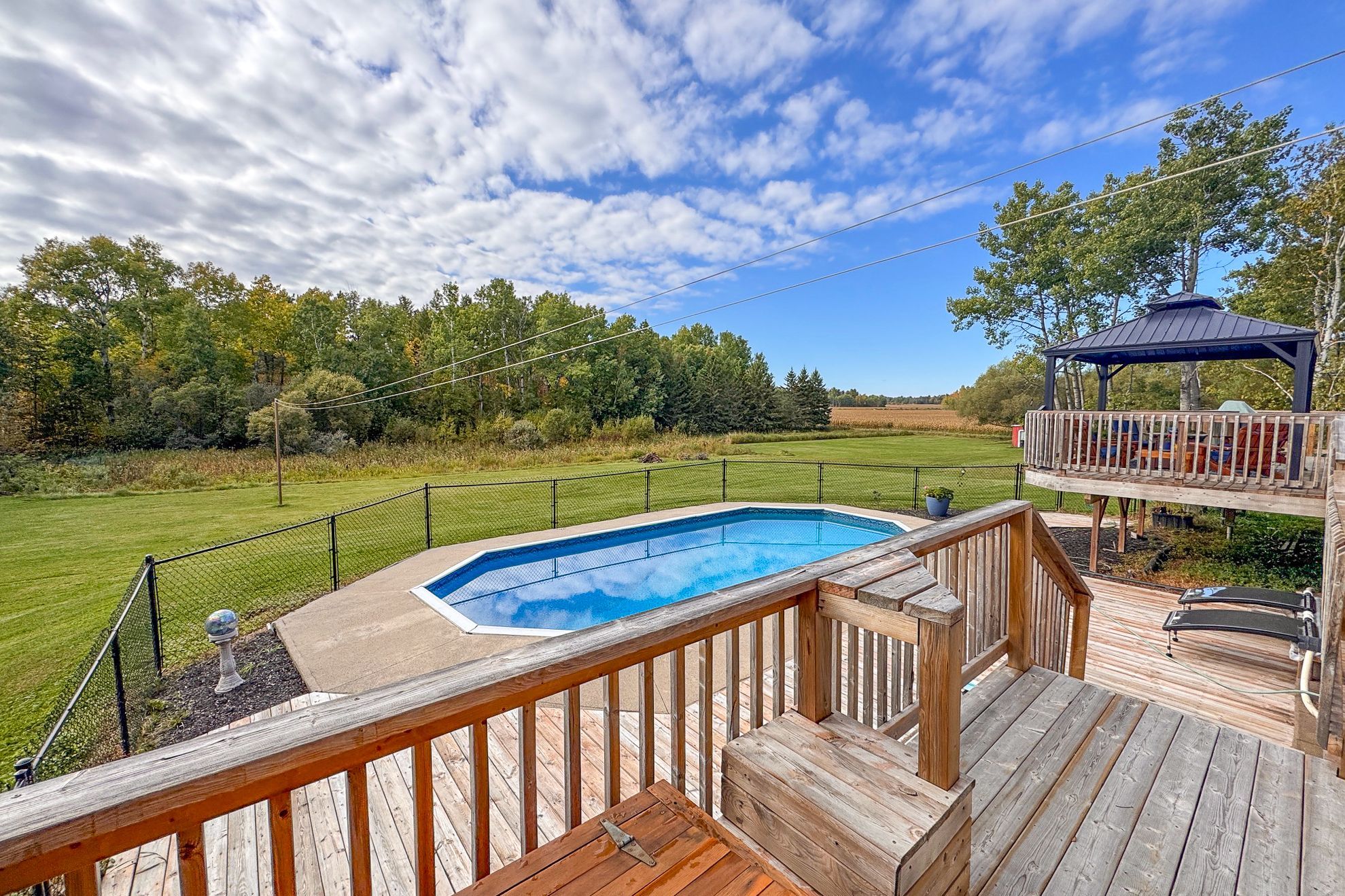 Escape to your own private 5. 6-acre country retreat on the peaceful outskirts of lavigne. This charming all-brick ranch-style bungalow offers the perfect blend of comfort, space, and natural beauty. Step into a bright and welcoming living room featuring vaulted ceilings and large windows that flood the home with natural light. The main level has been tastefully refreshed with new flooring, fresh paint, and updated bathrooms, giving the home a clean, modern feel. The open-concept kitchen and dining area create an ideal space for family living and entertaining, with garden doors leading to a spacious deck and gazebo - perfect for outdoor dining, relaxing, or enjoying the tranquil surroundings. The main floor features three comfortable bedrooms, including a generous primary suite complete with a private 3-piece ensuite. The full, partially finished basement adds valuable living space, offering a large recreation room with a cozy wood fireplace, a private office, and an expansive utility/workshop area with walkout access to the attached insulated double garage. Outside, enjoy summer days in the beautiful in-ground pool, surrounded by mature forest and open pastures. This exceptional property provides privacy, and the serenity of country living while still being close to local amenities. A true country oasis with room to relax, entertain, and enjoy nature.