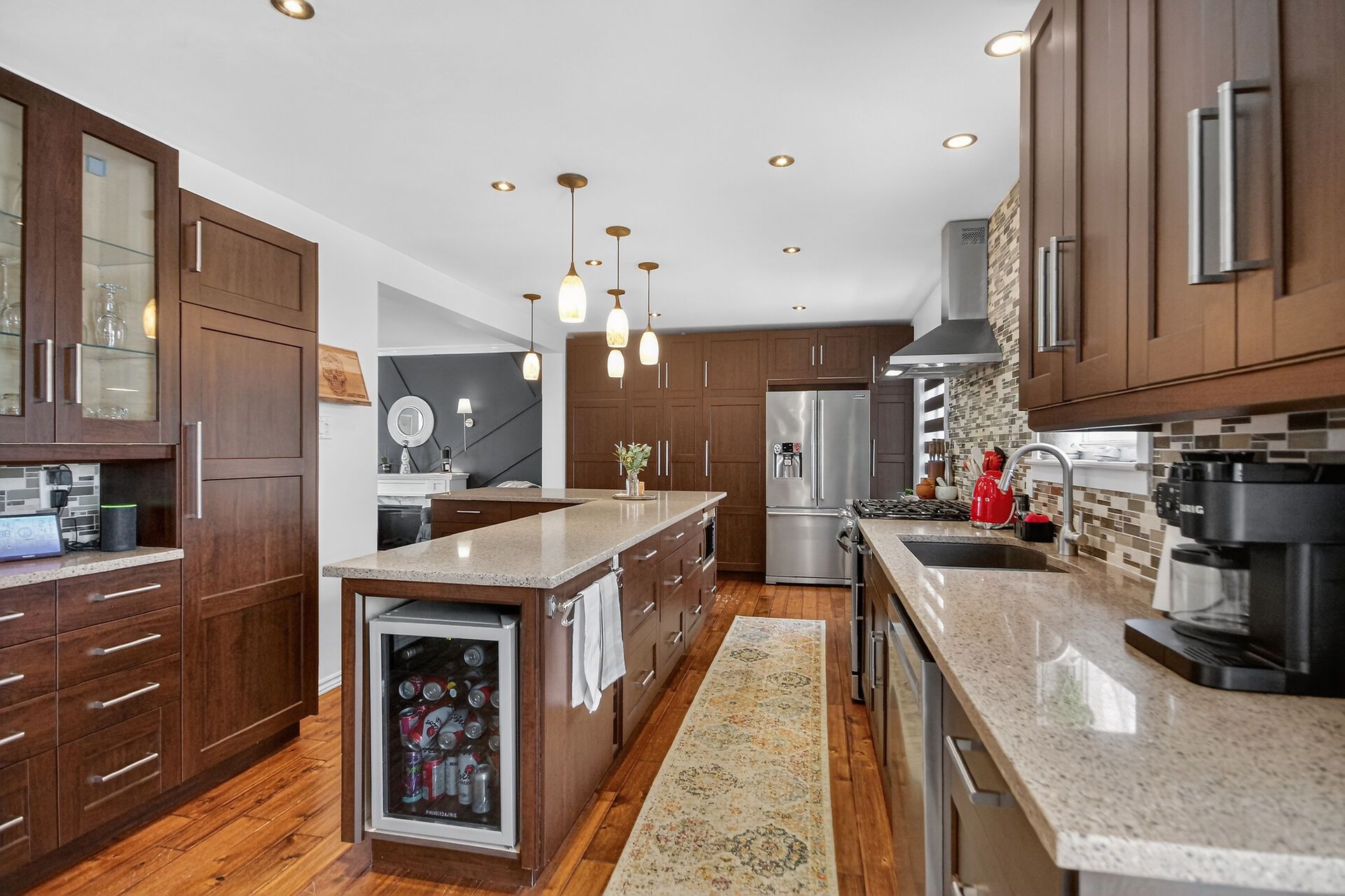 • Modern open-concept kitchen with a large 12-foot island and new appliances.