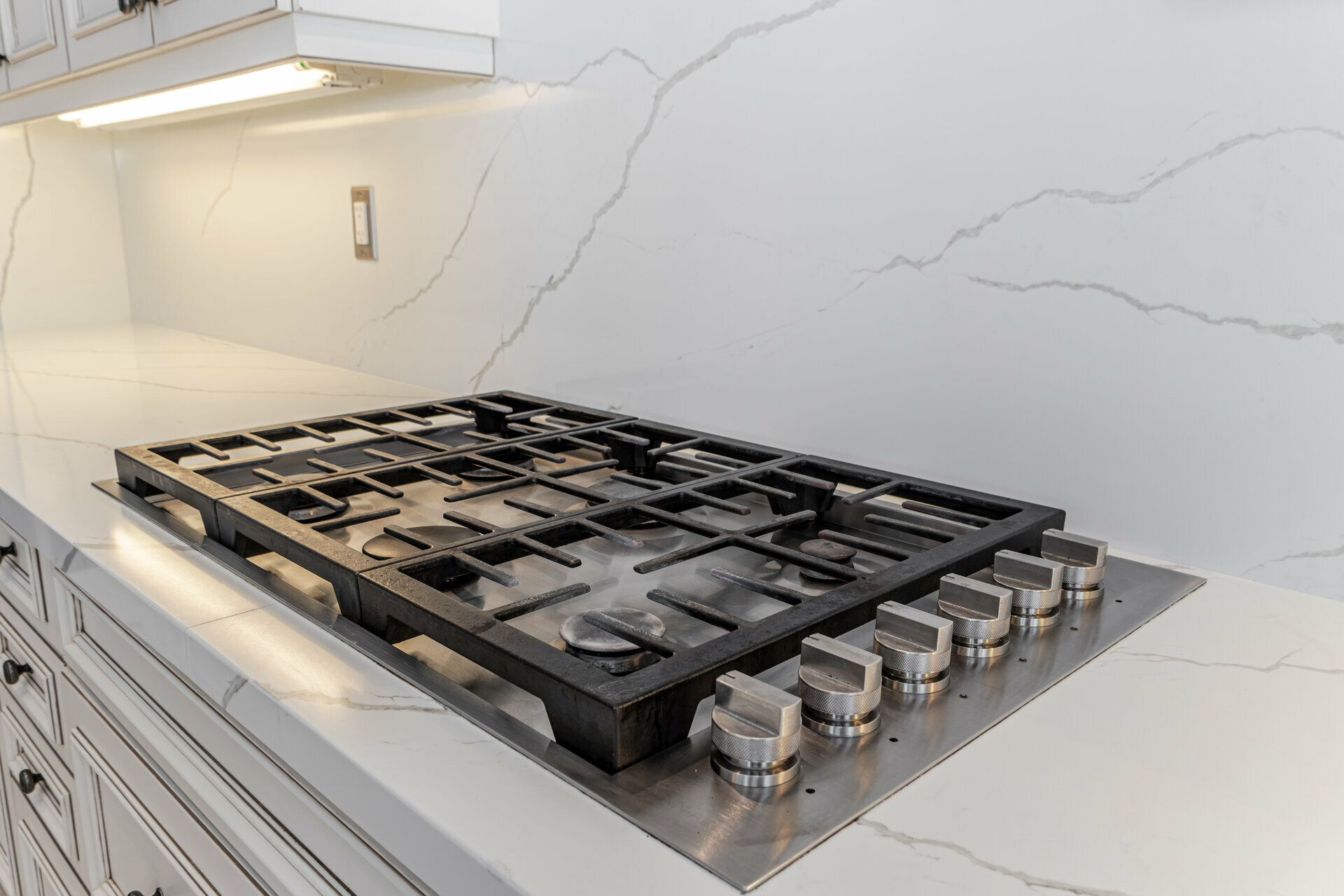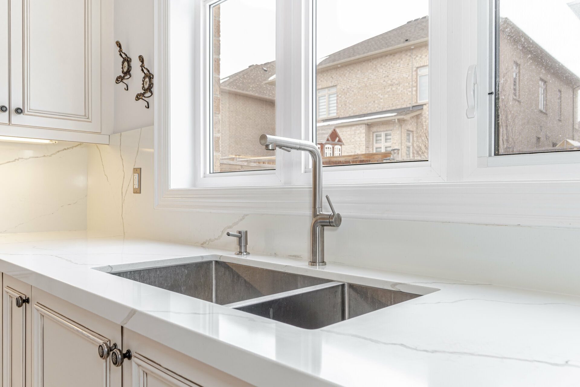 • Custom kitchen featuring quartz countertops and stylish backsplash.
