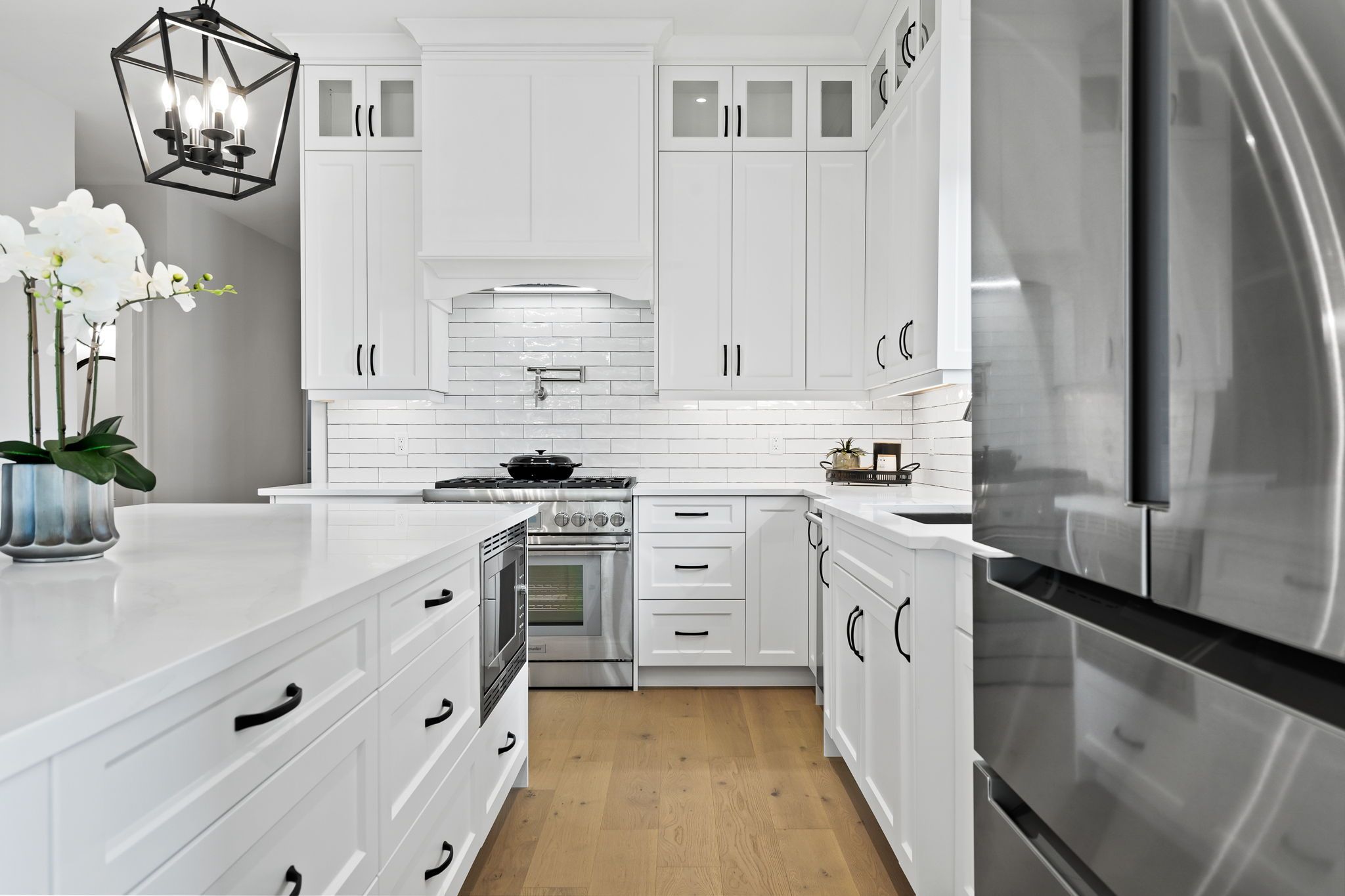 • Chef-inspired kitchen with quartz countertops and premium Thermador gas stove.