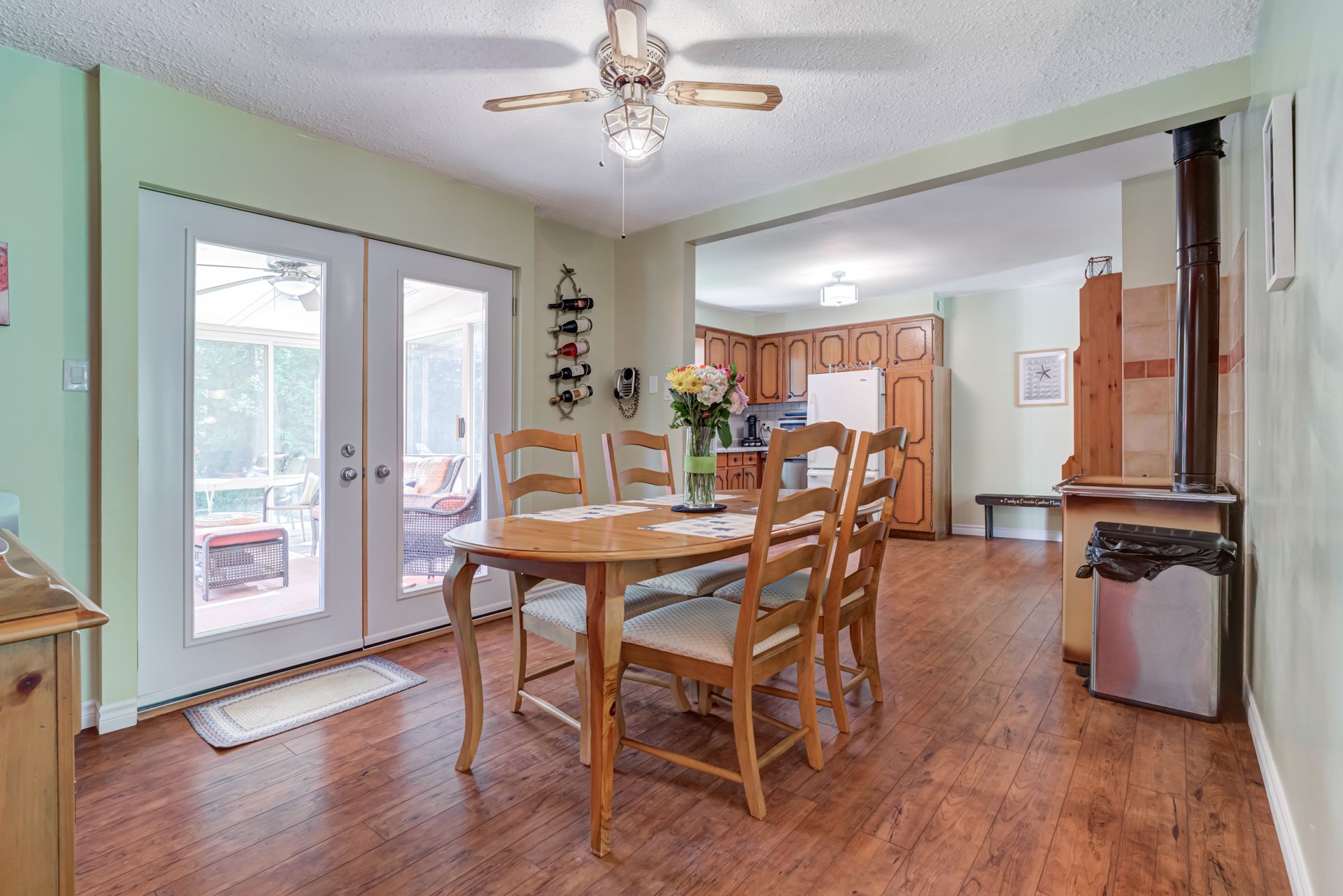 • Well-equipped kitchen features updated countertops and a wood-burning stove.