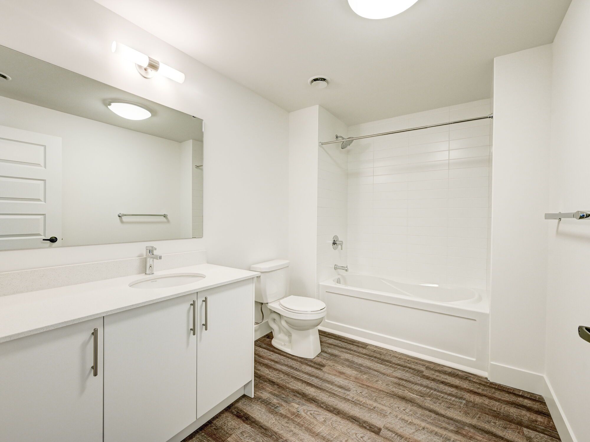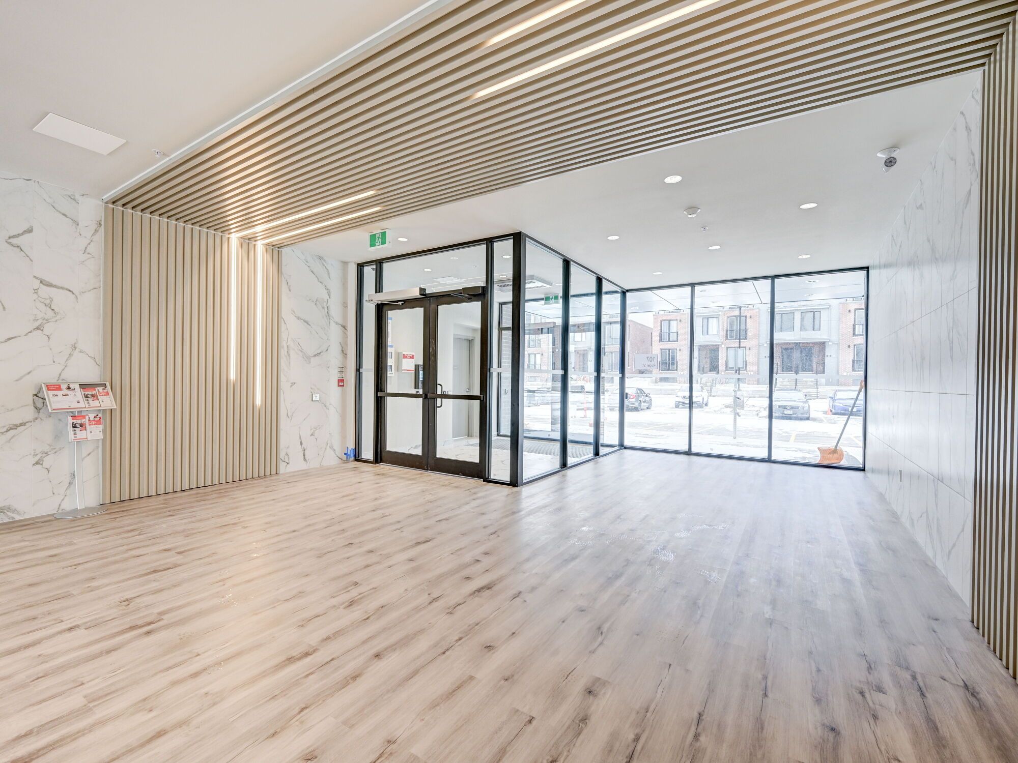 • Bright open-concept layout with high ceilings and luxury vinyl flooring.