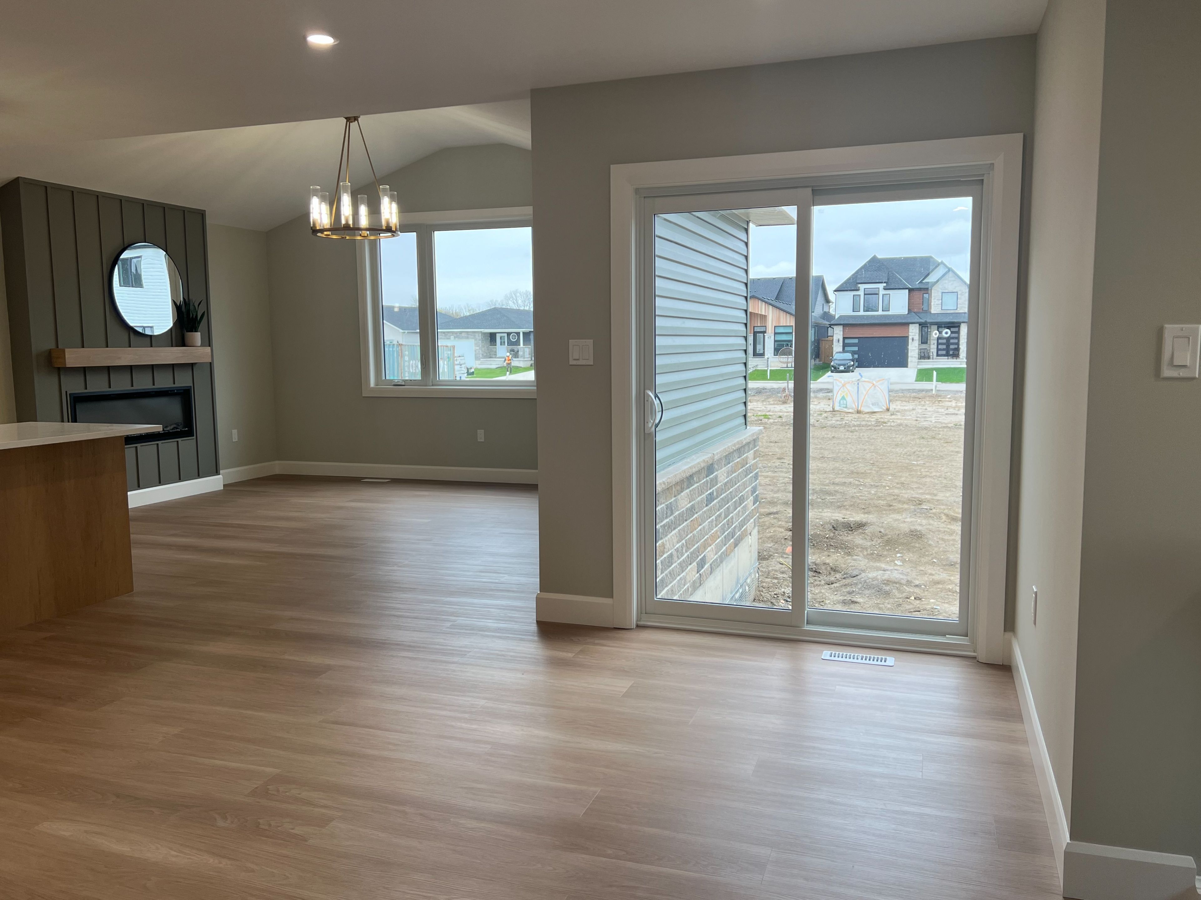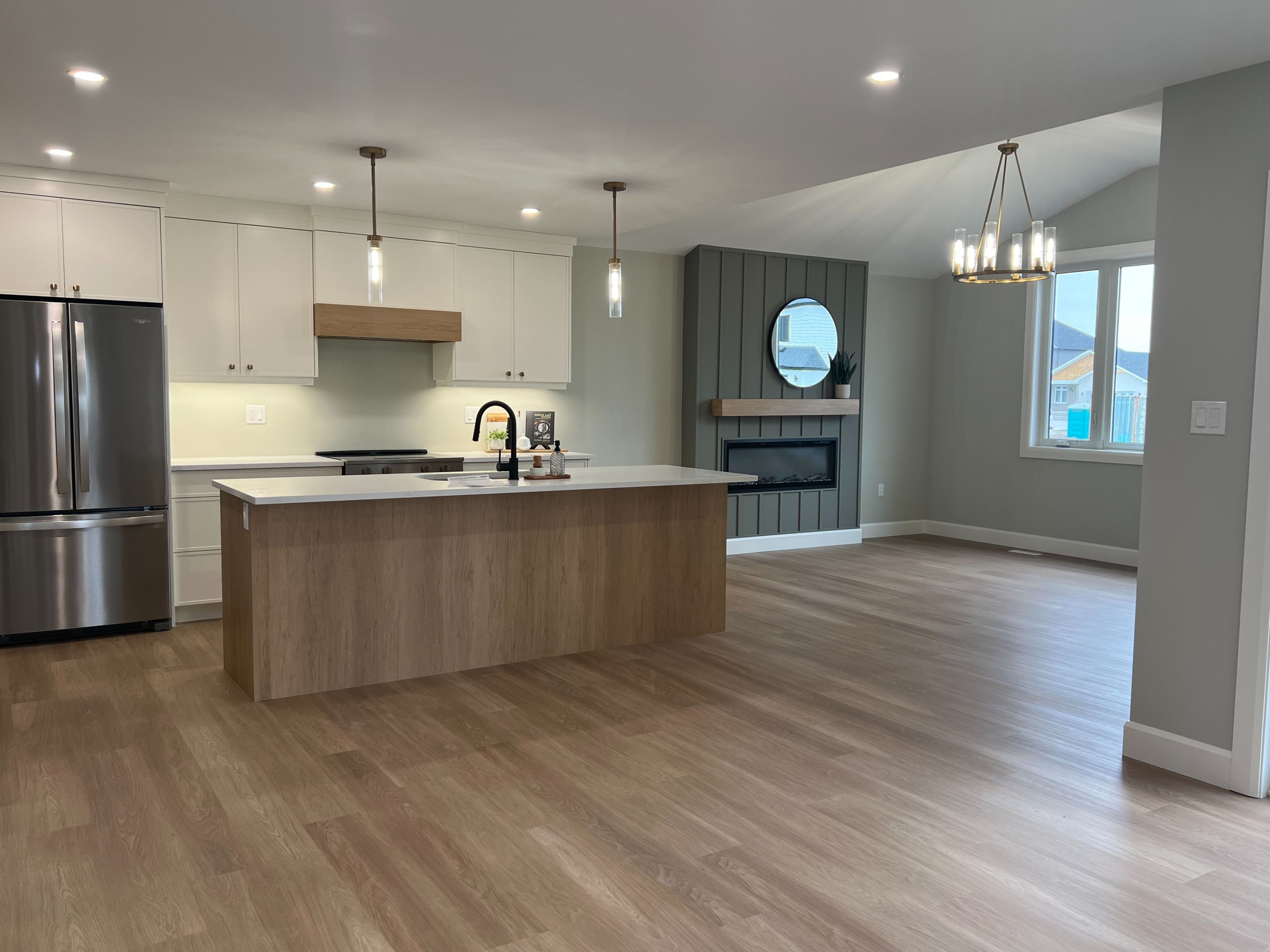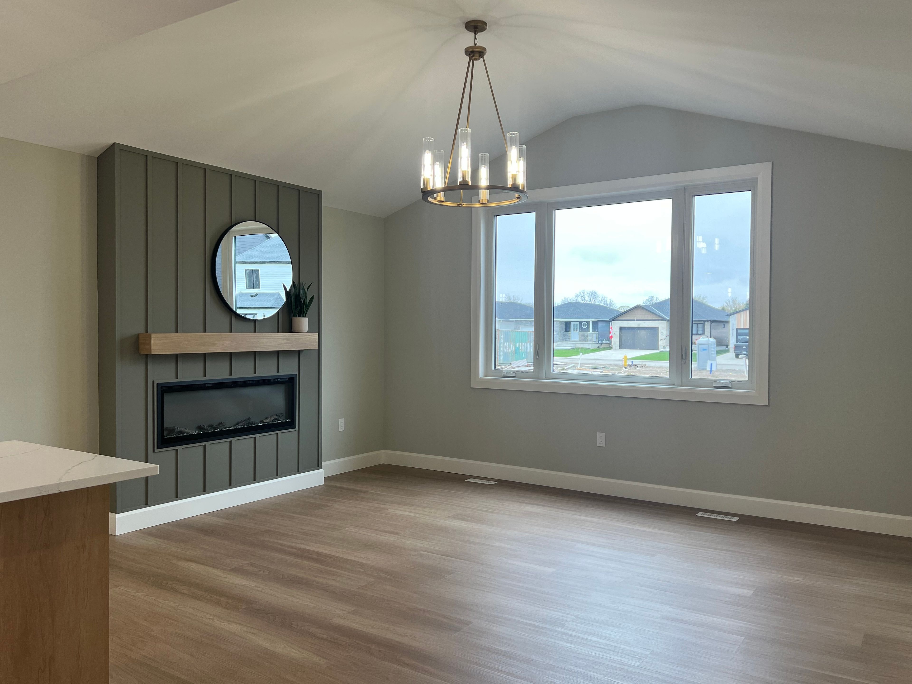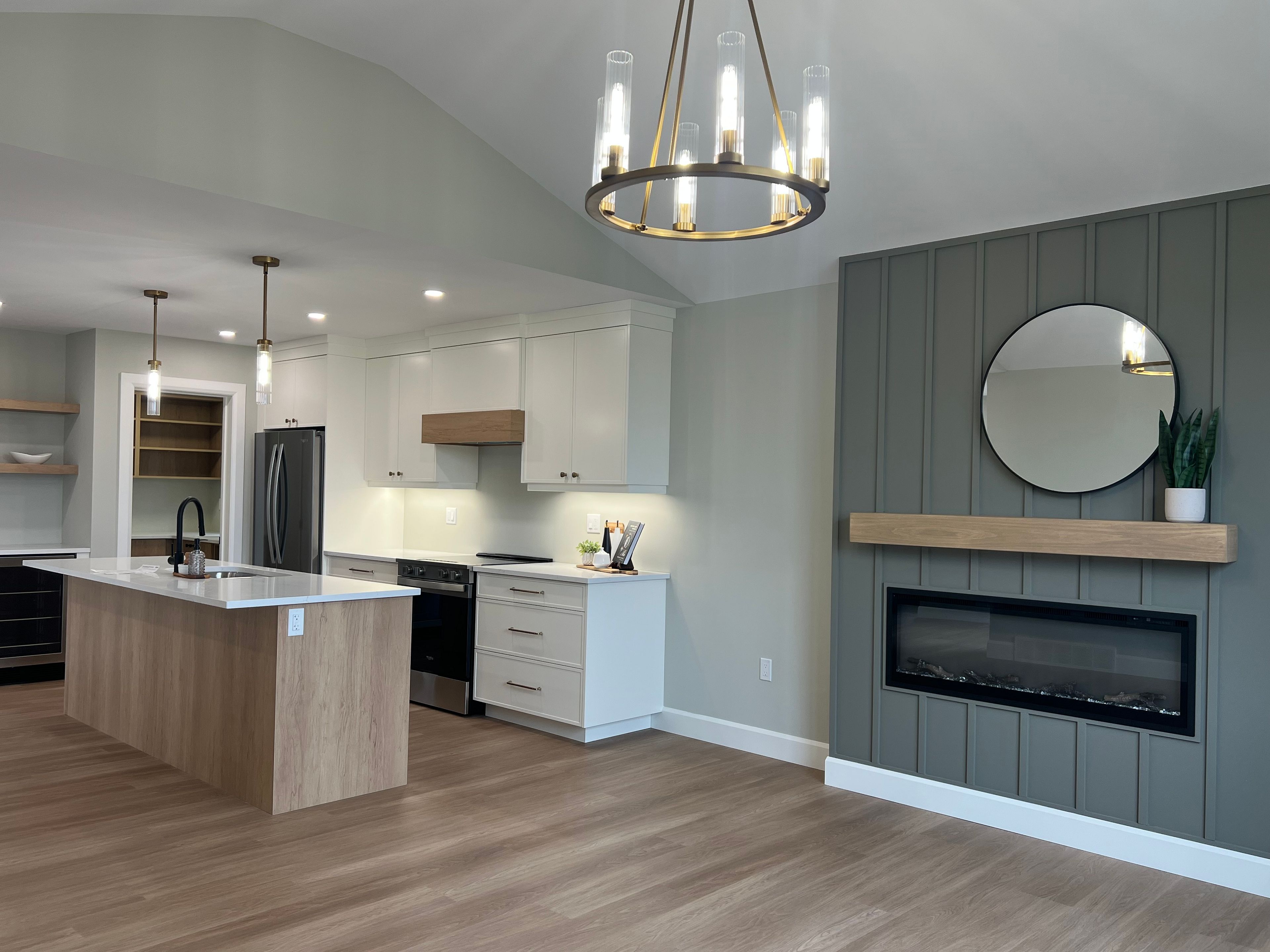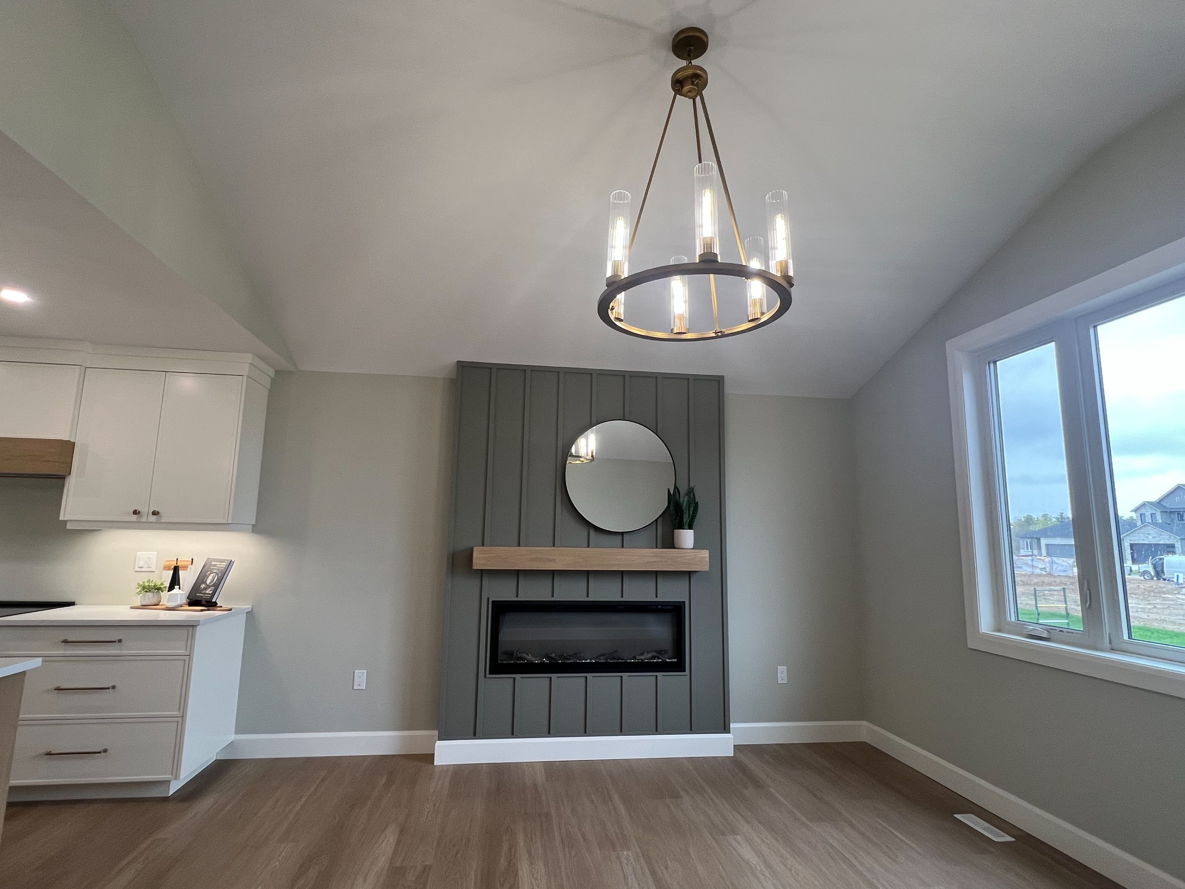 • Bright open-concept living area with cathedral ceilings and electric fireplace.