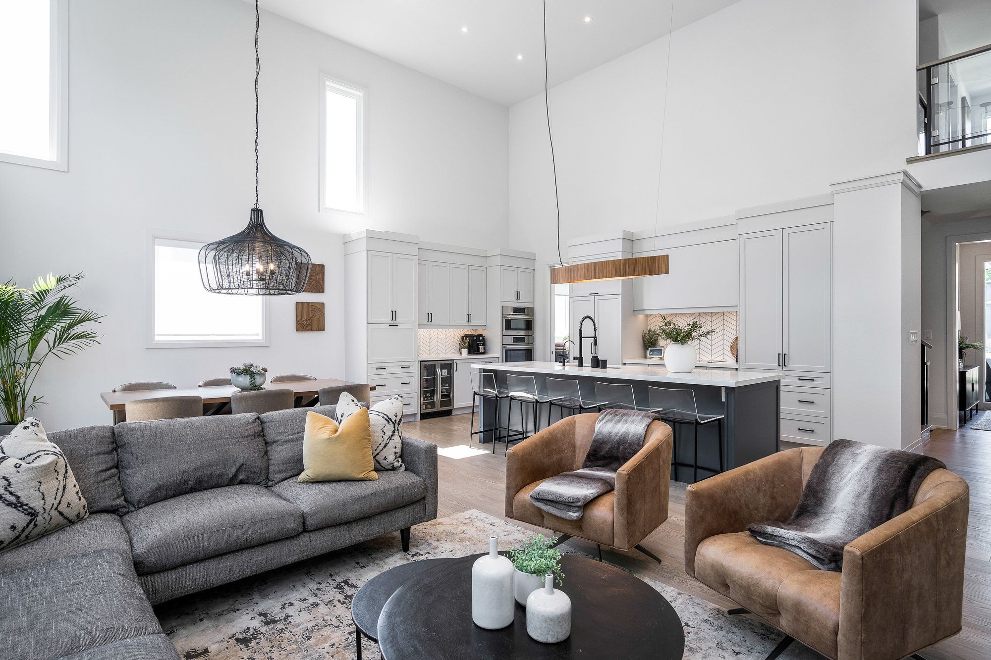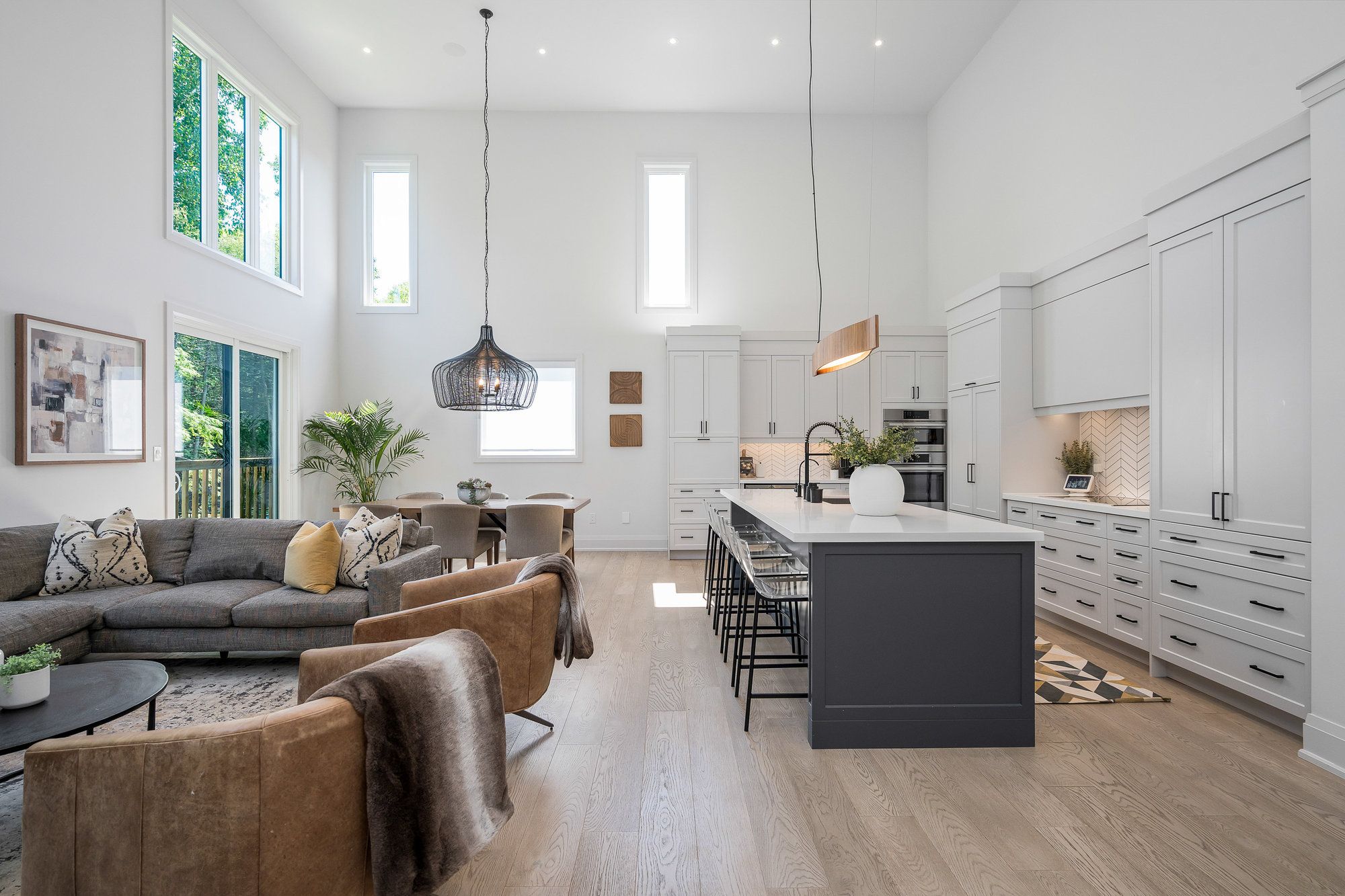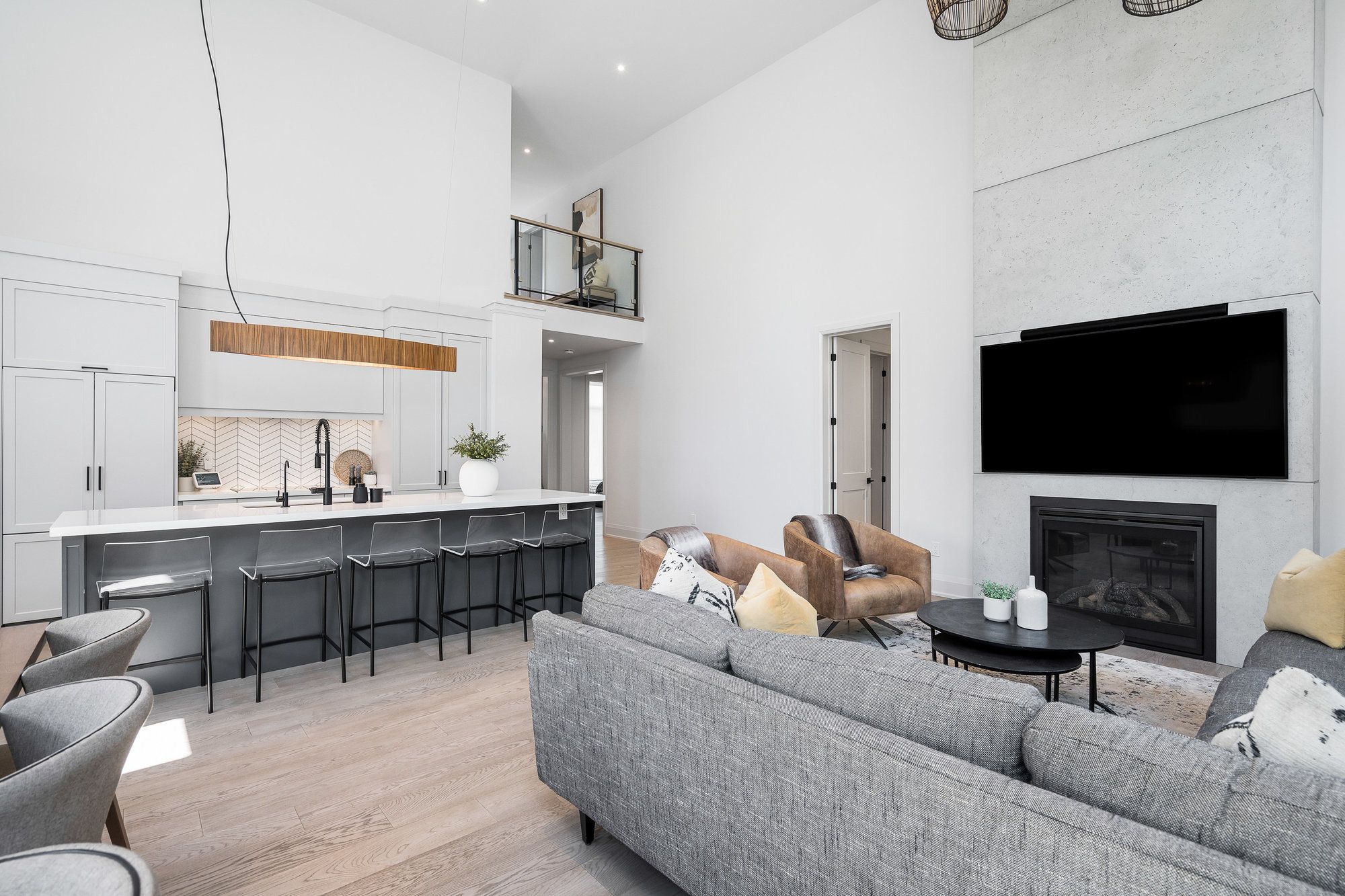 • Open concept kitchen and dining area with tall ceilings and fireplace.