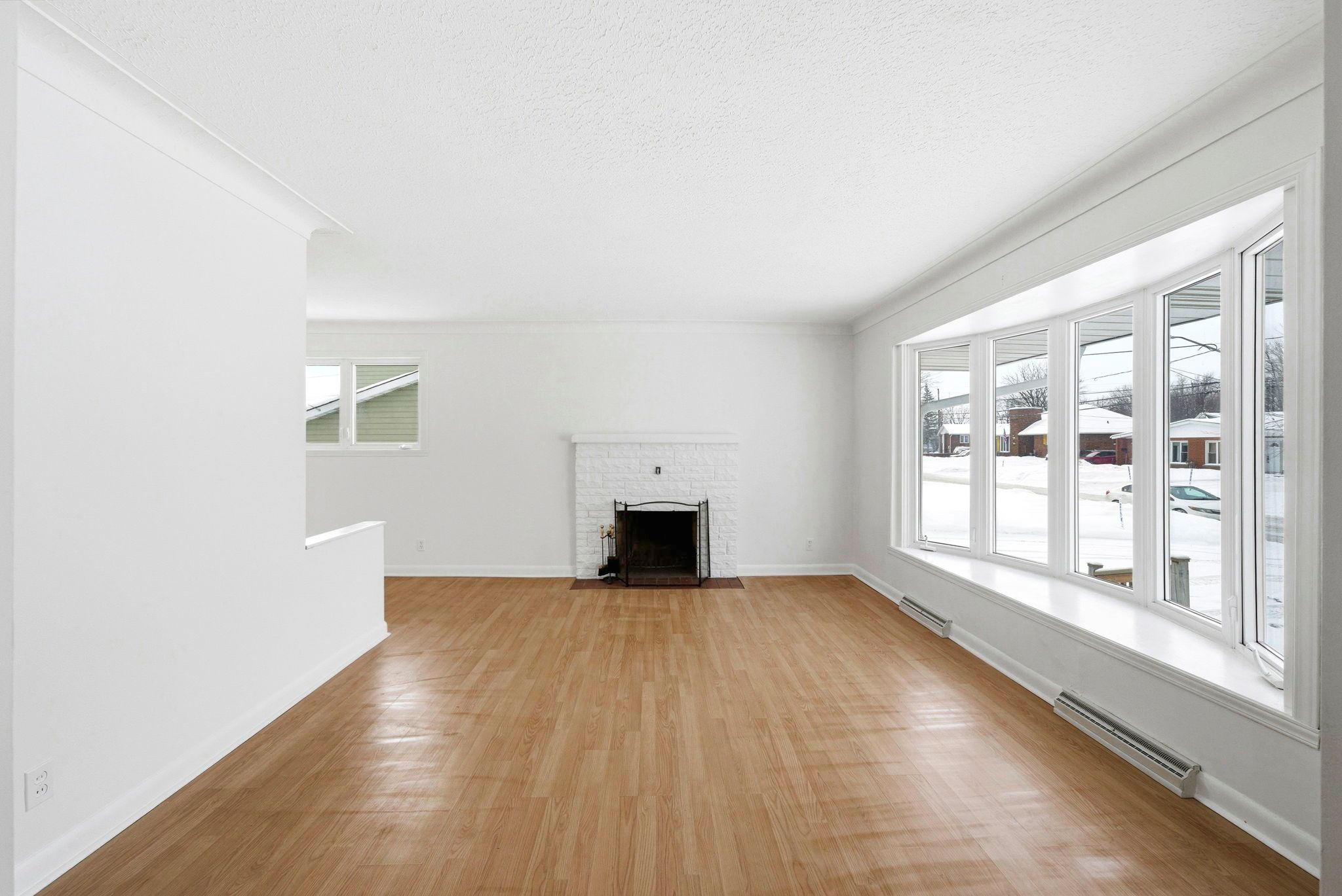 • Large living room featuring a bay window and wood-burning fireplace.